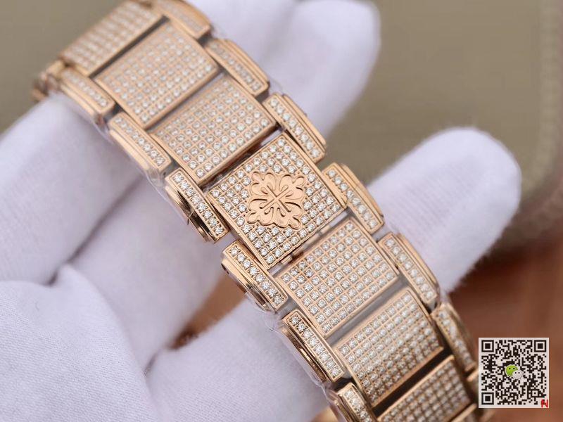 - R8 factory Replica Patek Philippe Nautilus Jumbo 5711 Tourbillon full diamond watch has unique and full of charm design, and it is the sublimation work which presenting perfect workmanship, and it is a symbol of successful person. Patek Philippe Nautilus Jumbo 5711 Tourbillon is equipped with Swiss manual winding tourbillon movement that is durable and run time preciously and stablely. And diameter is 40mm and thickness is 11mm which is suitable for people who has different wrist size. This Patek Philippe Nautilus Jumbo 5711 Tourbillon use 18K yellow gold plated rhinestone, sapphire double-side crystal mirror, 50 meters depth waterproof, and superstrong nightlight. Patek Philippe Nautilus Jumbo 5711 Tourbillon adopt 316L stainless steel plating 18K yellow gold and inlaid rhinestone watch case, that is never fading.