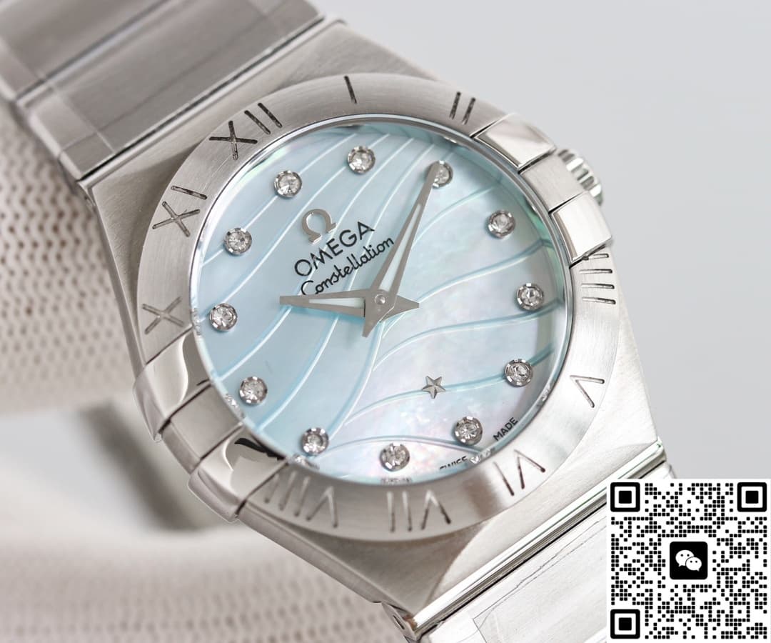 The diamonds are really eye-catching too. The 32 stones set into the bezel use a four-prong setting. The prongs are made deliberately thin, which makes the diamonds look even bigger visually. 3S Factory uses top-grade cubic zirconia here, so the fire and sparkle are plenty. The ice-blue mother-of-pearl dial is softly colored, perfect for women who prefer an elegant, clean style. 3S Factory uses a 0.4mm thin slice bonded to a brass base. They use three dots of adhesive on the back for positioning, to avoid warping from heat or cold. Horizontal wave patterns are then pressed onto the mother-of-pearl. You can see them clearly from the side, but they’re almost invisible when looking straight on. The Omega logo at 12 o’clock and the “Constellation” text below are all made using CNC-carved copper molds and hot-stamping. The 12 diamond hour markers aren’t just glued on either. First, they mill 12 small slots into the dial, then set in rhodium-plated copper holders, and finally press the stone into the holder. This ensures they won’t accidentally fall off during daily wear.