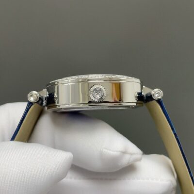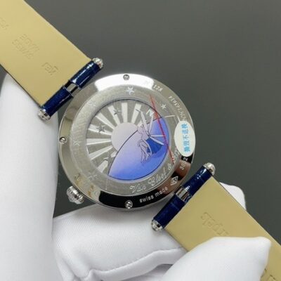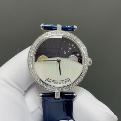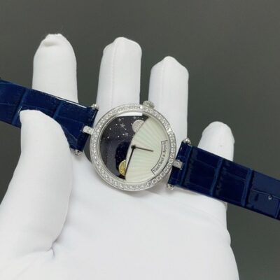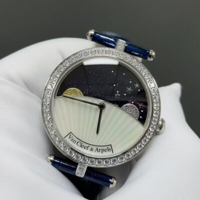 The dial of this Van Cleef moon phase watch is made from rotating blue aventurine glass and mother-of-pearl. The shimmering blue dial and the clean white dial create a strong color contrast—like night and day. With no hour markers, the dial is all about artistic charm. It’s not just a tool for telling time, but more like an expression of personality. The silver hands are simple and premium, with smooth, polished edges. The moon phase display on the dial shows the sun and moon rising and setting, letting you feel the gentle flow of time. Both the silver moon and golden sun are set with diamonds in matching colors, giving a sparkling, glittering effect. The whole dial is gorgeous and looks very elegant on the wrist. Since its release, it has caught the attention of many watch lovers.