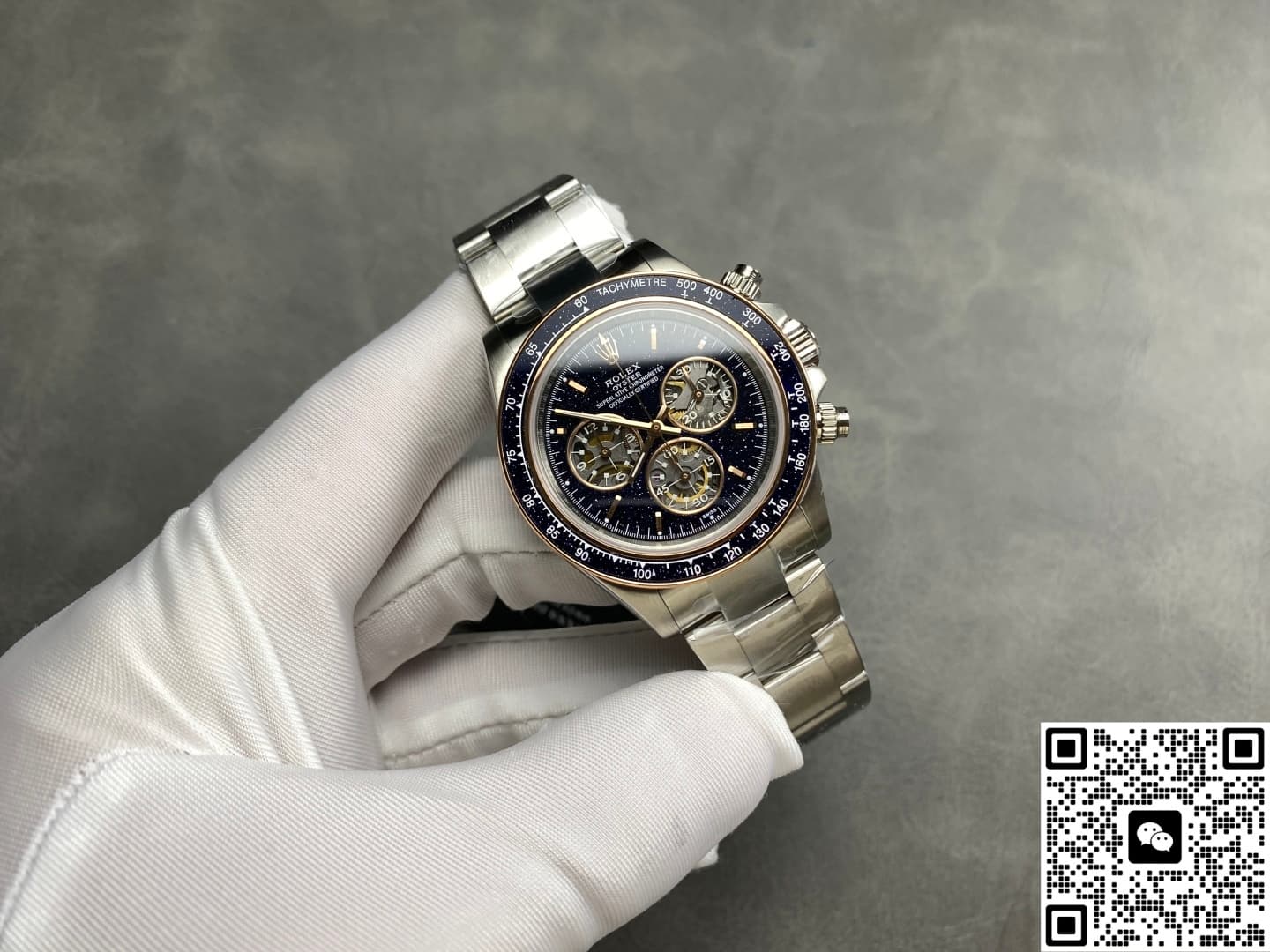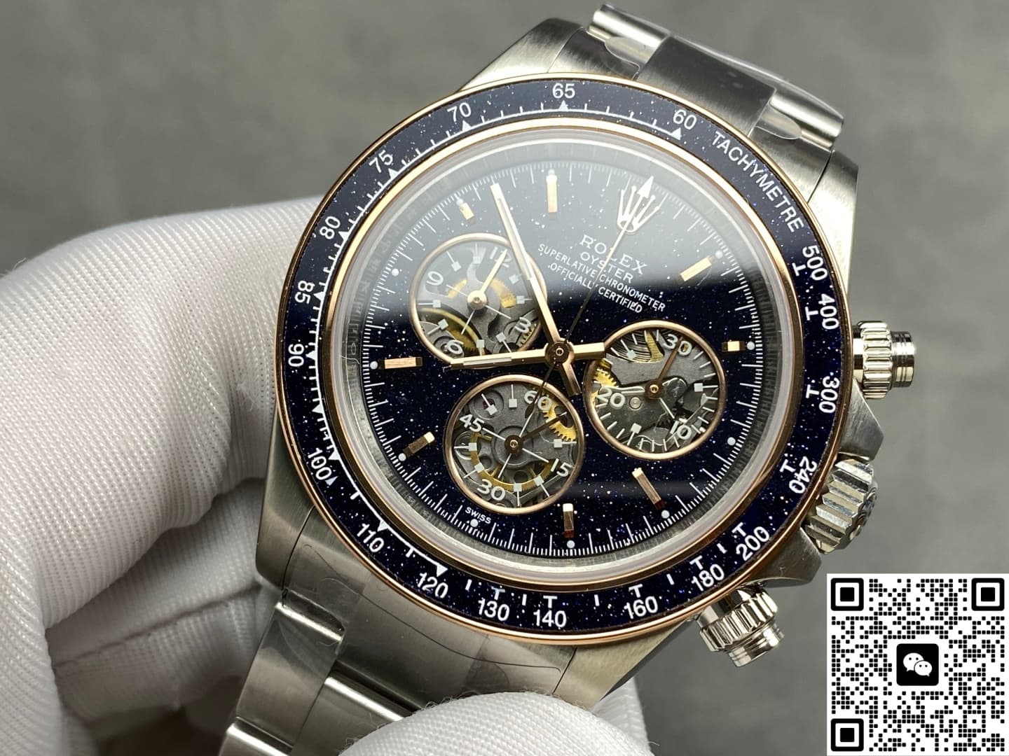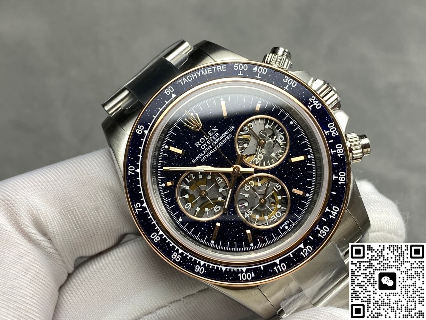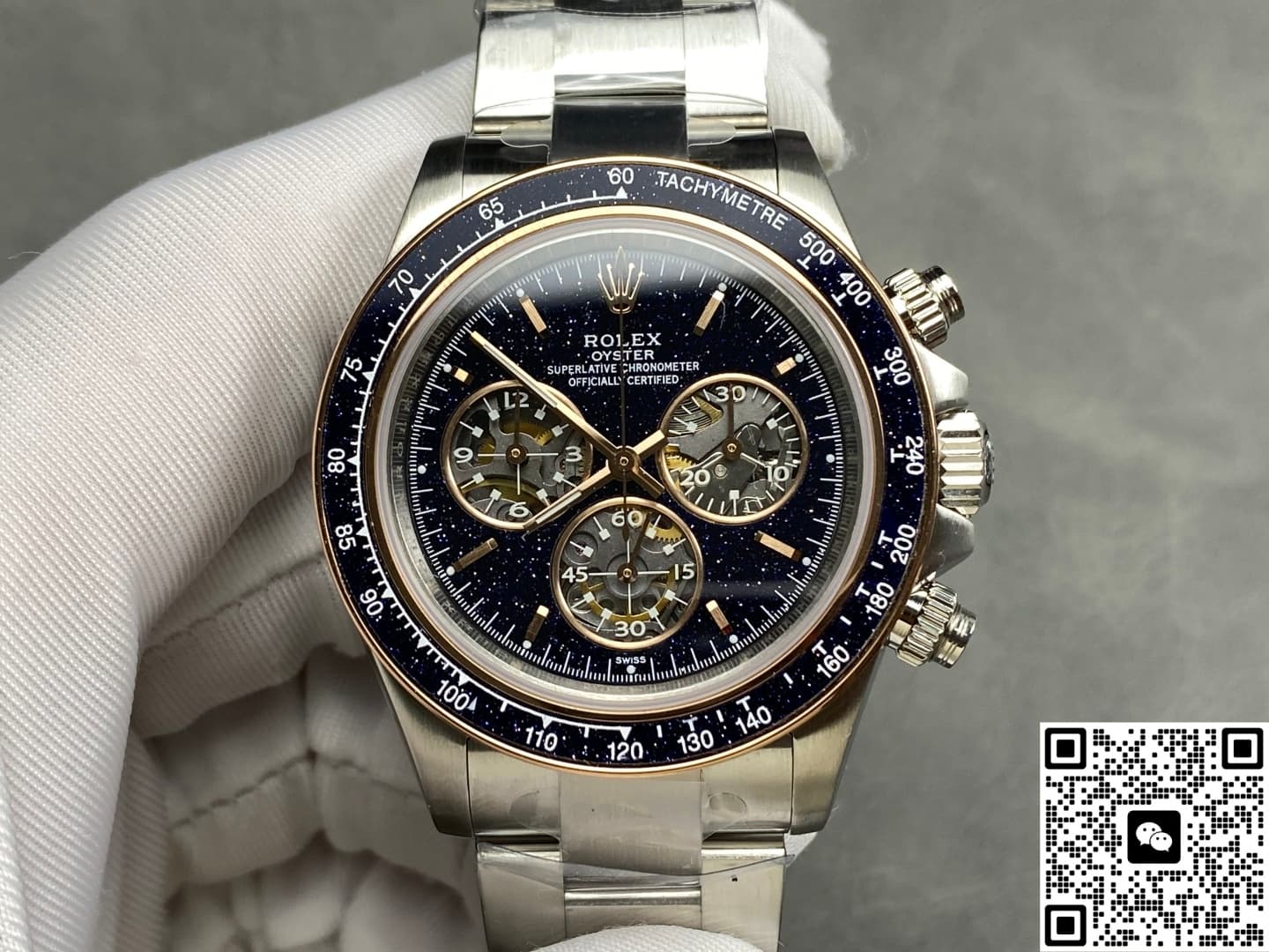 So how is this romantic starry sky made? ADG Factory uses artificially fired glass containing copper particles for this Rolex Daytona Ventura. After high-temperature treatment, it forms a natural crystalline effect. Under light, the blue aventurine shows a deep night-sky texture, dotted with white specks—mysterious and noble in overall appearance. Compared with natural aventurine, the artificial version offers better color control and consistency, making it very suitable for batch production.