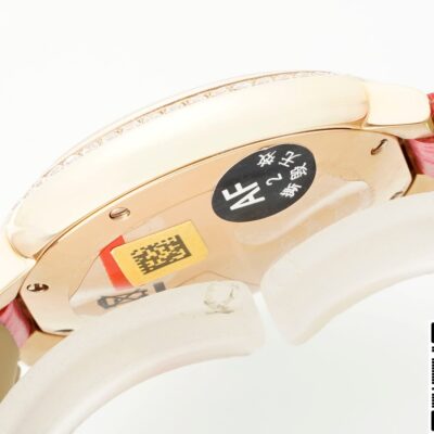 The hands are rose gold sword-shaped, matching the case. They’re brushed on top, polished on the sides. AF Factory made the edges slightly curved, reducing the sense of metal thickness and letting the hand surface flash a thin line now and then when it moves. Many worry that no date and no second hand might make it feel stiff, but when you actually wear it, you find this minimalism actually maximizes the Ballon Bleu’s most iconic floating sensation. The crystal uses a curved sapphire, slightly domed in the center, compressed at the edges to create a very fine fisheye distortion. AF Factory kept this distortion within 10% of the genuine version’s level, preserving the vintage feel without distorting your view. Both sides of the crystal have anti-reflective coating, but they deliberately left a very faint blue-purple haze. Under direct sunlight, the gem sparkle actually becomes more concentrated. The watch comes with a pink crocodile leather strap, perfectly matching the romantic feel of the Qixi limited edition, and it’s also breathable for summer wear.