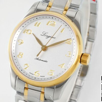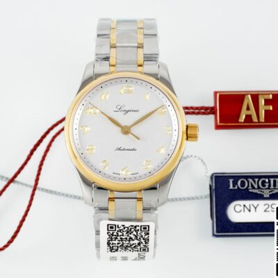 Today I’ve got this Langines Master collection watch, model L2.357.5.72.7, from AF Factory. AF Factory is one of the best makers out there for Langines replica watches, especially for the Master and Heritage series. Unlike some factories that make all kinds of brand watches, AF Factory focuses mainly on a few popular Langines series. That’s why their watches have better details and are closer to the original. When I first saw this watch, I was really impressed by its quality. The two-tone bracelet with the silver-white dial gives off an elegant and classy vibe. It’s a ladies’ watch, 34mm in size, which is just right. It’s perfect for daily wear, like for going to work every day. The watch is very thin, so it doesn’t feel heavy on the wrist, and it’s really comfortable to wear. Let’s take a closer look at how this AF Factory watch performs.