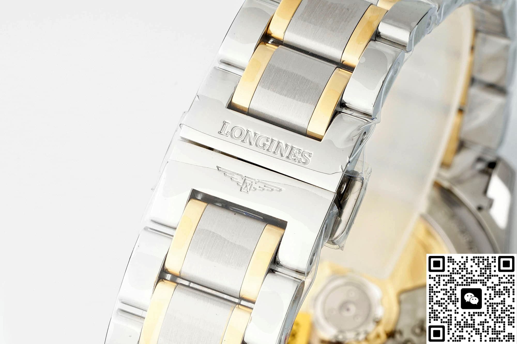 The golden stainless steel bezel is polished. When light hits it, it gives off a beautiful shine. The crown is well made, and the edges of the gears don’t feel sharp when you touch it. The case has clear brushing, and it feels smooth to the touch. The two-tone bracelet is beautiful, with a mix of polished and brushed finishes. The links are cleanly finished with no rough edges. The clasp is made of stainless steel, and the logo and text on it are deeply engraved with a nice 3D effect. The case back has a see-through design, so you can see the movement inside, which makes the watch more interesting to look at. Overall, from the outside, this AF Factory Langines watch is very close to the original. They paid a lot of attention to the details, so I’d say it’s a very successful replica watch.