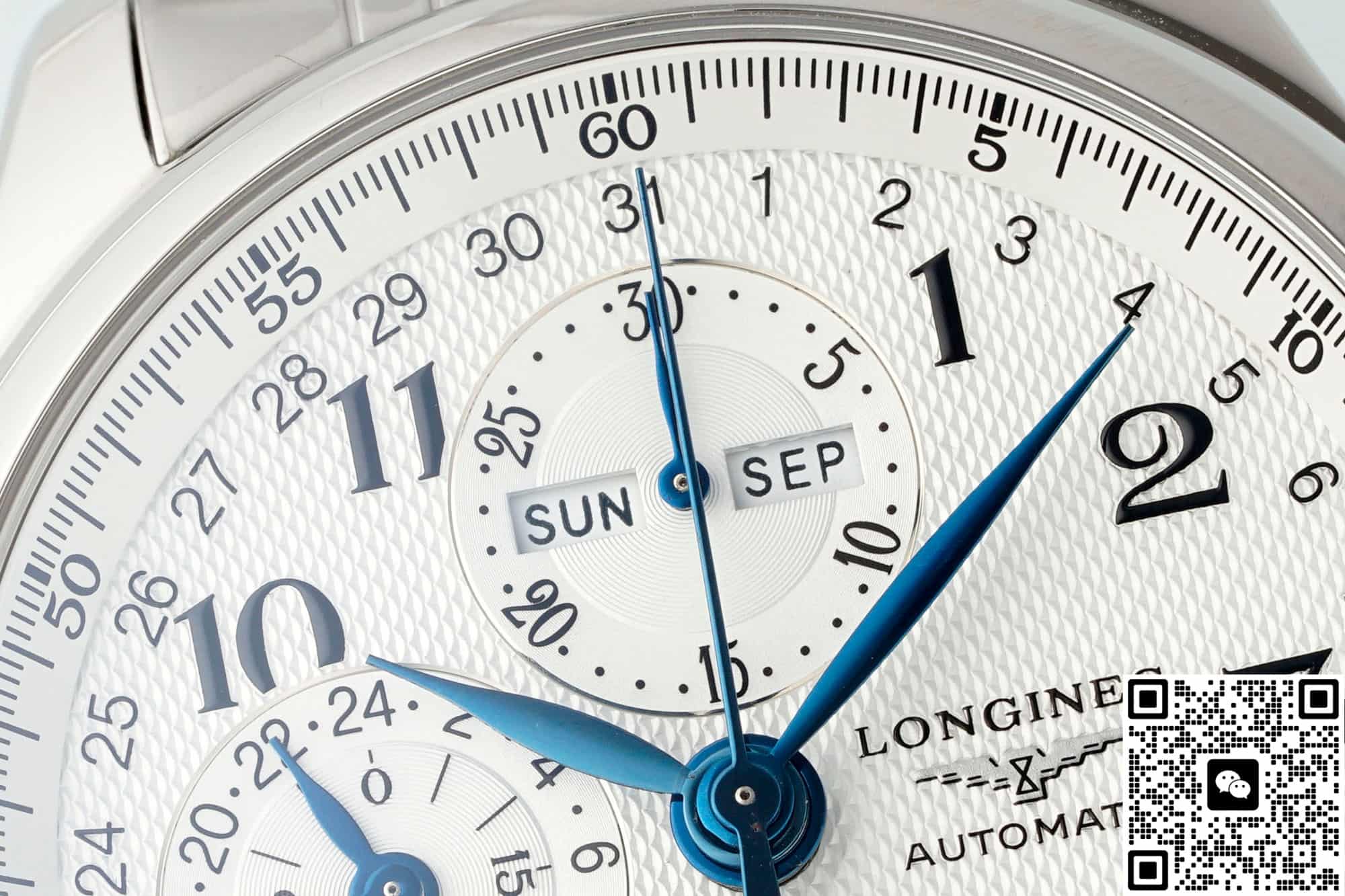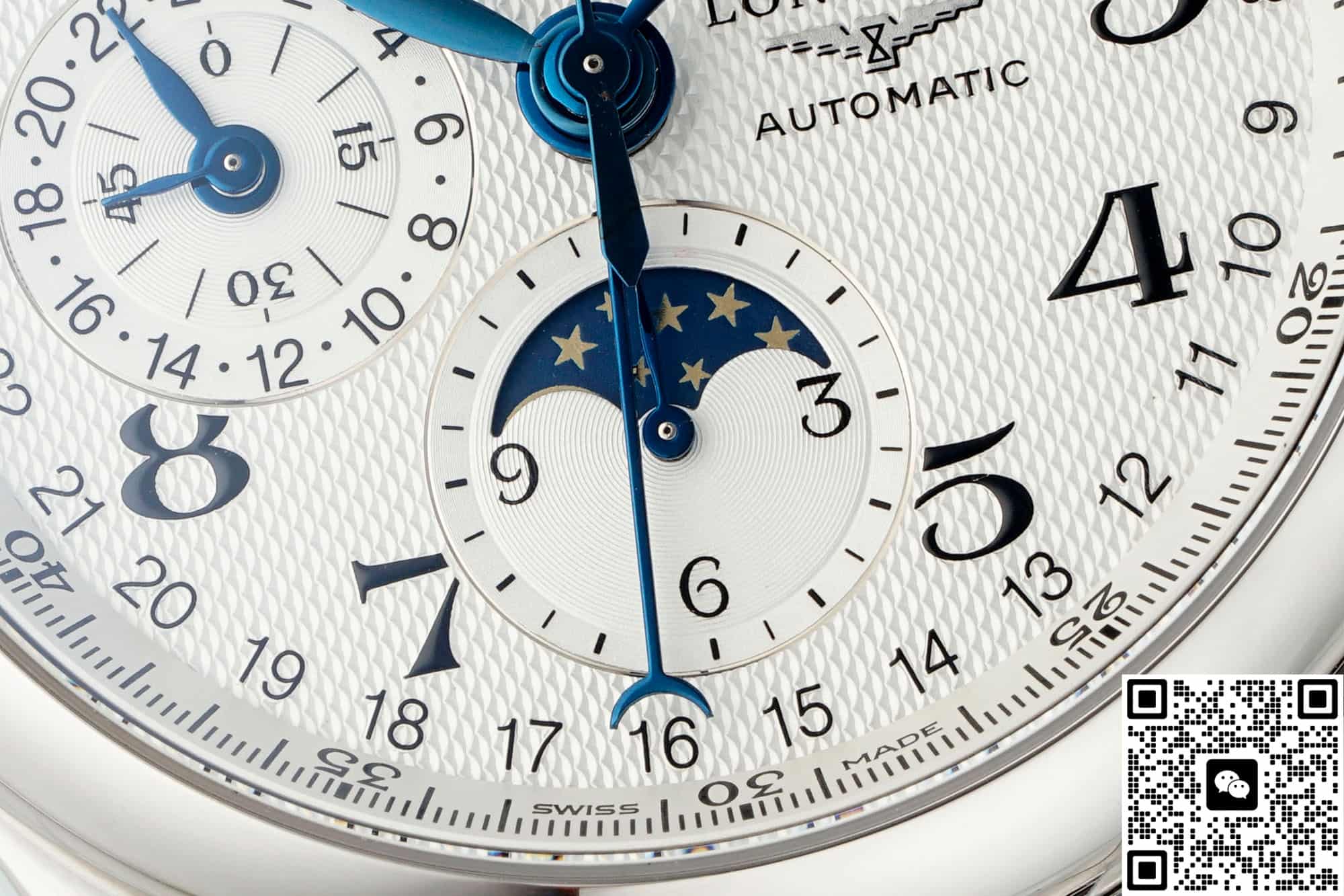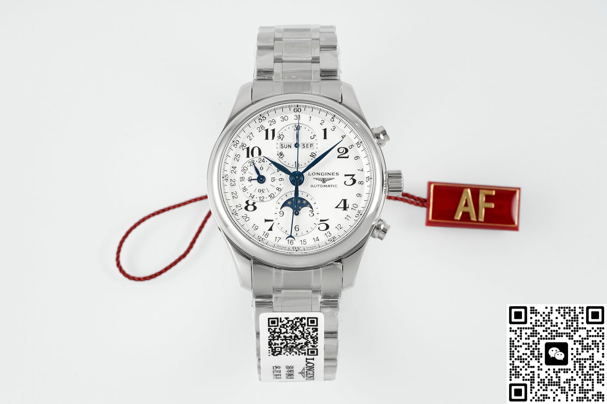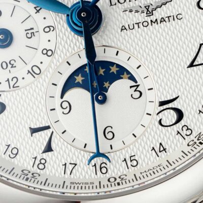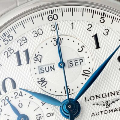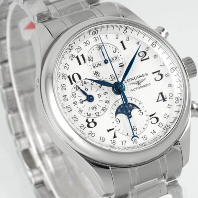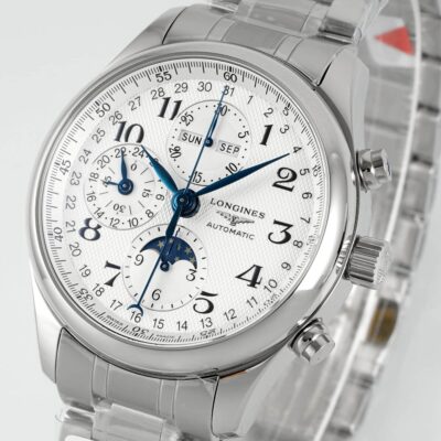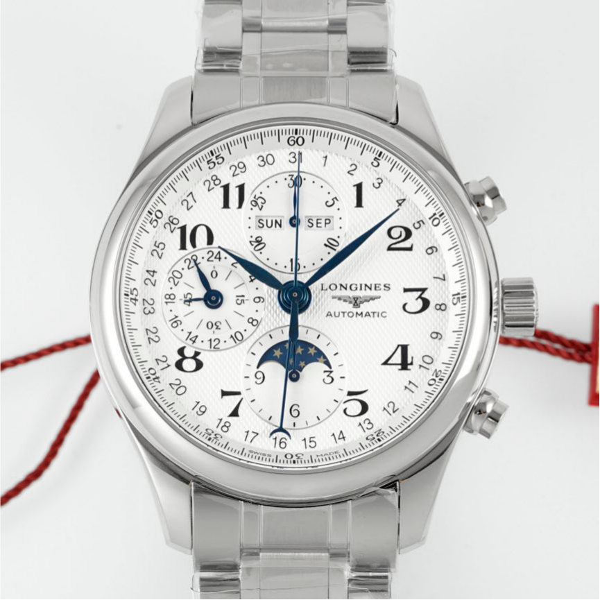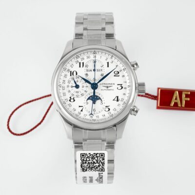 Move the camera close to the dial. The silver-white barleycorn pattern shows fine, shimmering ripples. Eight blued steel hands float above it. The Longines winged hourglass logo sits quietly next to the 3 o’clock position, reminding you this is a dress watch born for elegance. But secretly, it packs a moonphase, a complete calendar, and a chronograph all into a 42mm round case. Yes, this is the AF Factory Longines Master L2.773.4.78.6 high-value replica watch. The price is only a fraction of the genuine one, but it delivers a perfect dress watch experience.