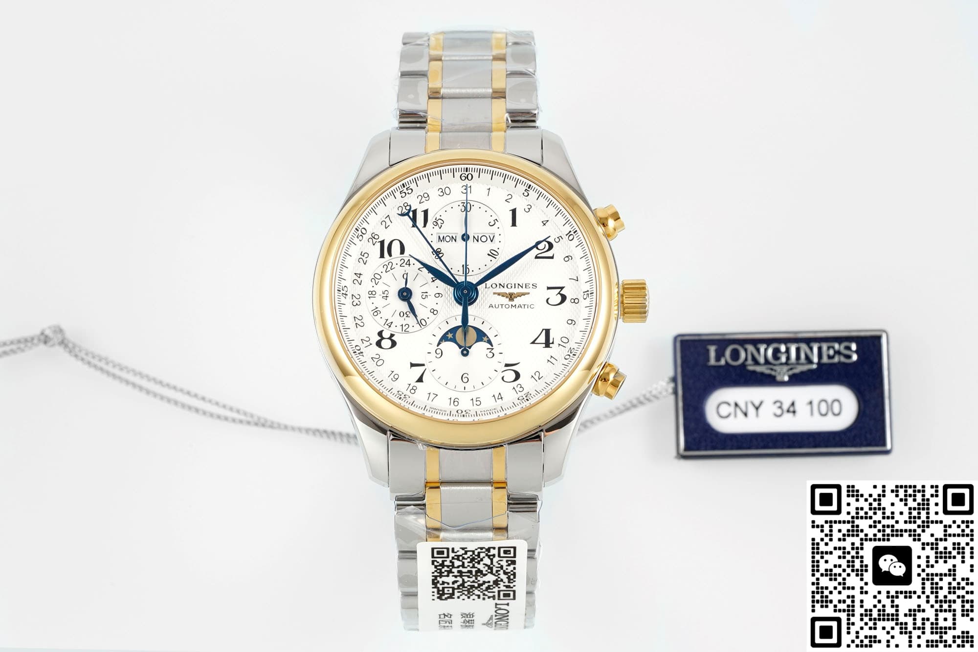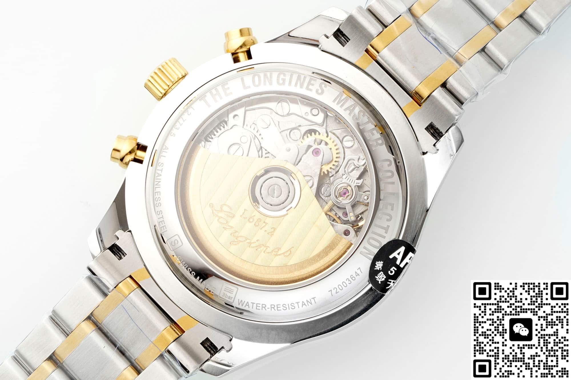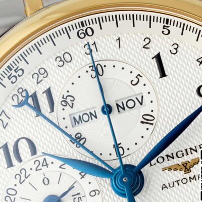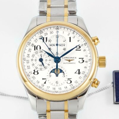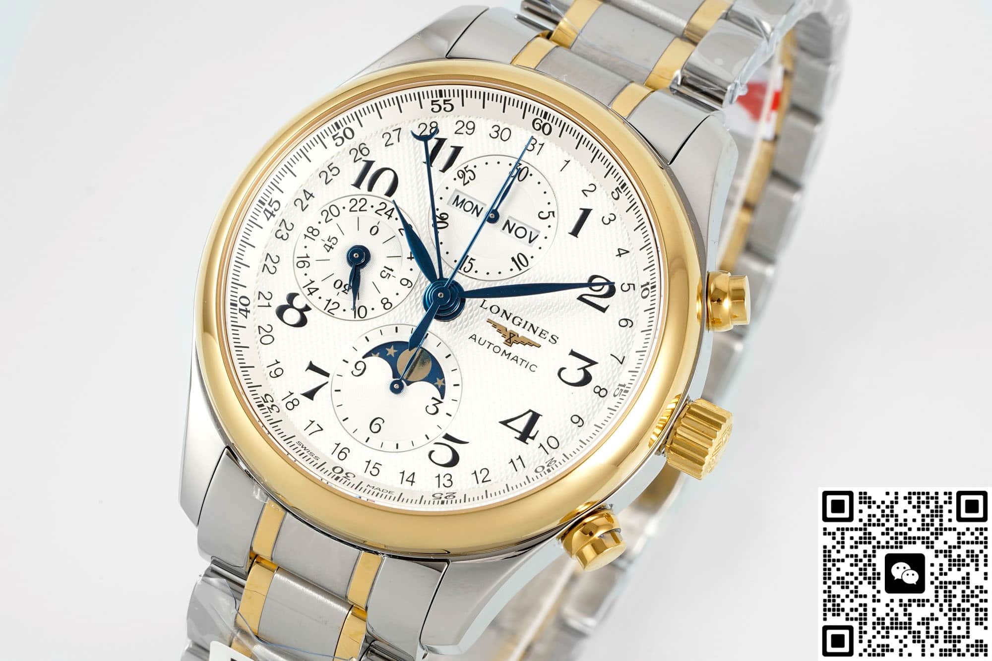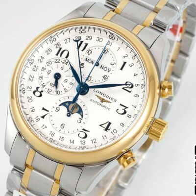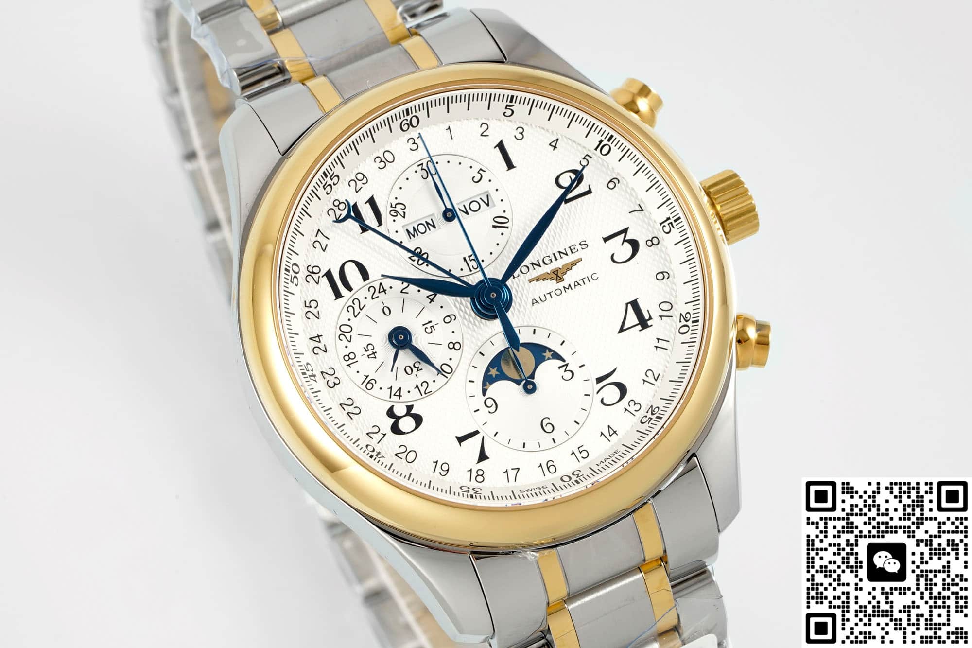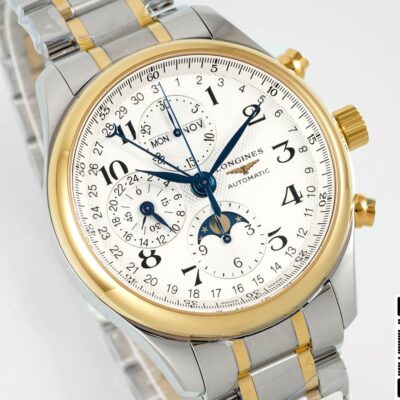 Dress watches with complicated functions always hold a special place. The AF Factory Longines Master L2.773.5.78.8 replica watch with moon phase and eight hands is one model that gets talked about a lot. The silver-white barley-grain dial, two-tone case, and those eight blued steel hands layered together, plus the instantly recognizable moon phase and calendar windows – whether it’s at a business meeting or a wedding, it grabs people’s attention right away.