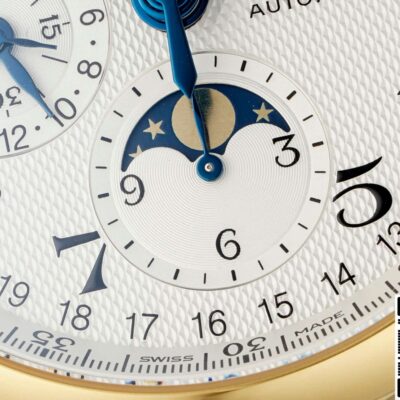 What makes the eight-hand moon phase so captivating is how it packs all that information onto a small dial but still keeps it easy to read. The minute and hour hands use traditional bluing, giving them a deep, almost black-blue color. Against the silver-white dial, the contrast is strong, so even in dim light at night, you can tell the time quickly. The two-tone bracelet is another strong point of this high-quality replica watch. The links use three different finishing techniques. The middle two rows of gold-plated links are mirror-polished, while the side links are brushed, creating rich light and shadow play. The clasp uses a double-push-button release. Just press the buttons on both sides to open it, making it effortless to take off. The lugs use quick-release spring bars, so you can swap to a leather strap by hand, no tools needed. For anyone wanting to switch styles for different occasions, this detail is a big plus. Wear the steel bracelet in summer for breathability, then switch to a dark brown crocodile-print leather strap in winter to instantly turn into a vintage gentleman. One watch easily fits two different styles.