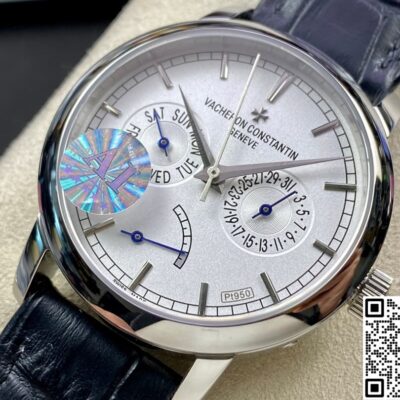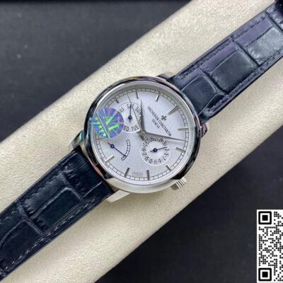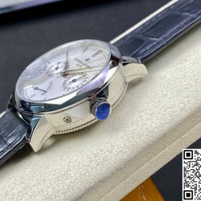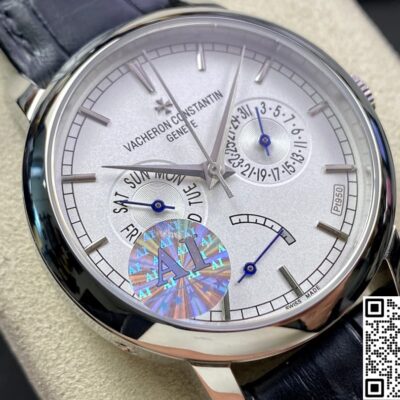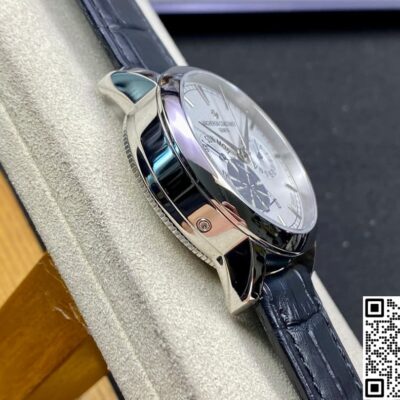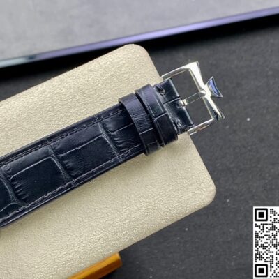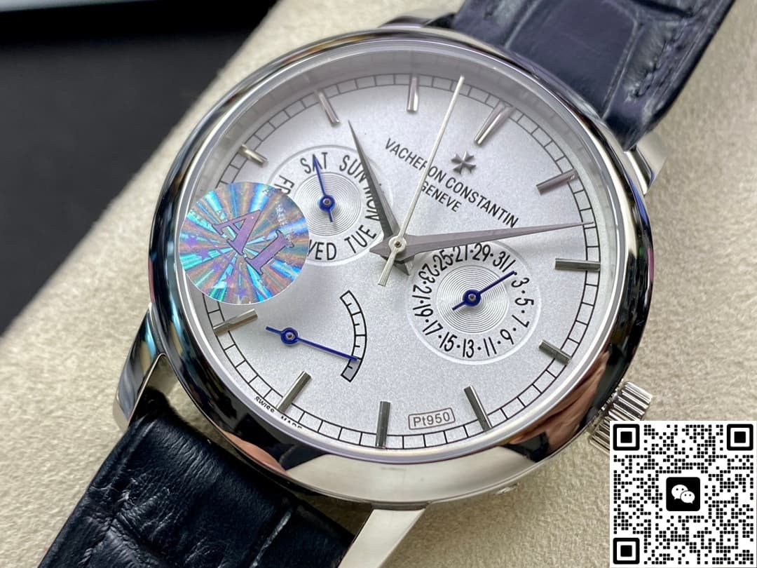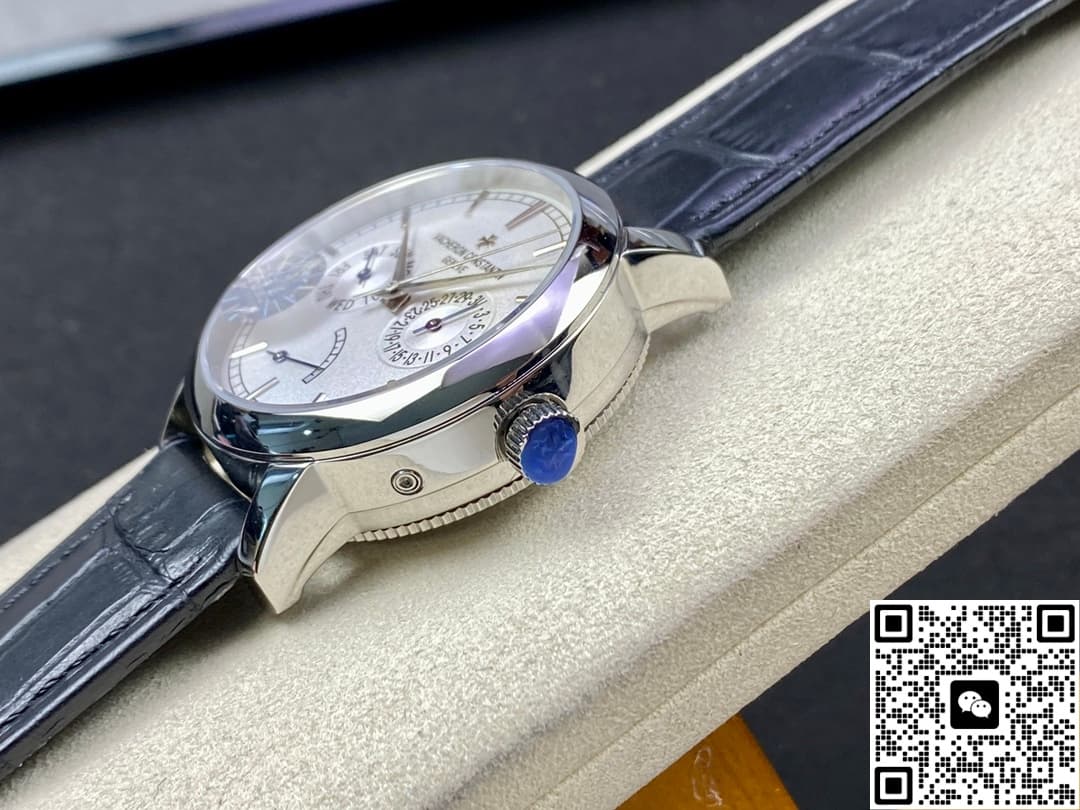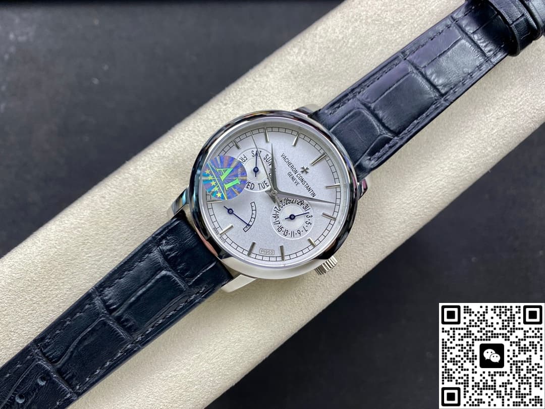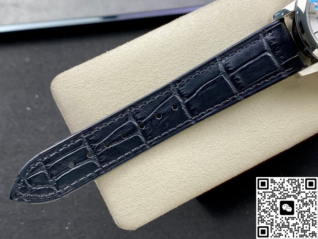 Today, let’s talk about this replica watch from AI Factory – the Vacheron Constantin Traditionnelle series 85290-000P-9947. It’s a very classic white dial, paired with a blue leather strap. It looks really elegant and refined. The overall design of the watch face is very simple and stylish. But the display functions are very complete. Besides telling time, it also has day, date, and power reserve display functions. For daily commuting office workers, this is very practical. The 39.5mm case diameter is not only suitable for men, but women can also wear it easily. Next, I will introduce it in detail from a few different angles.
