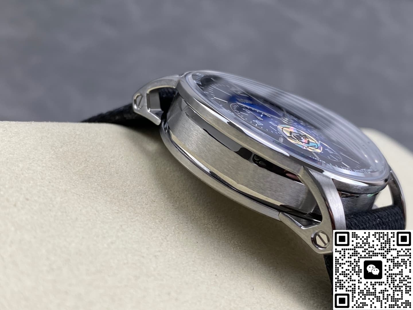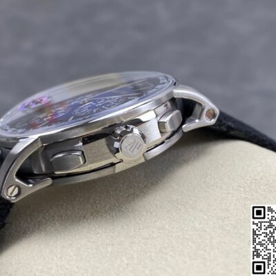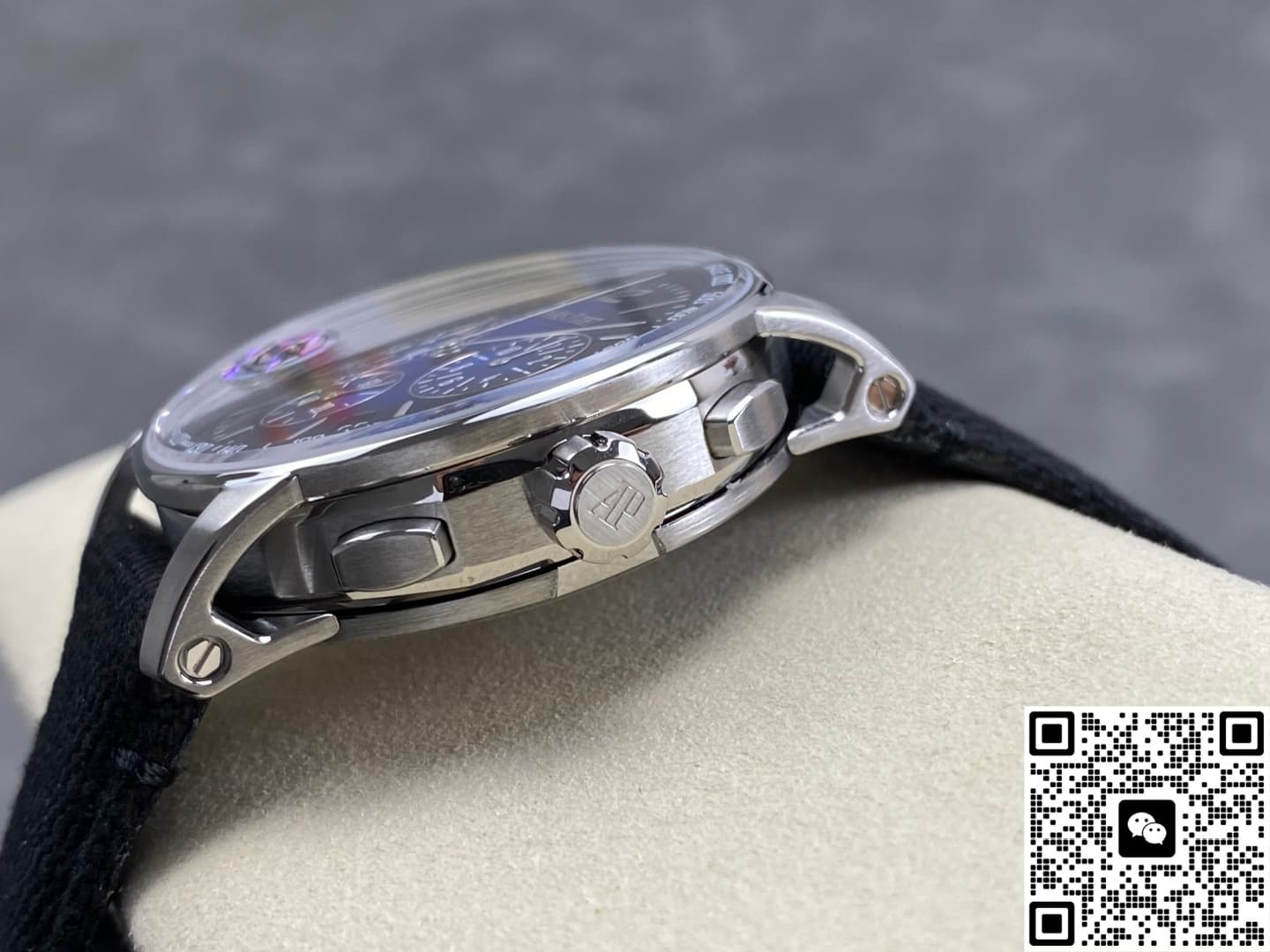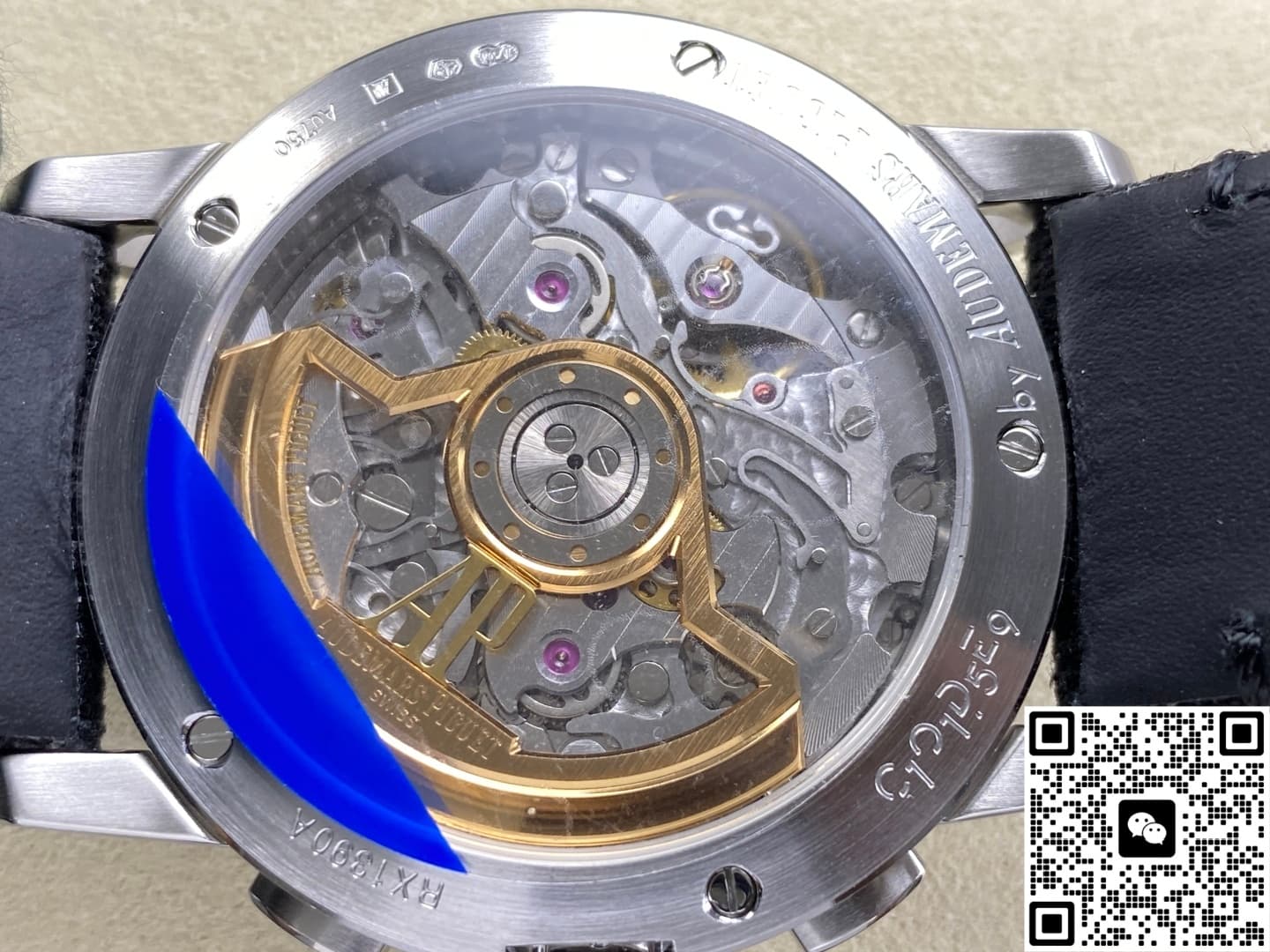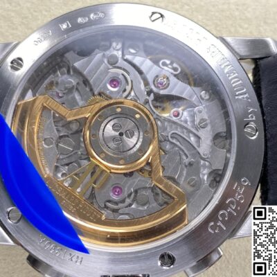 For this Audemars Piguet replica watch, they use the 4401 integrated movement. Right now, it’s the only one-piece clone movement with a real vertical clutch, real column wheel, and real flyback function. It uses the classic combo of column wheel and vertical clutch. This truly makes the chronograph start without the second hand shaking, and it resets cleanly in an instant. The flyback also lets you start a new timing immediately without stopping the watch. The winding system is bidirectional automatic winding. The rotor’s outer edge is skeletonized. When it spins, it forms a small golden ring. You can see it constantly changing angle through the sapphire case back. The Geneva stripes on the bridges and the pearl pattern on the main plate appear alternately. The screws are heat-blued first, showing as dark blue accents against the silvery metal background. The whole color tone is cool and restrained. Also, because the movement’s thickness and diameter match the original, the case isn’t bulky. The side profile still keeps that elegant proportion, about twelve millimeters.