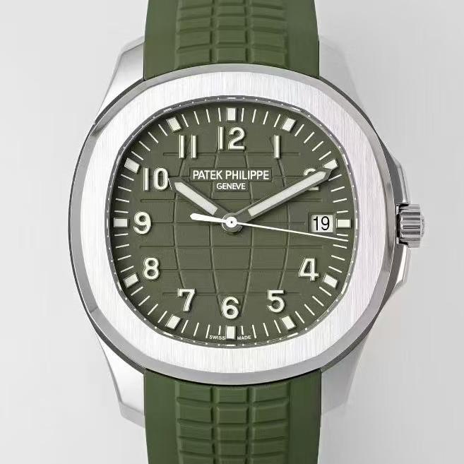 Today I’ve got this Patek Philippe Aquanaut 5168G-010 watch from APW factory. The Aquanaut series looks a bit like the Nautilus series. But the Aquanaut dial doesn’t have those “ears,” the lines are softer. The Nautilus case has obvious “ear” shapes, looks more tough. That’s one way to tell them apart. Also, the Aquanaut dial mostly uses Arabic numeral hour markers, while the Nautilus usually has stick hour markers. The most important point is, the Aquanaut strap is mostly rubber, feels more young and casual. The Nautilus often uses stainless steel or precious metal bracelets, more suitable for formal occasions. This watch comes in khaki green, you can also call it avocado green. At first glance it looks fresh, gives a spring vibe. Wears really nicely on the wrist. The whole watch feels high quality. Now let’s check out the details and finishing of this Patek Philippe replica watch.