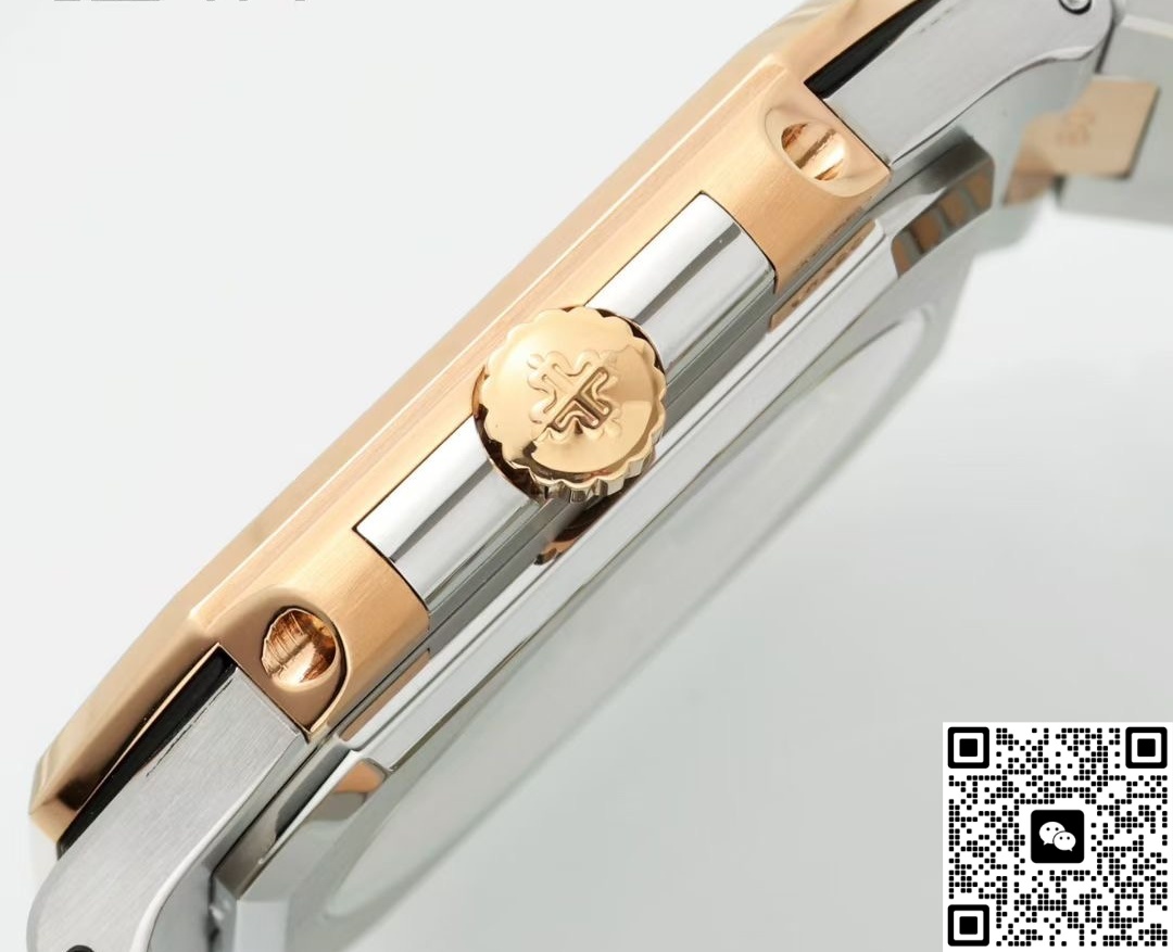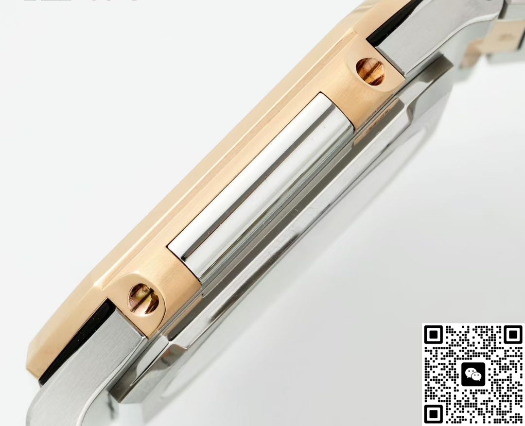 The rose gold case has a very clear brushed finish on the front—it feels premium. The sides of the case are cleanly sculpted with sharp lines. This watch comes with a two-tone bracelet. The gold parts in the middle are polished, so they’re shiny, while the other sections have a matte finish. The edges of each link are smooth, so it doesn’t feel rough on the wrist. I think APW factory nailed this detail—it’s very close to the original. The bracelet bends easily and fits the wrist comfortably, so it’s really nice to wear. Also, the case is pretty thin, so it won’t get caught on your sleeve.