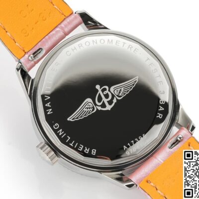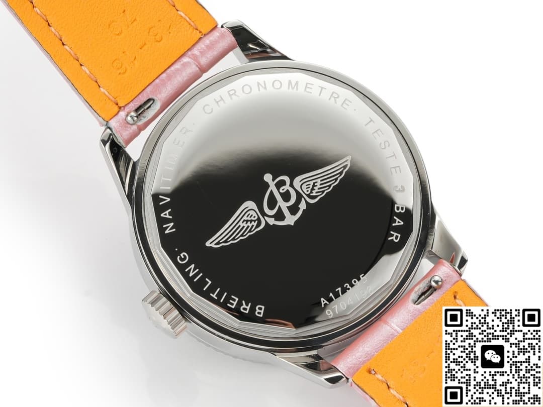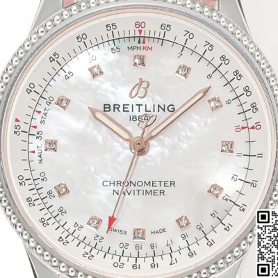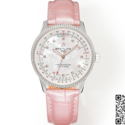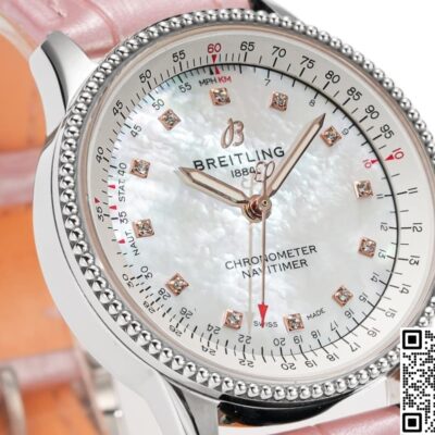 At first glance, this BLS factory Breitling Navitimer A17395211A1P3 replica watch is really exquisite and beautiful. Whether you’re wearing it for work or on a date, it instantly boosts your style. The pink leather strap looks very gentle, high-end, and helps brighten the skin tone. The mother-of-pearl dial shows a delicate shine under different lights, giving off an elegant and luxurious feel. The diamond hour markers add a touch of sparkle to the dial. Wearing it feels both refined and premium. I believe no woman could resist a watch like this. Now, let’s take a closer look at its review.