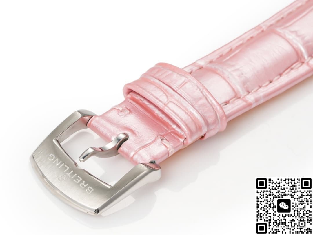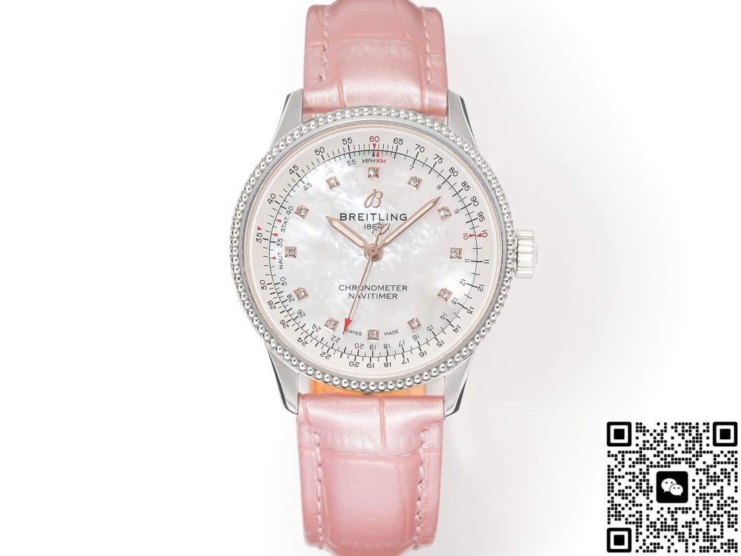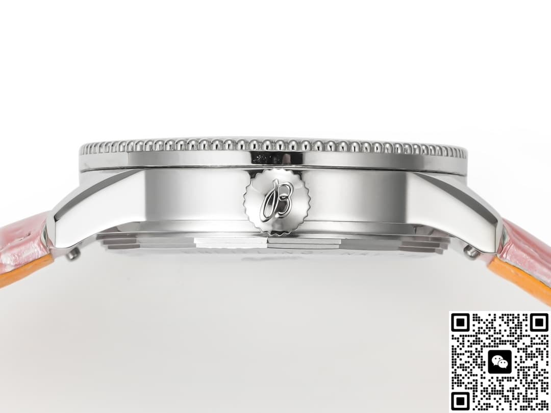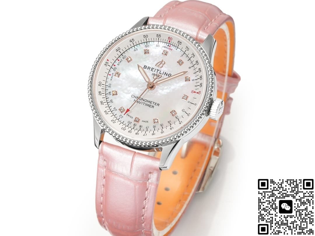 At first glance, this BLS factory Breitling Navitimer A17395211A1P3 replica watch is really exquisite and beautiful. Whether you’re wearing it for work or on a date, it instantly boosts your style. The pink leather strap looks very gentle, high-end, and helps brighten the skin tone. The mother-of-pearl dial shows a delicate shine under different lights, giving off an elegant and luxurious feel. The diamond hour markers add a touch of sparkle to the dial. Wearing it feels both refined and premium. I believe no woman could resist a watch like this. Now, let’s take a closer look at its review.