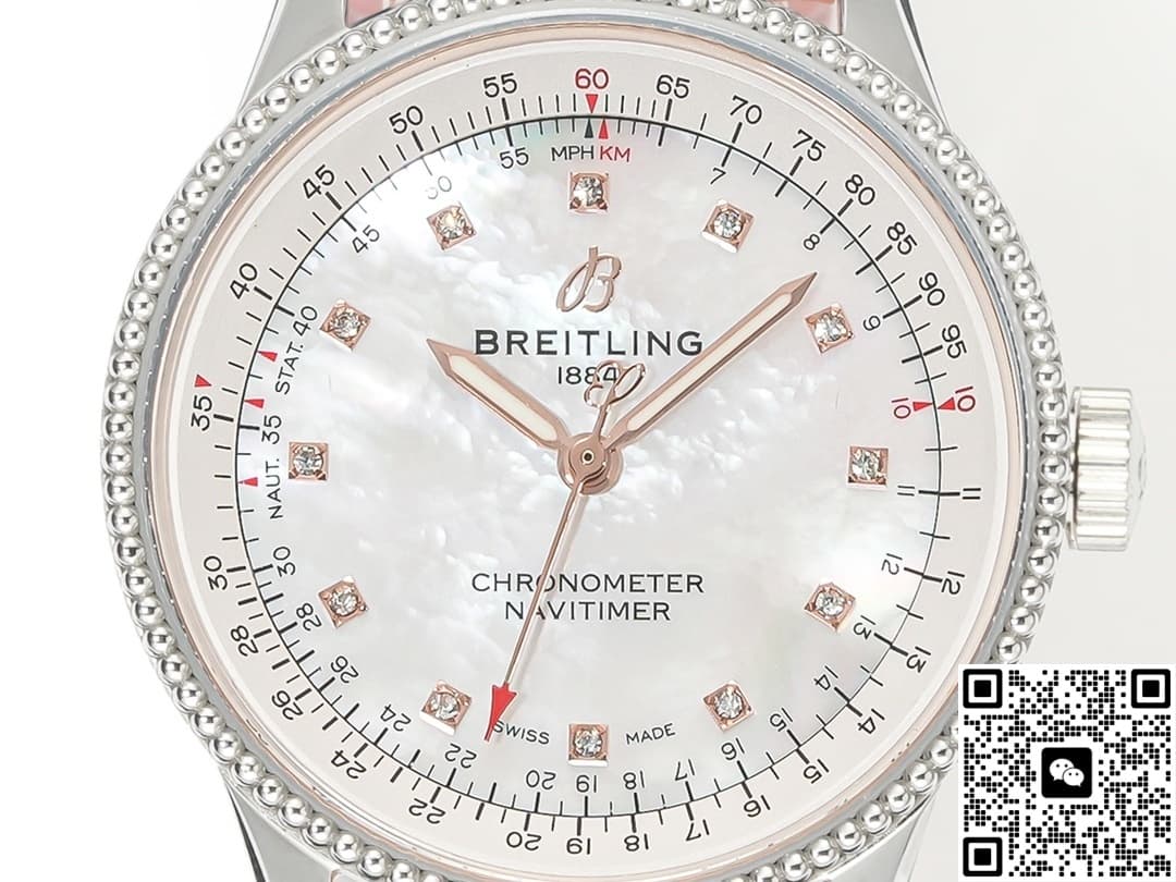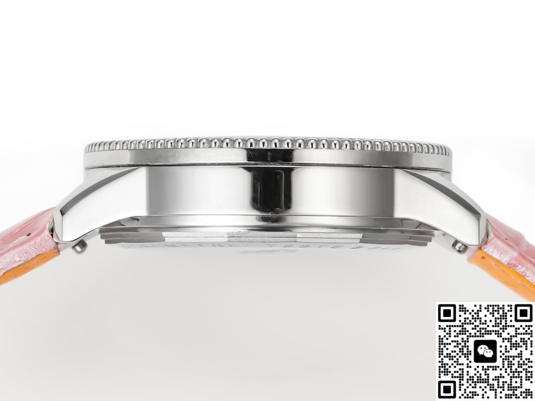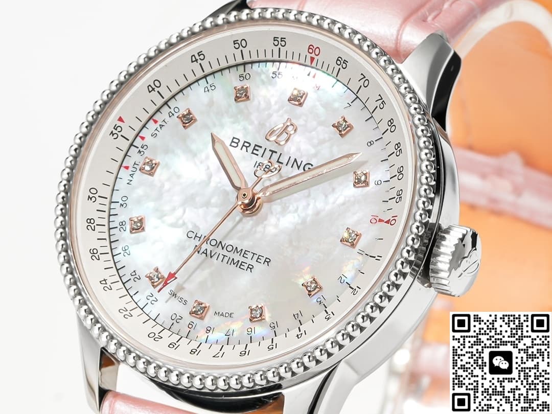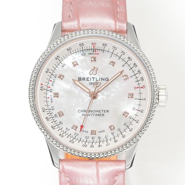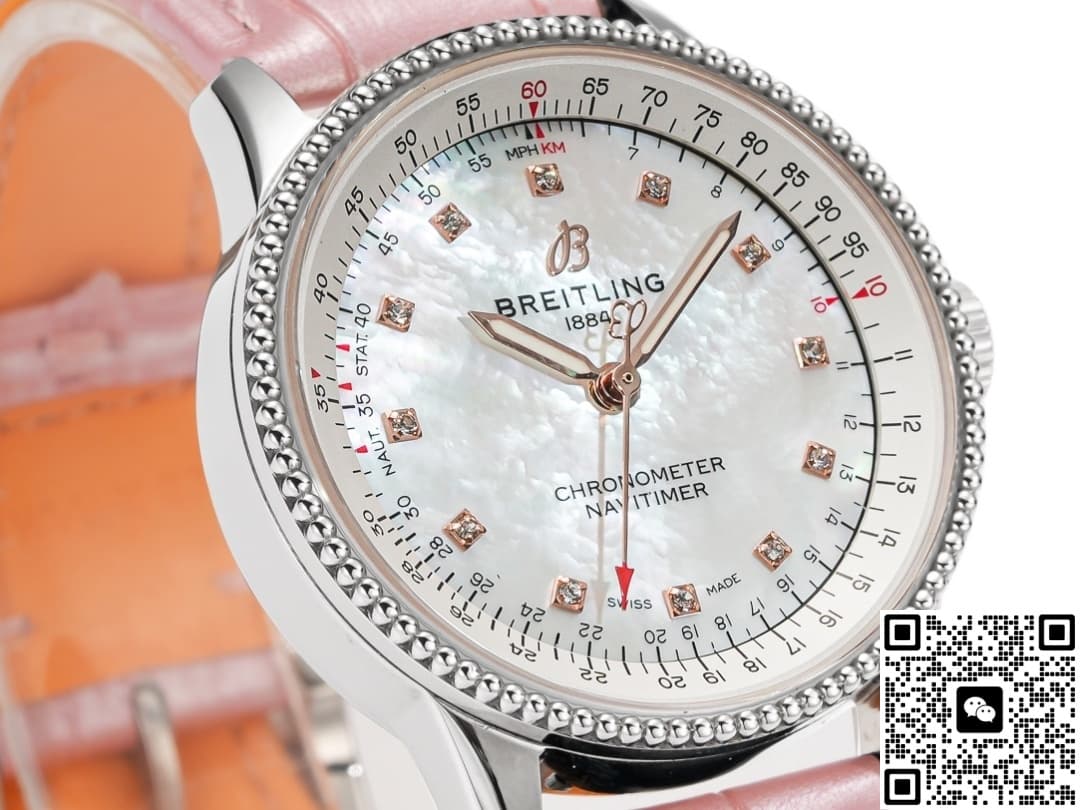 At first glance, this BLS factory Breitling Navitimer A17395211A1P3 replica watch is really exquisite and beautiful. Whether you’re wearing it for work or on a date, it instantly boosts your style. The pink leather strap looks very gentle, high-end, and helps brighten the skin tone. The mother-of-pearl dial shows a delicate shine under different lights, giving off an elegant and luxurious feel. The diamond hour markers add a touch of sparkle to the dial. Wearing it feels both refined and premium. I believe no woman could resist a watch like this. Now, let’s take a closer look at its review.