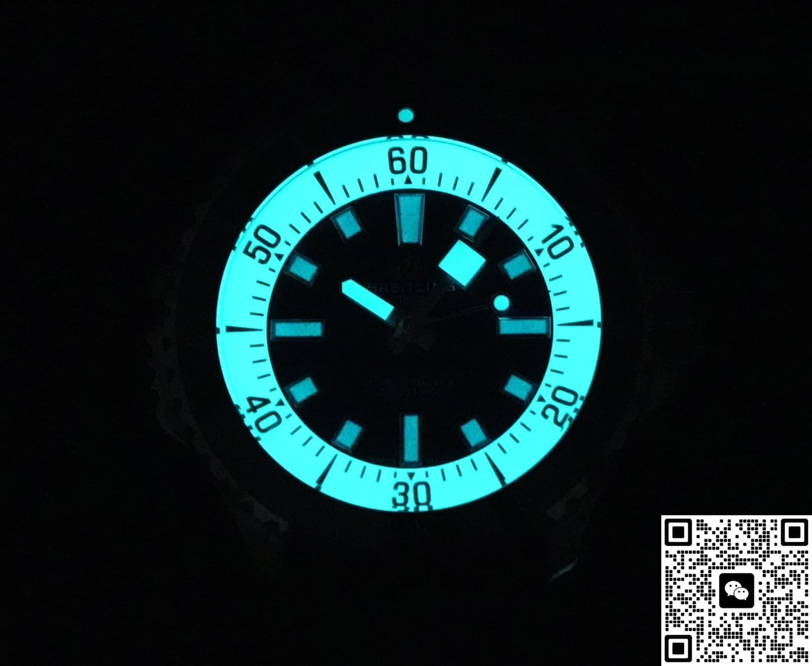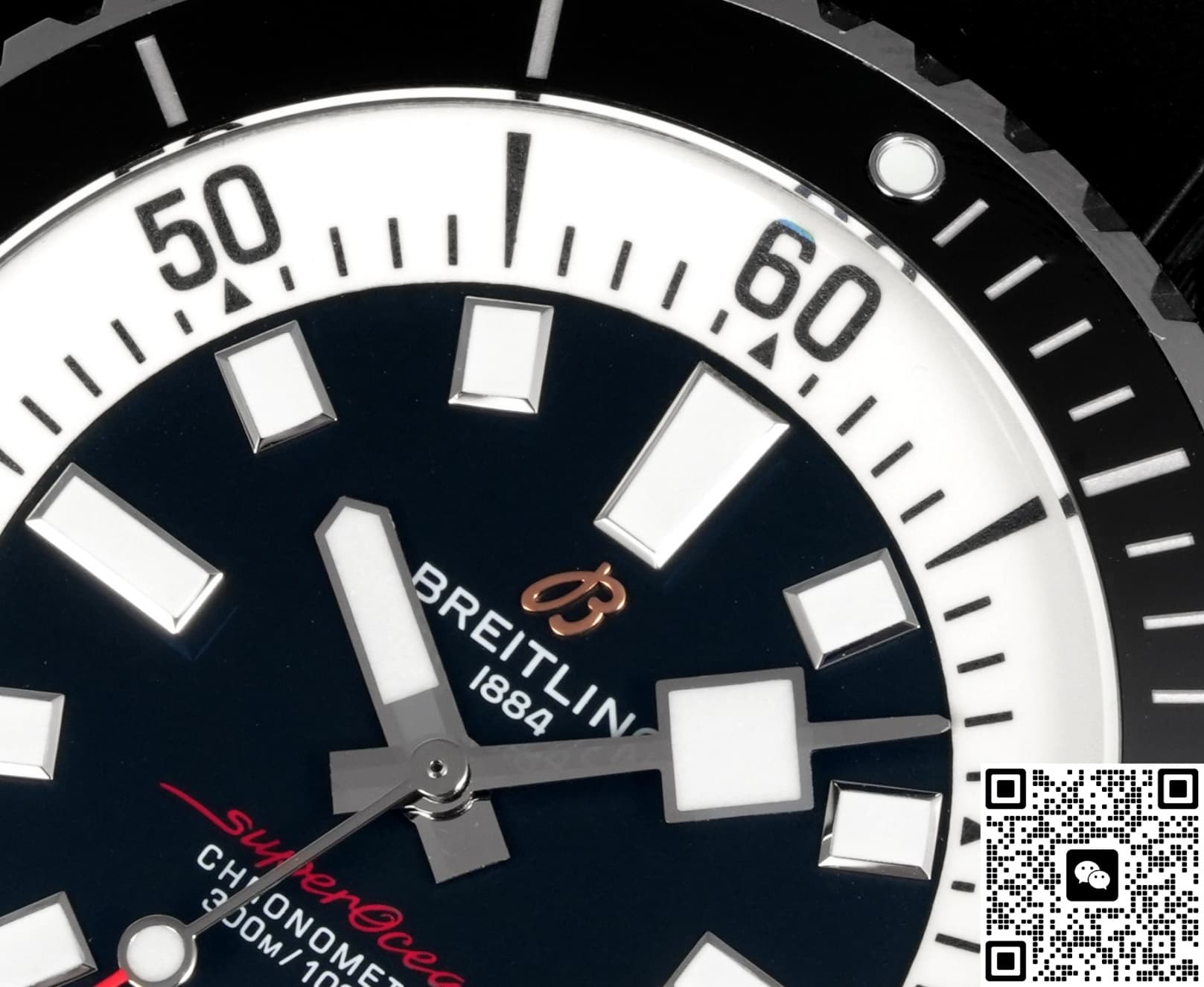 This Breitling watch perfectly copies the original dial design. A lot of care was put into details like the dial color, hour markers, and hand style. The bold, enlarged stick-shaped hour markers and hands are very eye-catching, making it easy to tell the time. The minute hand has a small rectangular detail toward the end, which is a nice touch and looks unique. The hands and markers are coated with white lume, applied evenly without any bleeding around the edges.