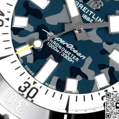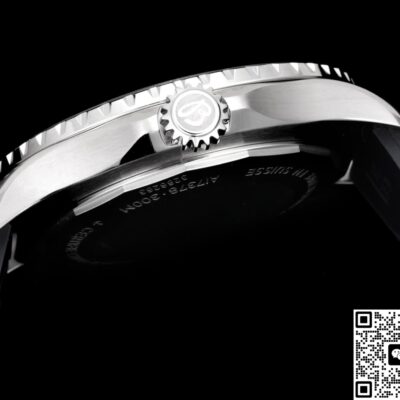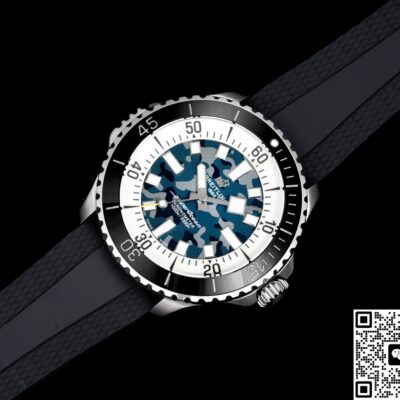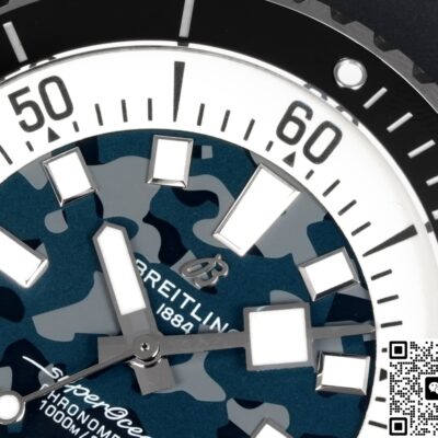 The dial of this BLS Factory Breitling ceramic replica watch isn’t plain black. It uses a black-gray camo gradient process. Through multi-layer spraying and sunburst brushing, it shows a unique cloud-like camo effect. The pattern on every dial is different, making each watch very personalized. Paired with 3D square hour markers and ice-blue lume, it’s recognizable yet low-key during the day. At night, the lume glows brightly so you can read the time easily. For replica dive watch fans who like strong lume, this design is both practical and visually striking.