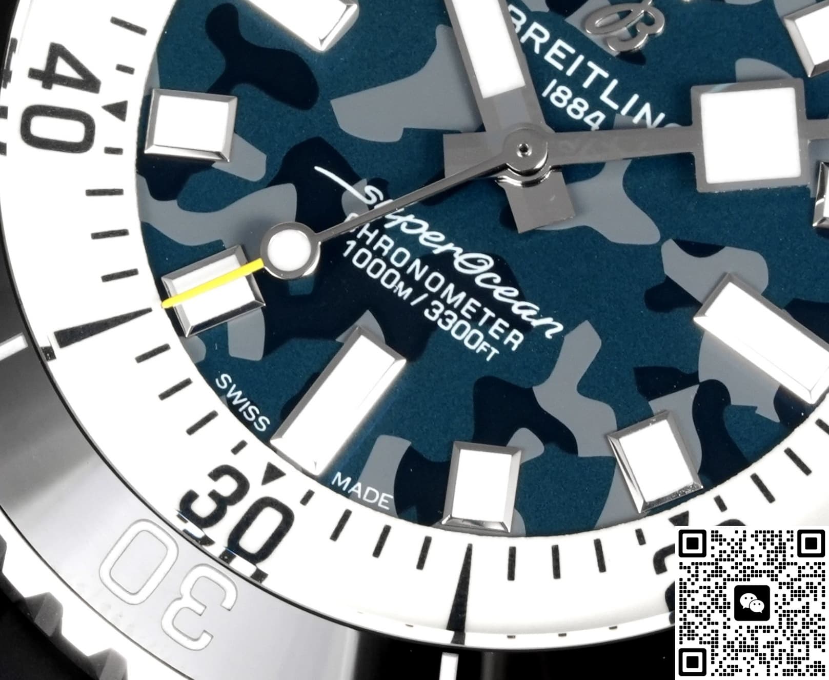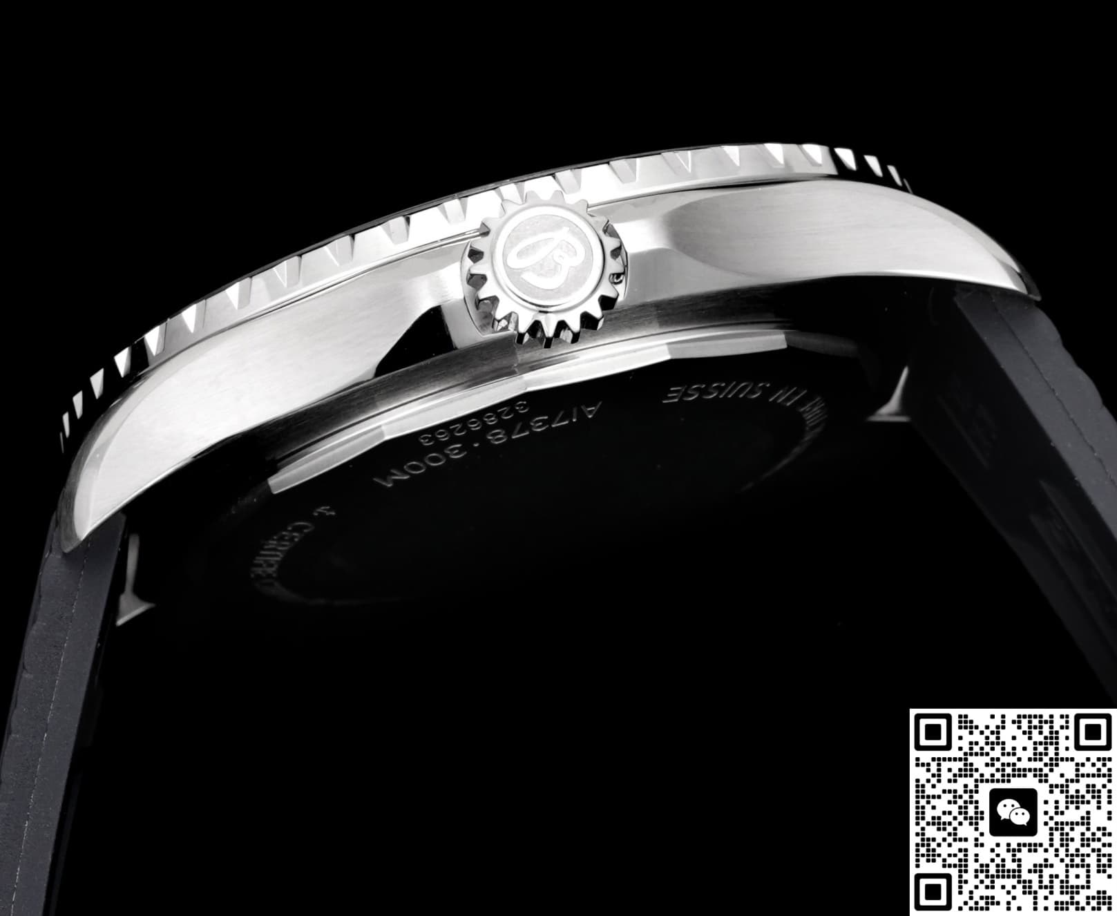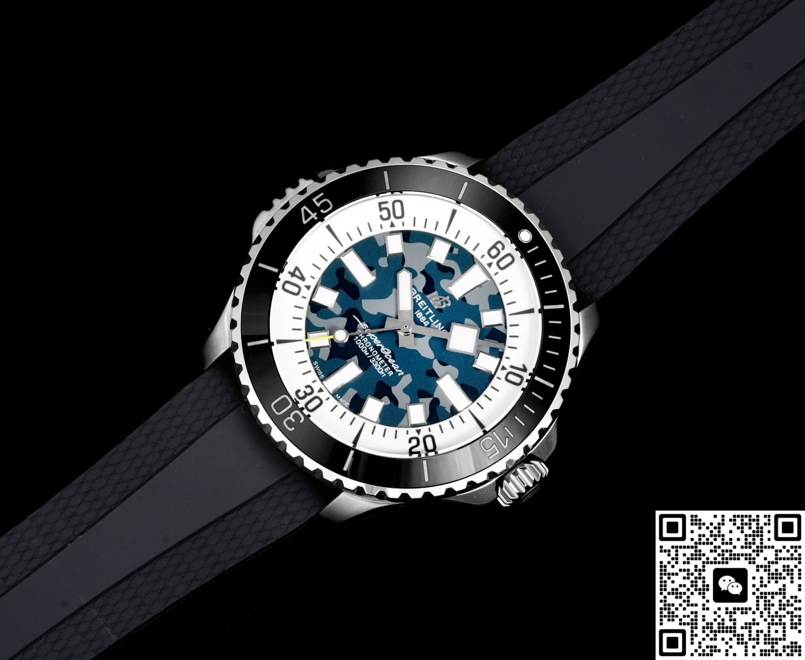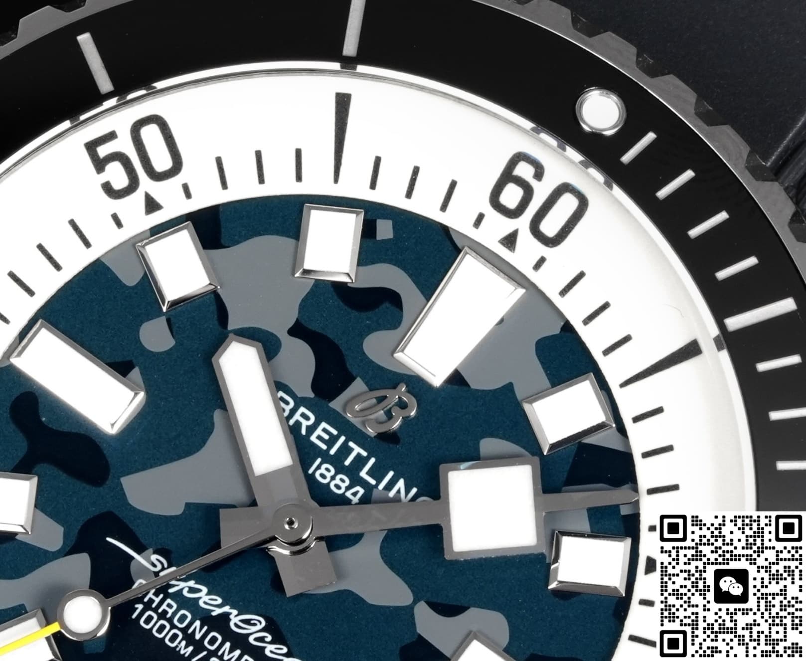 The dial of this BLS Factory Breitling ceramic replica watch isn’t plain black. It uses a black-gray camo gradient process. Through multi-layer spraying and sunburst brushing, it shows a unique cloud-like camo effect. The pattern on every dial is different, making each watch very personalized. Paired with 3D square hour markers and ice-blue lume, it’s recognizable yet low-key during the day. At night, the lume glows brightly so you can read the time easily. For replica dive watch fans who like strong lume, this design is both practical and visually striking.