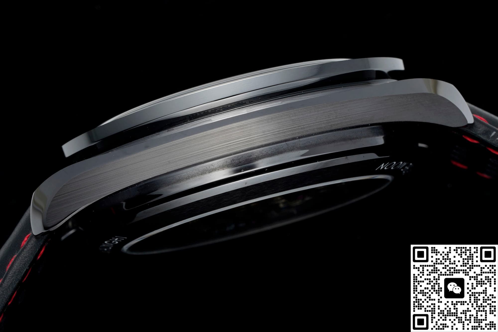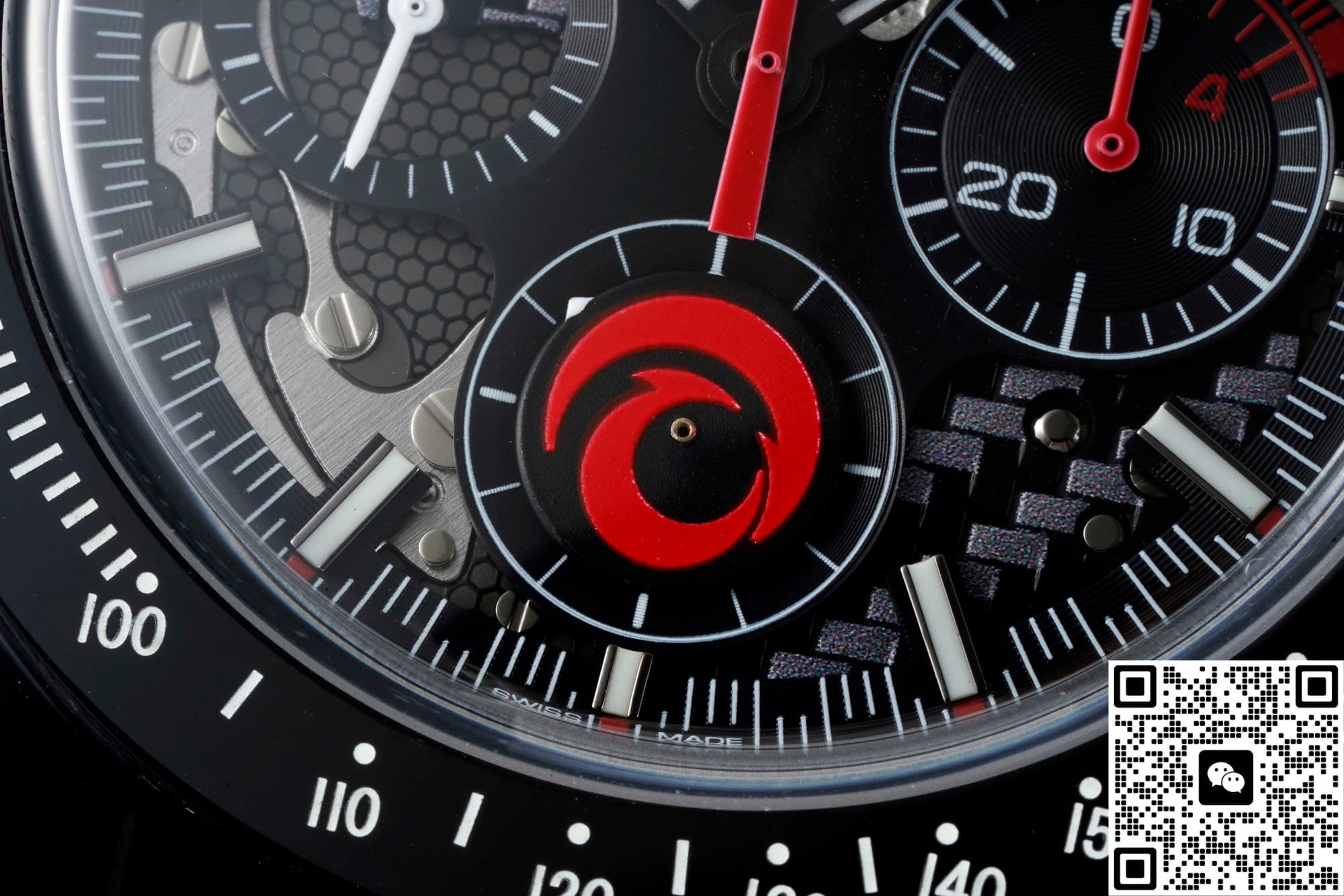 BLS Factory also copied the original’s unique dial design. It uses the same skeleton style, so you can clearly see the movement inside. The main plate and barrel are laser-etched with a honeycomb pattern, and the other bridges are decorated with a black carbon look. This special structure perfectly combines the team’s tech feel with mechanical beauty. The sub-dial at 3 o’clock has red four-minute and five-minute countdown markers. This not only creates a strong color contrast with the black dial but also meets the needs of sail racing. The bezel is made of black ceramic, and the tachymeter scale has lume, so you can read it clearly even in the dark. The central chronograph seconds hand is painted in bright red, matching the overall color scheme and adding a nice pop of color to this BLS replica.