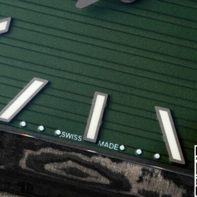 They didn’t modify the movement structure. They just put a reliable, ready-made 26-330 integrated movement into the carbon fiber case. The gold-plated rotor is engraved with horizontal ribs in the same direction as the genuine article. Against the black movement plates, the gold really pops. Now, inside, it’s not the real deal with a silicon hairspring and balance screws. But the balance wheel is in the right place, and the winding efficiency is more than enough for daily wear. Through the sapphire case back, you can see the rotor spinning with your wrist movement. The golden ripples create a strong contrast with the black carbon case. This “gold-in-black” color language echoes the interaction between the green dial and black case, creating a coherent visual rhythm from both the front and back.
