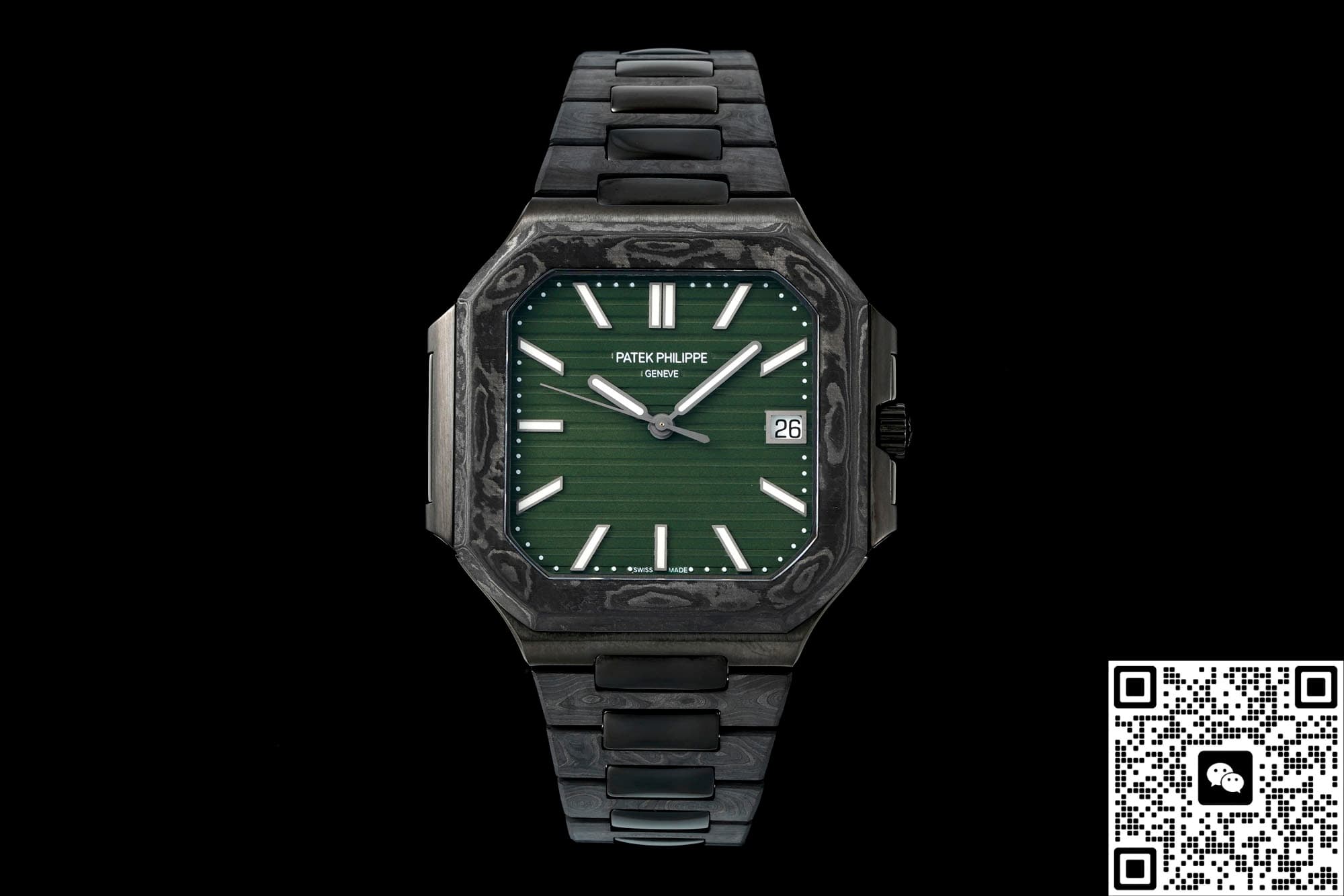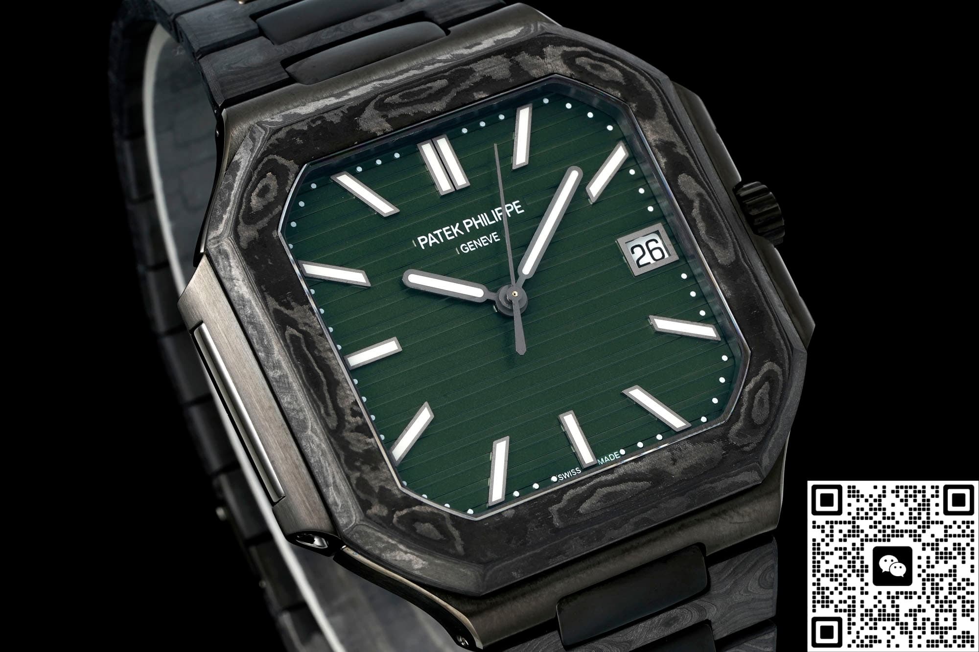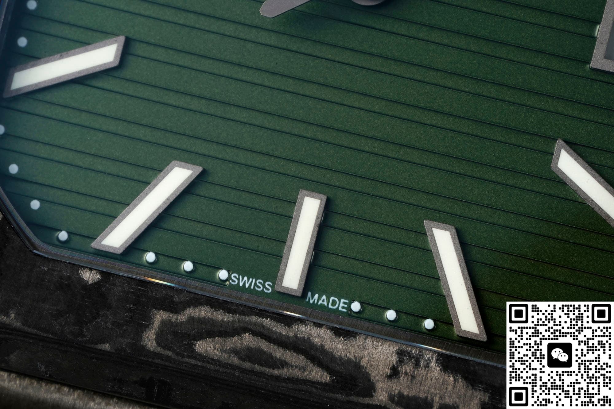 The first thing you notice is the color combo – it really grabs your eye. The genuine Cubitus 5821 currently only comes in steel with either a blue or green dial. The green dial, with its horizontal ribbed pattern similar to the Nautilus, is even called the “square Nautilus.” DIW Factory kept the same direction for the sunburst brushing on the dial. But they lowered the saturation of the base color, making the green darker and more subdued. Paired with the deep black base of the carbon fiber case, it creates a cool, almost “night-time racing instrument” vibe.