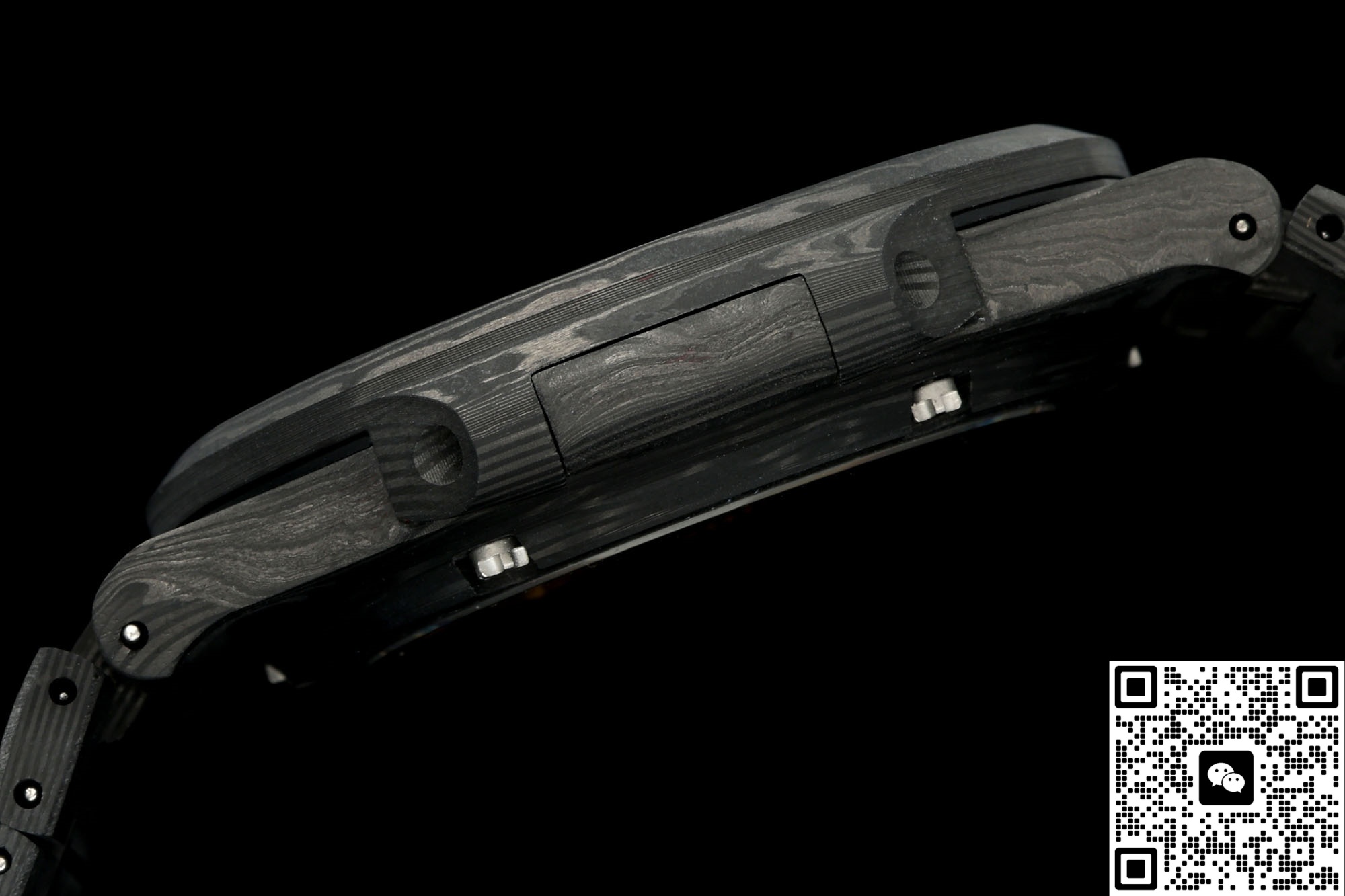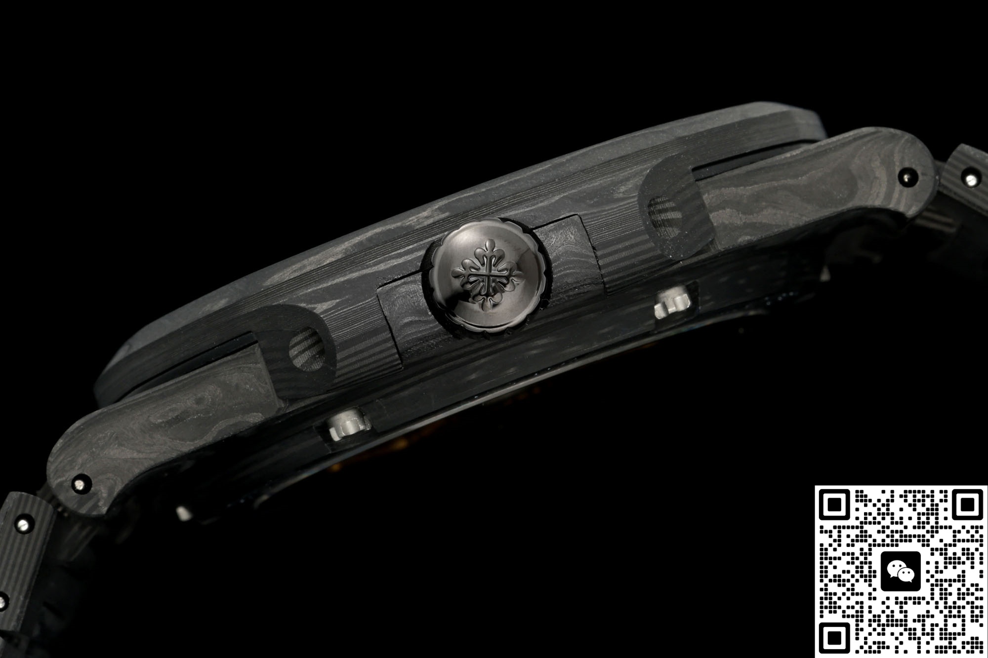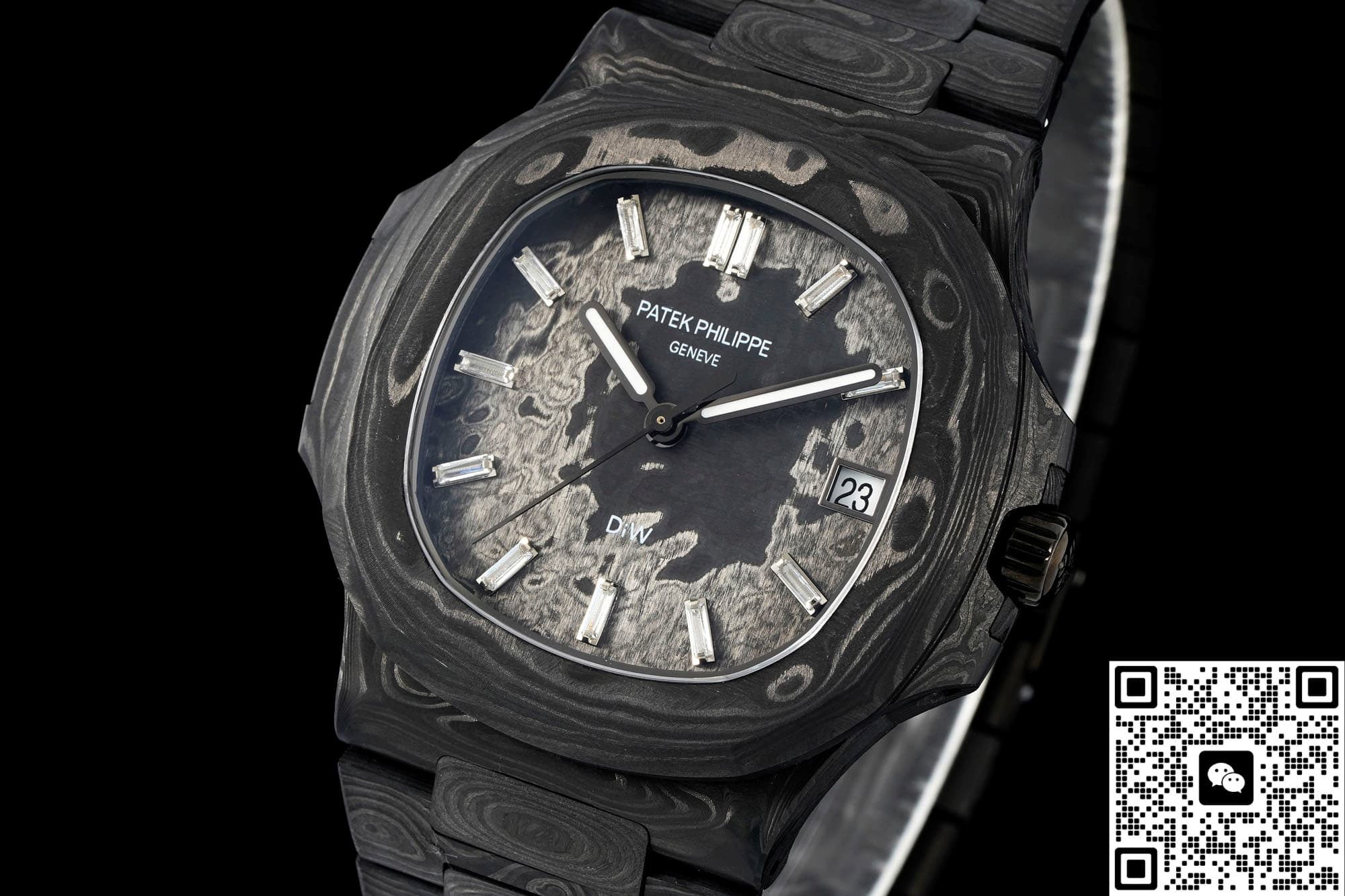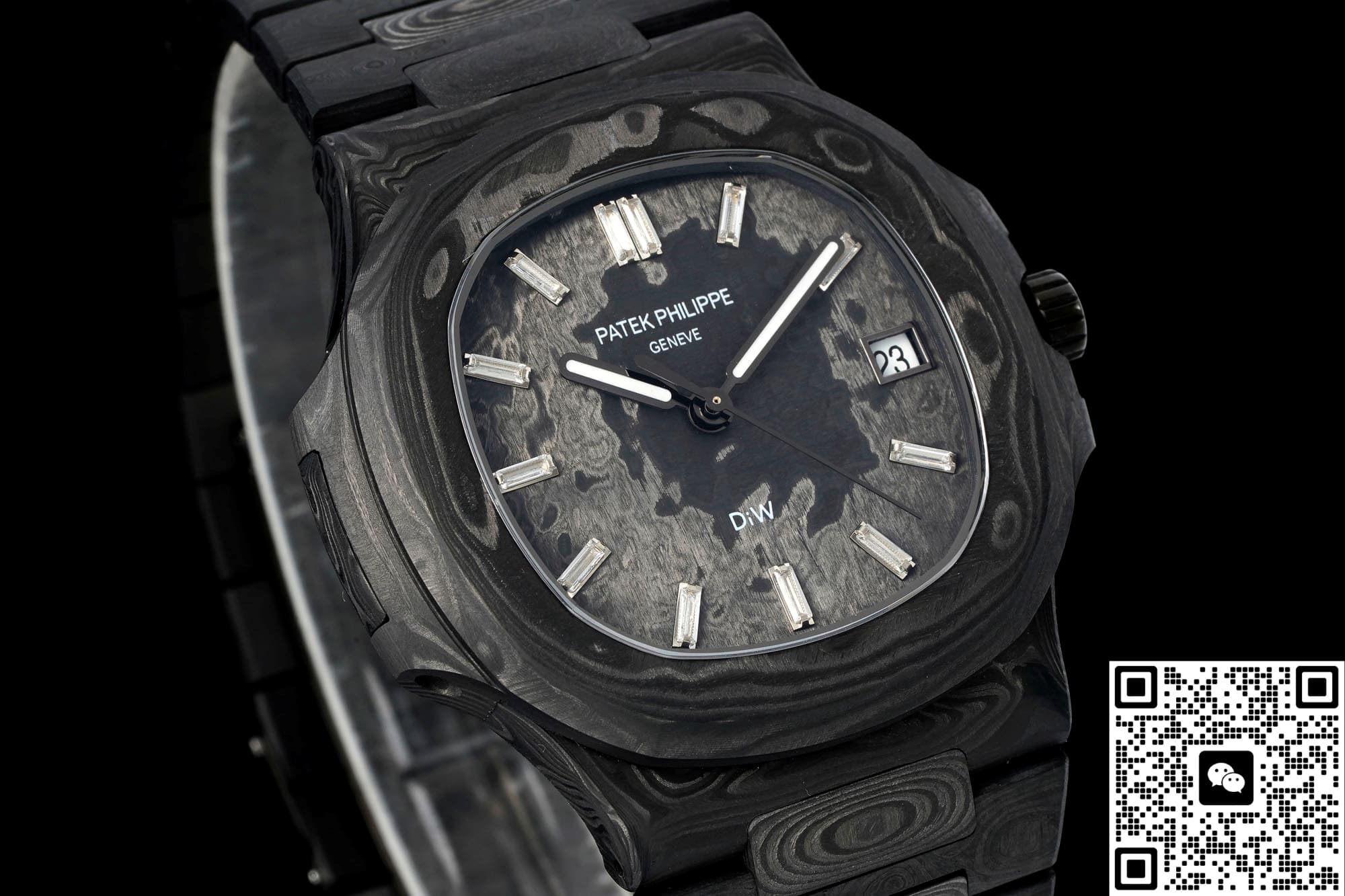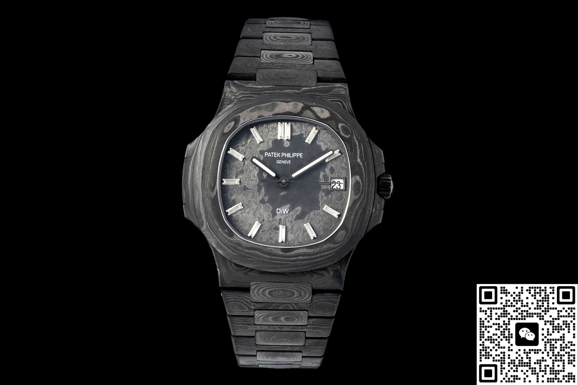 Today, I’ve got something from DIW Factory—the Patek Philippe Nautilus 5711. Honestly, I liked it the moment I saw it. It’s just really good-looking. The dial, the strap, and the case are all made of carbon fiber. The gray-black color is nice—low-key and classy, with a solid feel. The polished round octagonal bezel and the unique porthole-style case are classic Nautilus features. This DIW version is pretty popular among watch fans, so let’s see how it holds up.