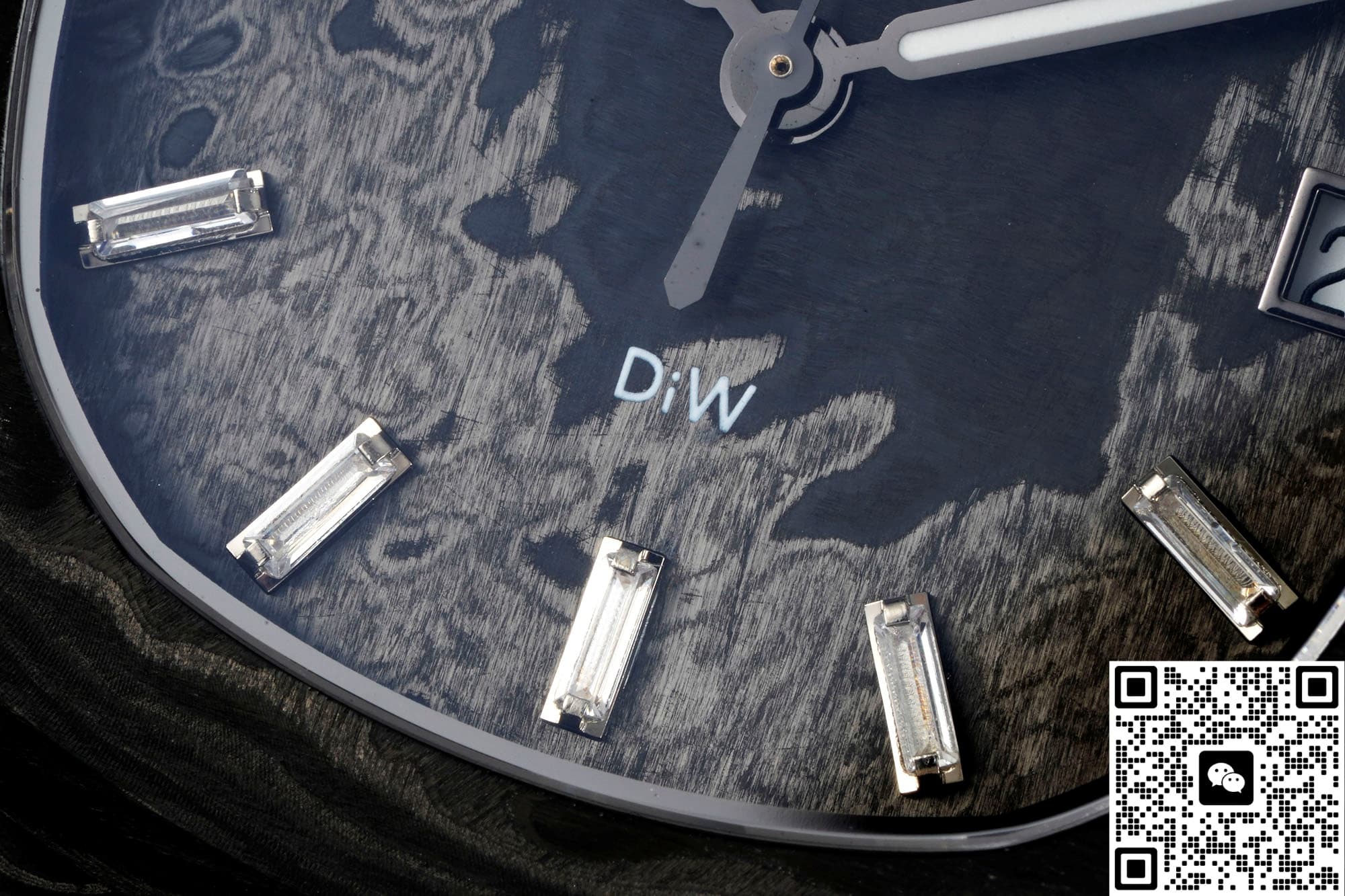 The first thing that grabs you is the dial. The watch is 40mm, which fits most people’s wrists just fine. The dial has this gray-black tone with wave-like patterns around it—really beautiful, like an ink-wash painting with its own vibe. The gray-black could feel dull, but those lines add a touch of mystery. I’m personally a fan. The layout is pretty simple. The white stick-shaped hour markers are smooth, no rough edges, neatly arranged and all the same size. The text under the 12 o’clock position is clean and well-printed—size, angle, everything looks right. At 6 o’clock, there’s the DIW logo. The hands have a solid center, which is a nice detail. The edges are clean, and the tips are rounded. The hour and minute hands are white but outlined in black carbon fiber—looks sharp. At 3 o’clock, there’s a date window with white background and black numbers. The font is centered and clear. Just from the outside, I’d say this replica watch is already a win.