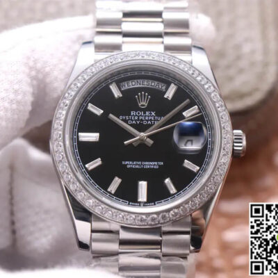 What is a replica watch? To put it simply, it is a watch made by replicating the various parts of the genuine watch according to 1:1 mold opening, that is, a replica watch. Its design, materials, and workmanship will strictly imitate the authentic manufacturing. This kind of watch has many advantages such as high simulation degree, fine workmanship and stable performance. Most replica watches can also achieve all the functions of the original watch, which is why many replica watches can be exported overseas. If you are looking to buy a high imitation watch, then this EW Factory Rolex Day Date M228349RBR-0003 Black Dial is a very good choice.