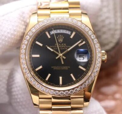 What is a replica watch? To put it simply, it is a watch made by replicating the various parts of the genuine watch according to 1:1 mold opening, that is, a replica watch. Its design, materials, and workmanship will strictly imitate the authentic manufacturing. This kind of watch has many advantages such as high simulation degree, fine workmanship and stable performance. Most replica watches can also achieve all the functions of the original watch, which is why many replica watches can be exported overseas. If you are looking to buy a high imitation watch, then this EW Factory Rolex Day Date 40MM Black Dial is a very good choice.