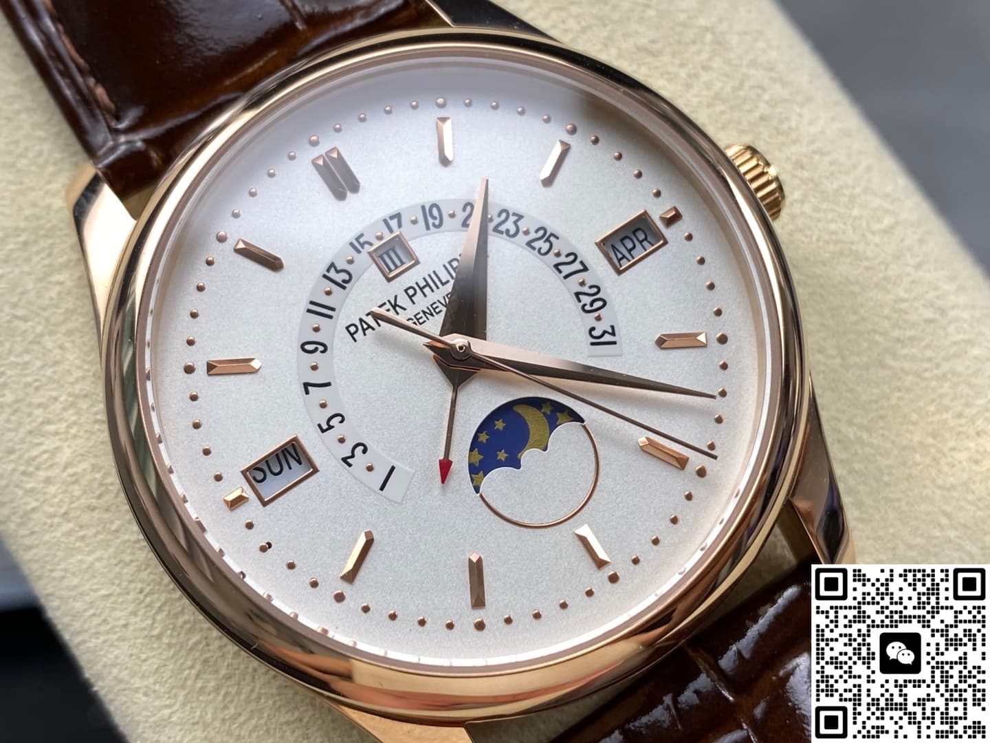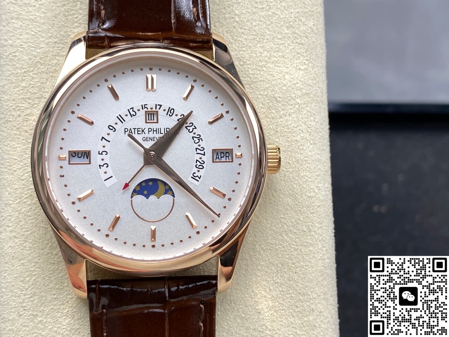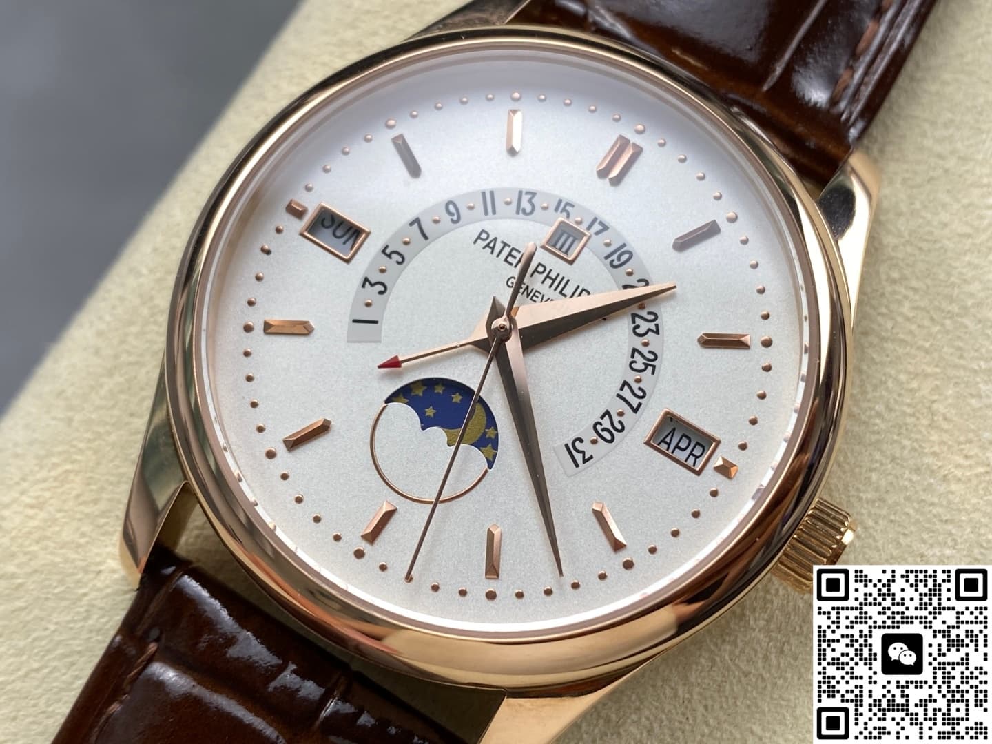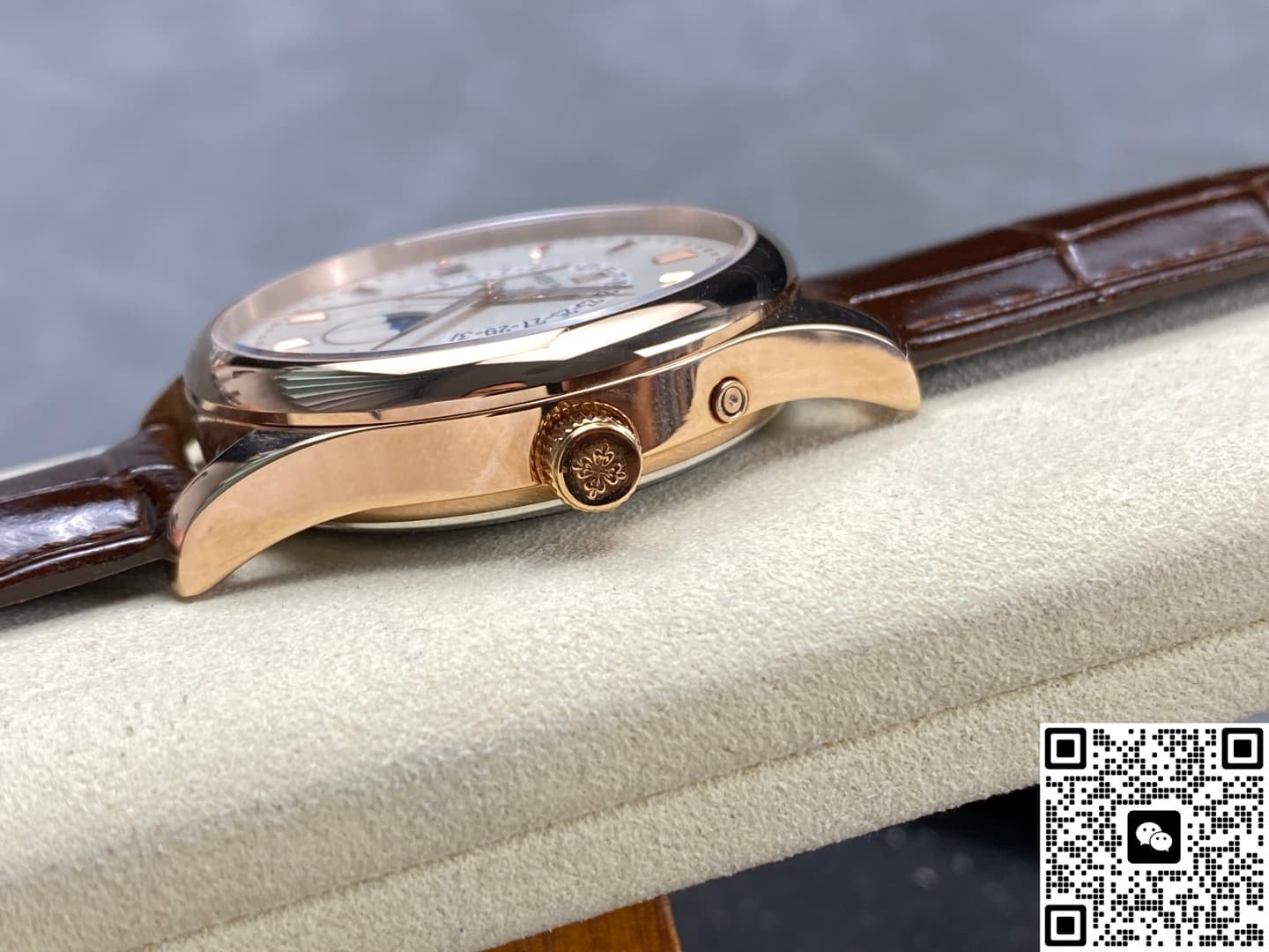 The movement is what many friends care about most. For this top-grade cloned Patek Philippe version, GR Factory has equipped it with an integrated perpetual calendar movement. The base part is a Sea-Gull 2836 automatic winding movement, keeping the timekeeping gear train and automatic winding system. On top of this, a perpetual calendar module is added, fixed to the calendar side of the movement with four screws. The overall structure is compact, not the traditional sandwiched plate design. The balance system uses a smooth balance wheel and a four-weight structure. The regulator arm is removed, and fine timing adjustments are made by adjusting these weights. Each weight has an adjustment range of about 2 seconds per day, so the overall timing adjustment precision is high. The rotor is 21K gold with embossed design. The bearing uses six ceramic balls. Normal walking for about eight hours can replenish the power lost from one day of rest. With a full wind, it can have about 45 hours of power reserve, which is completely sufficient for daily wear needs. Also, all the functions are achieved through the internal gear linkages of the movement, they are not just decorative. The perpetual calendar function can recognize long/short months and February 29th in leap years. Daily adjustments can all be done through the crown.