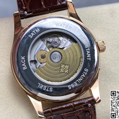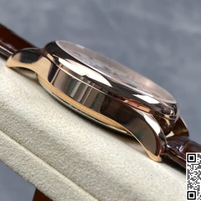 The GR Factory Patek Philippe has a case diameter of 39.5mm, with the thickness kept at 11.2mm, making it a very classic dress watch. The case uses 316L stainless steel as the base material. The surface is plated with rose gold color using a vacuum furnace PVD process, with a plating thickness of over 20 microns. It has very good wear resistance and oxidation resistance. Under daily wear, the plating won’t easily fade or show the base metal within two years. If you take extra good care of it, it might even last more than two years. The crystal is made of slightly domed “soup plate” sapphire glass. The inner layer has a 9-layer anti-reflective coating, giving it very high light transmission. Under side lighting, the edges show a light blue reflection, which is very close to the effect of the original crystal. The curve of the crystal fits tightly with the bezel, with no obvious step feeling. It looks very clean and comfortable from the front. The dial has a cream-white base, treated with a high-temperature curing process, giving the surface relatively high hardness, so it’s not easy to get scratched.