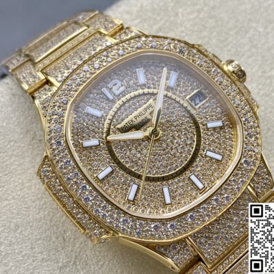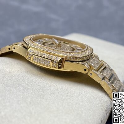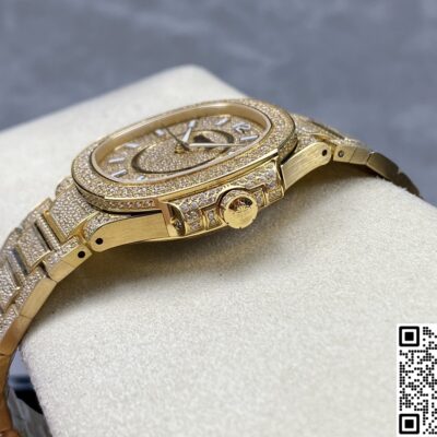 - R8 factory Replica Patek Philippe Nautilus Jumbo 5711 Tourbillon full diamond watch has unique and full of charm design, and it is the sublimation work which presenting perfect workmanship, and it is a symbol of successful person. Patek Philippe Nautilus Jumbo 5711 Tourbillon is equipped with Swiss manual winding tourbillon movement that is durable and run time preciously and stablely. And diameter is 40mm and thickness is 11mm which is suitable for people who has different wrist size. This Patek Philippe Nautilus Jumbo 5711 Tourbillon use 18K yellow gold plated rhinestone, sapphire double-side crystal mirror, 50 meters depth waterproof, and superstrong nightlight. Patek Philippe Nautilus Jumbo 5711 Tourbillon adopt 316L stainless steel plating 18K yellow gold and inlaid rhinestone watch case, that is never fading.