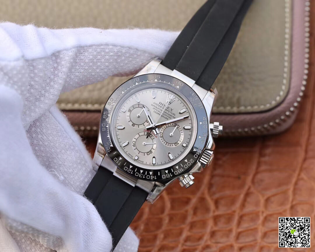 - Noob factory Rolex Daytona Cosmograph 116519LN 904L stainless steel replica watch adopt newly customized edition Rolex Daytona exclusive cal.4130 automatic winding movement which thickness is consistent with genuine. So that the watch can 100% realize all functions of genuine, and unprecedentedly use customized edition KIF shock absorber. And the whole machine is designed according to real Cal.4130 movement, the three-layer basilar plate that from chamfer to solar pattern are completely 1:1 respect original factory design. This watch not only is superior than all duplicates of Rolex Daytona in the market, but also the only replica that can compete with authentic Rolex Daytona.