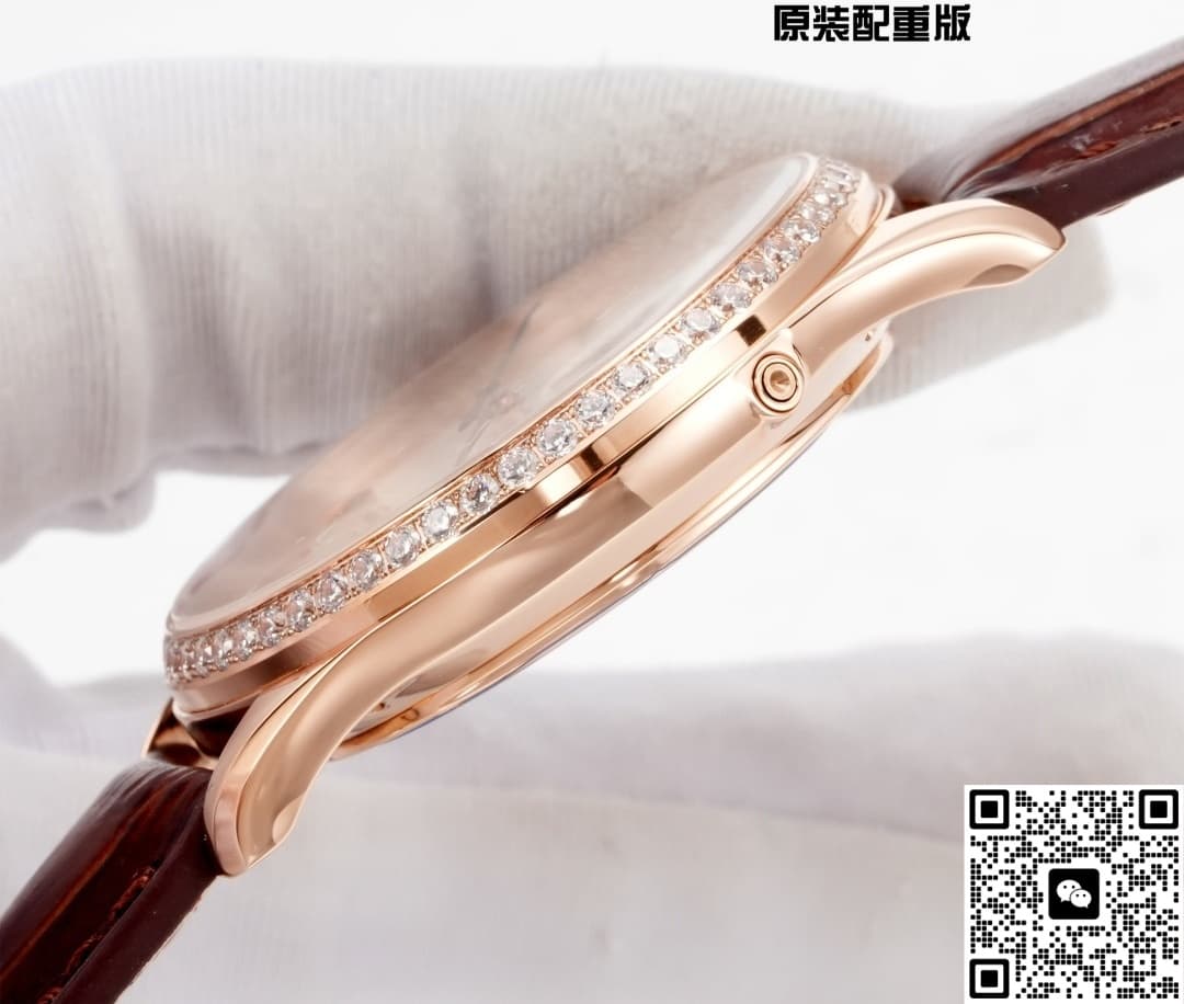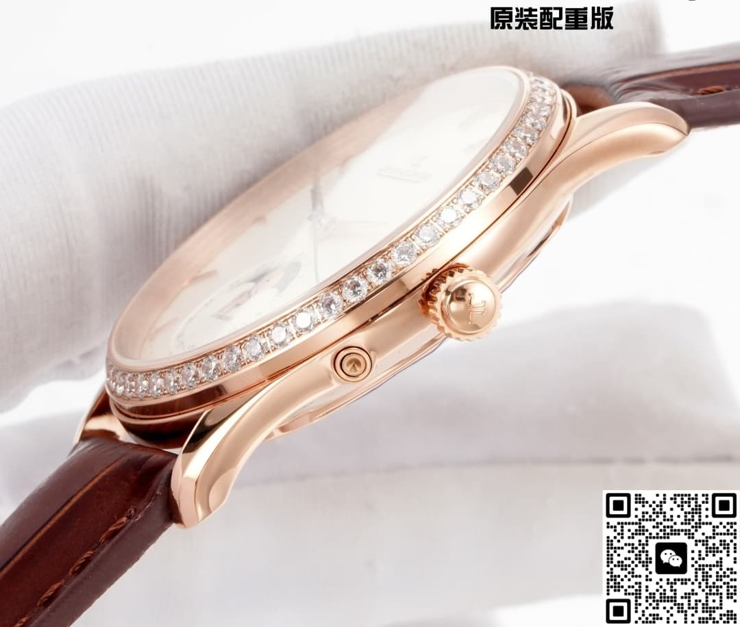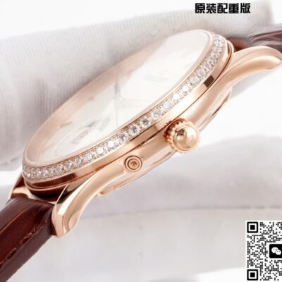 - Jaeger-LeCoultre Master Real Tourbillon full diamond watch adopt GMT Time Zone display of two places, and 24-hour sun and moon phase. Jaeger-LeCoultre Master real Tourbillon watch adopt 18K rosegold plated on full diamond stainless steel case and dial. The diameter of replica Jaeger-LeCoultre Master Real Tourbillon watch is 42mm, and thickness is 13mm, and it is suitable for people who has different wrist size. Jaeger-LeCoultre Master Complication Functions Real Tourbillon full diamond 18K rosegold watch use EQ manual winding 3310 real tourbillon movement which can run time accurately for a long time and reserve high energy. Jaeger-LeCoultre Master Real Tourbillon full diamond adopt calfskin leather strap matching Jaeger-LeCoultre watch exclusive watch buckle.
