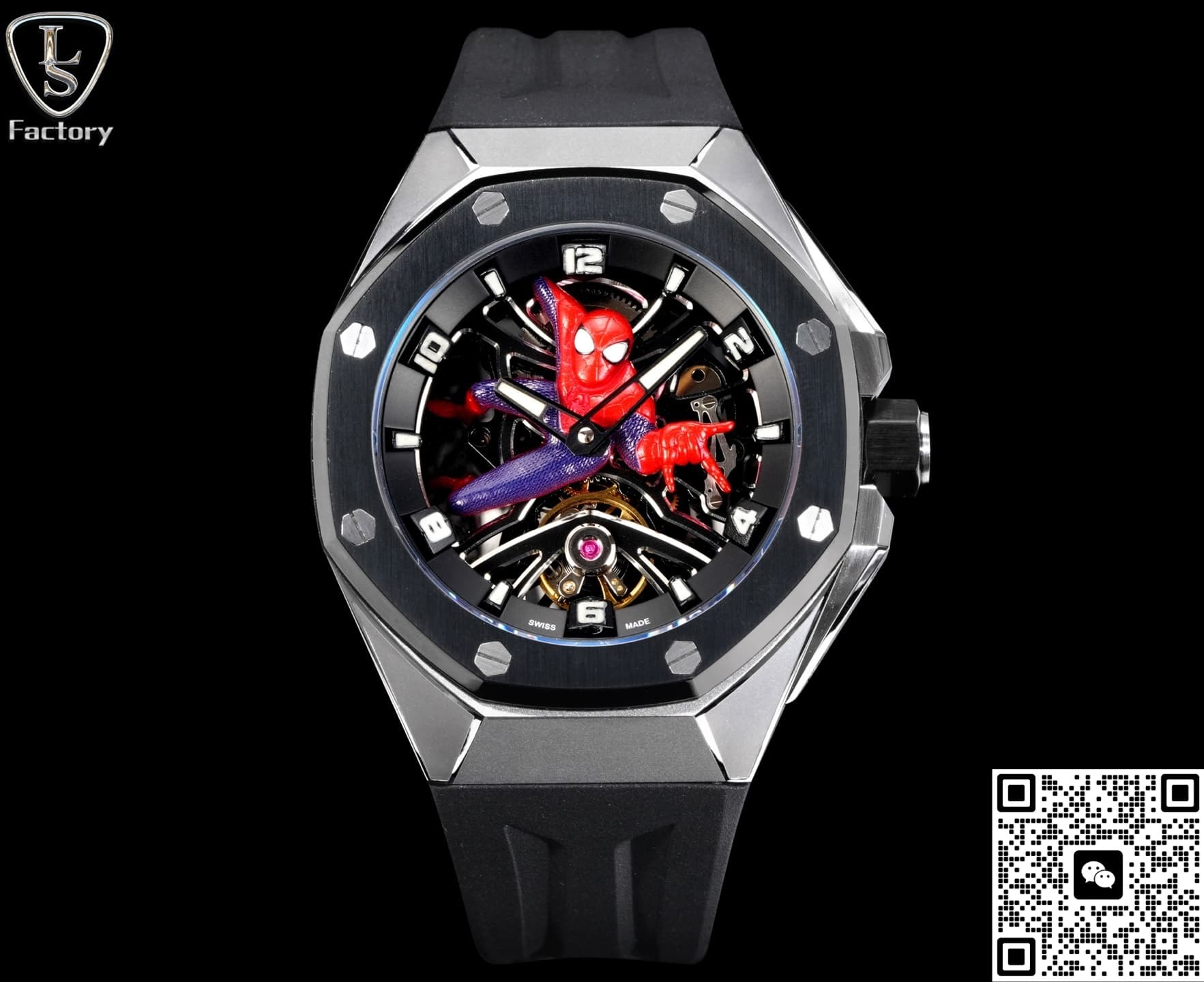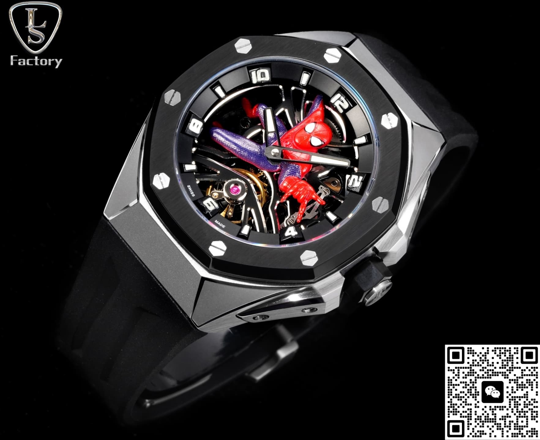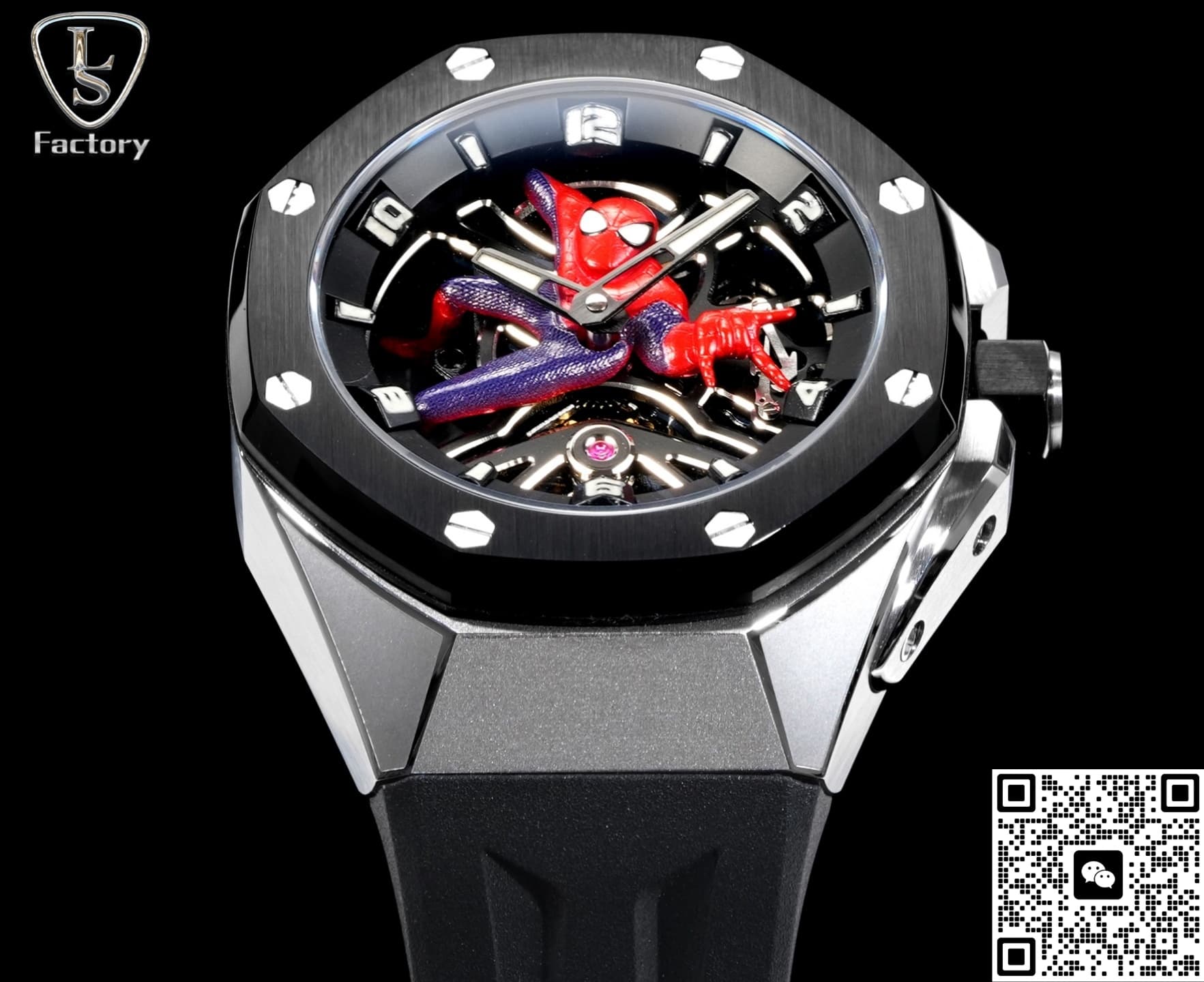 What stands out most is the skeleton Spider-Man dial. The openworked design gives it a strong mechanical and futuristic vibe—really eye-catching. The Spider-Man figure sits right in the middle of the dial, with nice 3D depth. It looks like he’s about to shoot his web right out of the watch—such a cool design. If you look closely, you can see the details on his suit, the lines and texture, all pretty well captured. The pink-purple jewels on the movement are also very close to the original and look really nice.