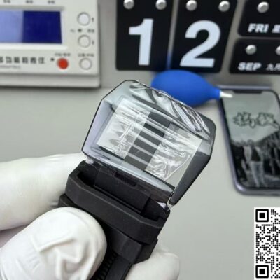 The case on this M+ watch is made of ceramic. Even though it’s square-shaped, the four corners are polished smooth, so the lines flow nicely. Really classy. The ceramic bezel has green luminous markers – clear and evenly sized. Sapphire crystal, clear and bright. The dial has a matte black finish. Color is same as genuine, no issues with shade difference. The luminous markers and hands are pretty big, so you can tell time in any condition. One thing to note: the lume layer is a bit thin, not as bright as the original. But in the dark, you can still read the time. Doesn’t affect use. The hands are cleanly finished, no rough edges. Printing of the brand text is sharp, matches the original. Overall, the exterior details are highly accurate. If you like the look of this watch, you can give it a try.