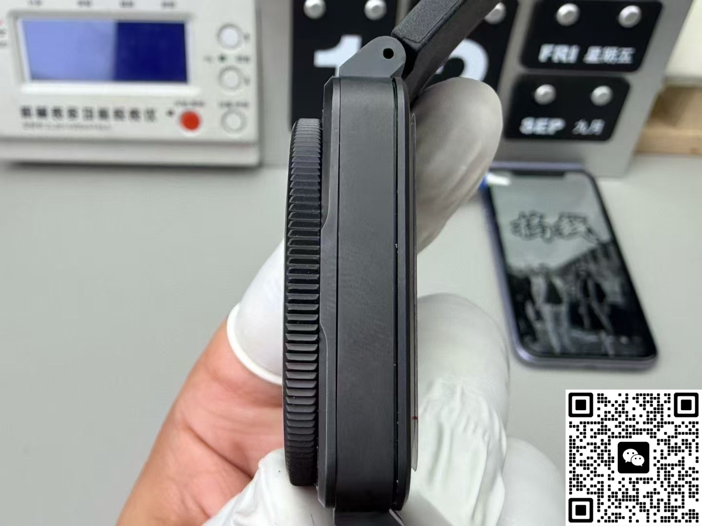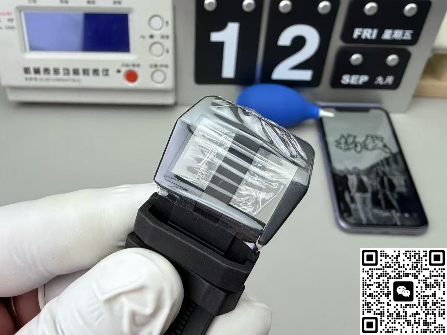 The case on this M+ watch is made of ceramic. Even though it’s square-shaped, the four corners are polished smooth, so the lines flow nicely. Really classy. The ceramic bezel has green luminous markers – clear and evenly sized. Sapphire crystal, clear and bright. The dial has a matte black finish. Color is same as genuine, no issues with shade difference. The luminous markers and hands are pretty big, so you can tell time in any condition. One thing to note: the lume layer is a bit thin, not as bright as the original. But in the dark, you can still read the time. Doesn’t affect use. The hands are cleanly finished, no rough edges. Printing of the brand text is sharp, matches the original. Overall, the exterior details are highly accurate. If you like the look of this watch, you can give it a try.