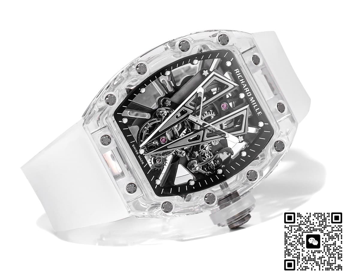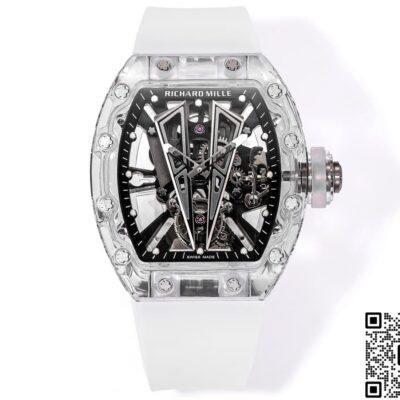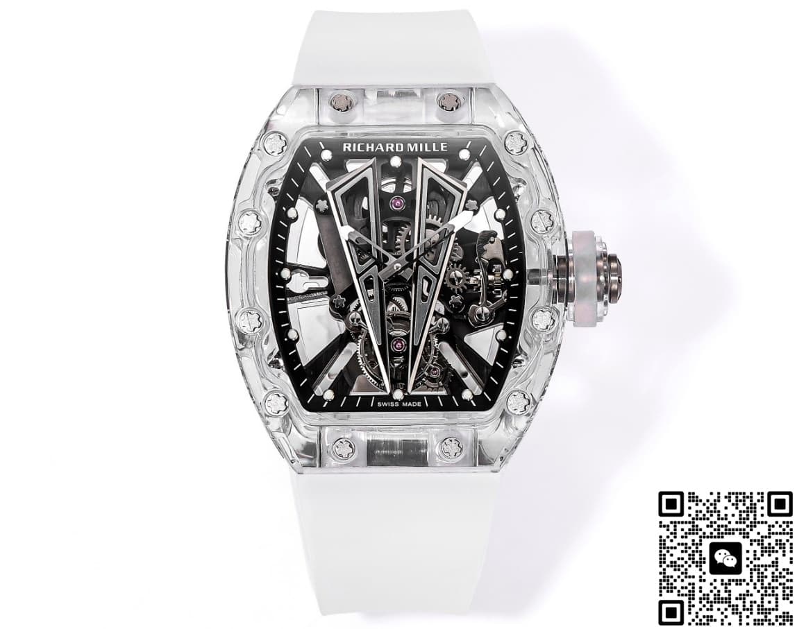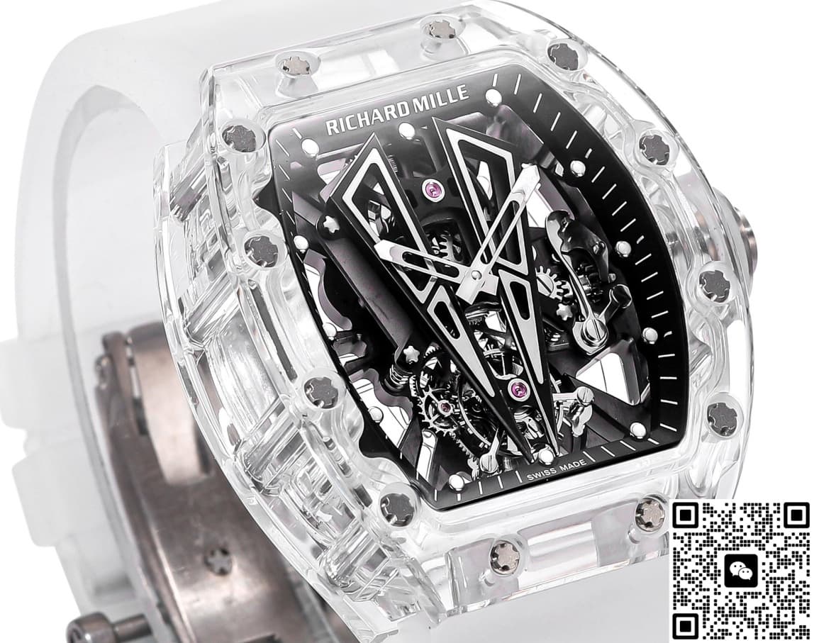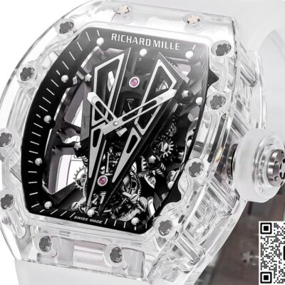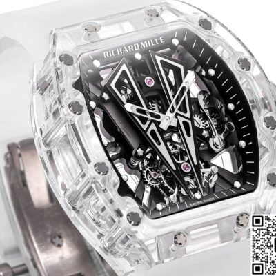 Today, let’s talk about this Richard Mille RM27-03 replica watch from MS Factory. The design of the watch looks very cool. The skeleton dial gives it a full mechanical style. This watch does a great job recreating the bull’s head bridge design on the skeleton dial—it looks super bold and full of power. The fully transparent case shows off MS Factory’s excellent craftsmanship. You can clearly see how the movement works inside, which is really eye-catching. Let’s take a closer look.