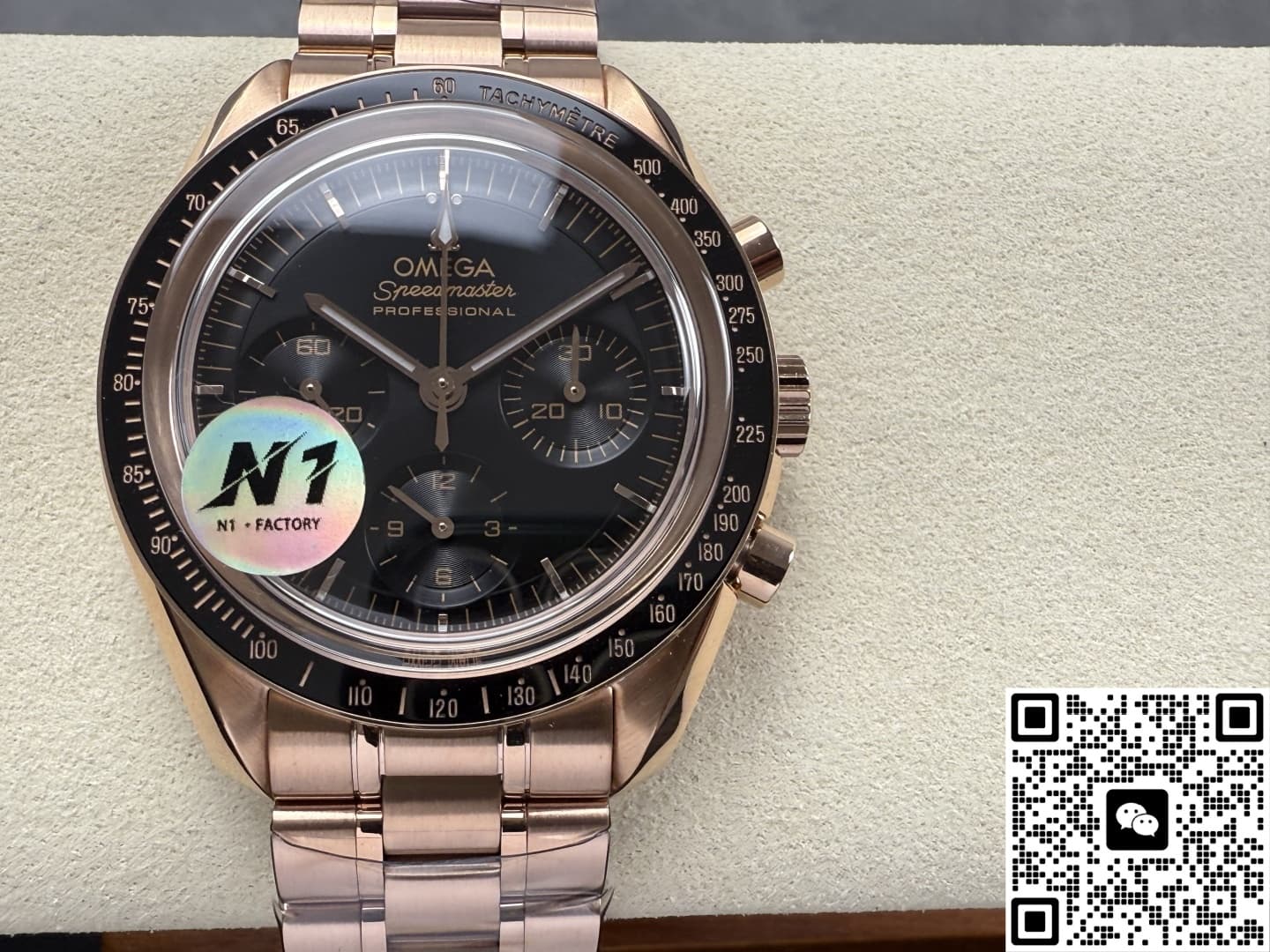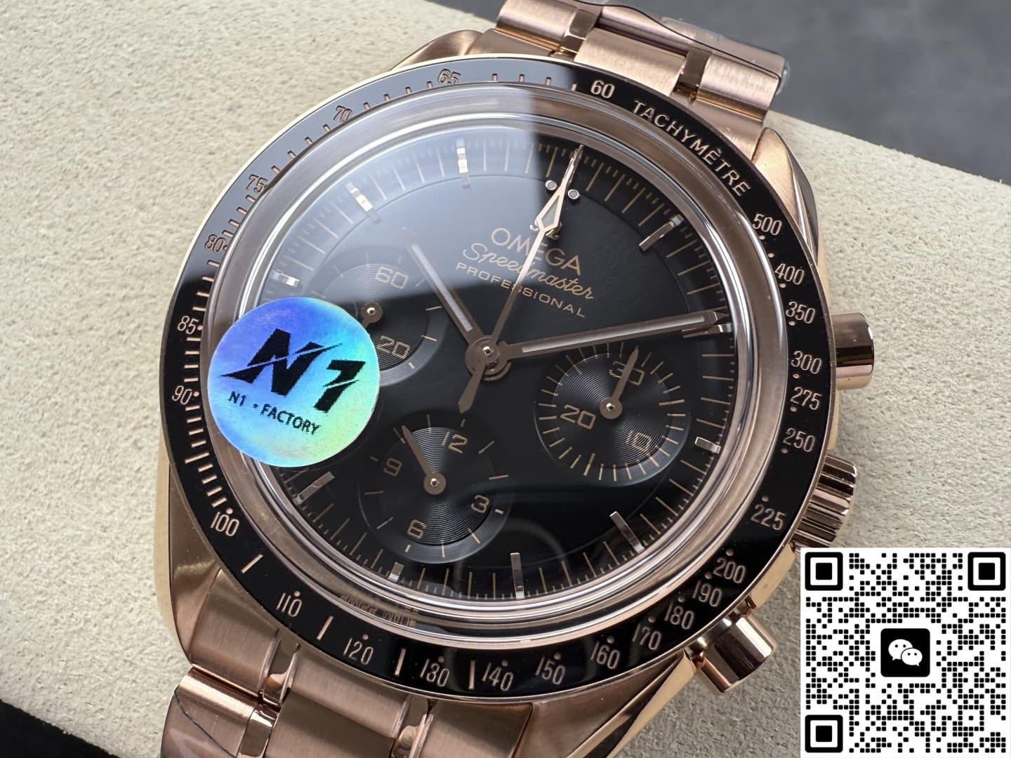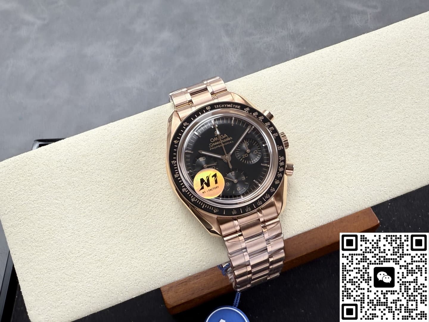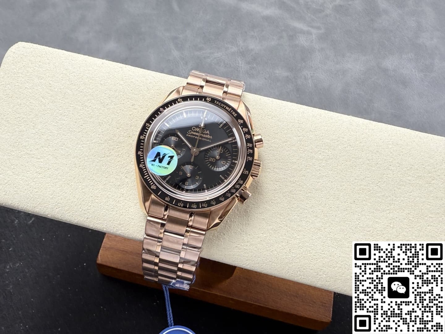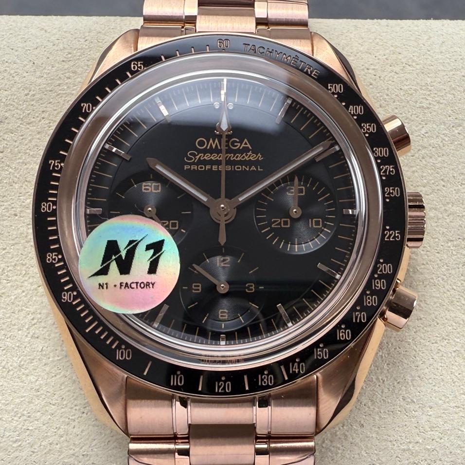 This Omega Speedmaster from the N1 factory is really popular among watch fans. The Omega Speedmaster series was born in 1957, made for racing, and it was also the first watch on the moon. It has great timing functions and is loved by adventurers and space enthusiasts. When I first saw it, I thought, no wonder so many people like it. Except for the black dial, the rest of the watch is gold. Black and gold is a classic combo. The mystery of black tones down the boldness of gold, and the shine of gold breaks the dullness of black. When these two colors come together, it feels high-end and luxurious. I personally really like this kind of pairing. Today, let’s see how this replica watch looks overall.
