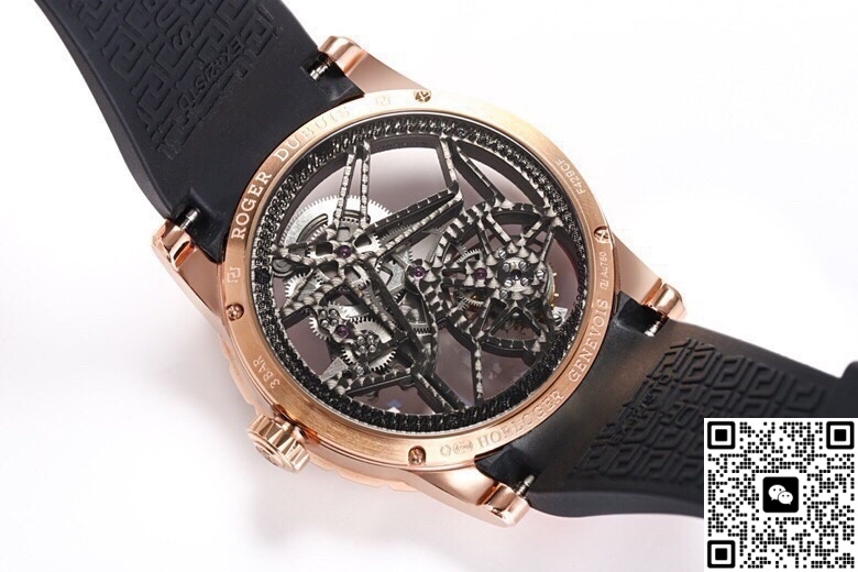 NEW Factory’s version really captures the transparent, mechanical beauty of the original—very techy, which is a treat for mechanics lovers. The five-pointed star mainplate on the dial is highly recognizable. It adds a lot to the look, making the dial more layered and eye-catching, while also connecting the watch’s functions. It’s both good-looking and practical. Looking closely, the chamfering and polishing of the movement parts are very detailed. The overall design gets the essence of Roger Dubuis skeleton watches—full of mechanical beauty. It’s a well-made replica watch.
