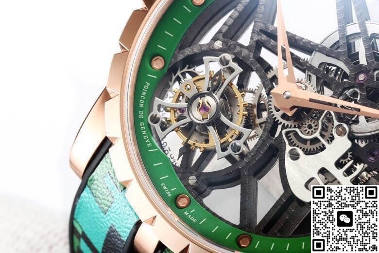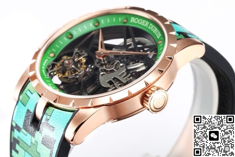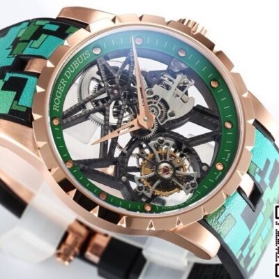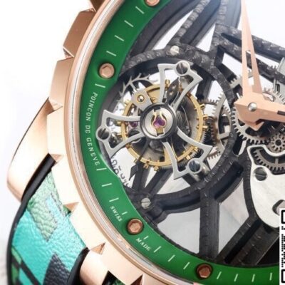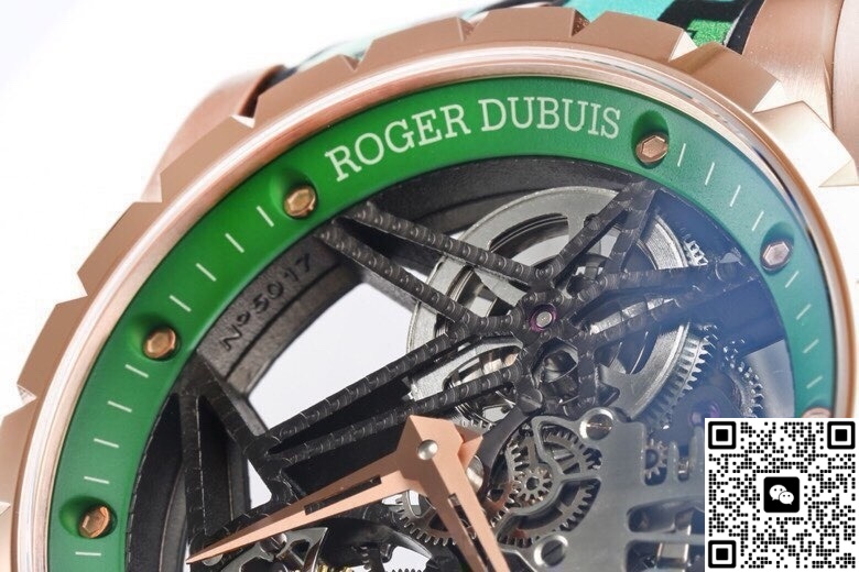 The NEW Factory Roger Dubuis King RDDBEX0939 Tourbillon replica watch is the most talked-about green-and-gold colorway overseas right now. It brings all of Roger Dubuis’ signature elements into its version—the star-shaped bridge and the flying tourbillon. They even milled the bezel width of the rose gold case to exactly 0.3mm, just like the original 42mm version. From a normal social distance, you simply can’t tell the difference.