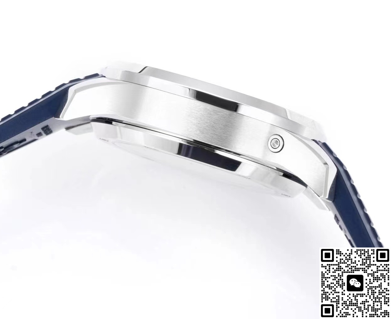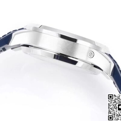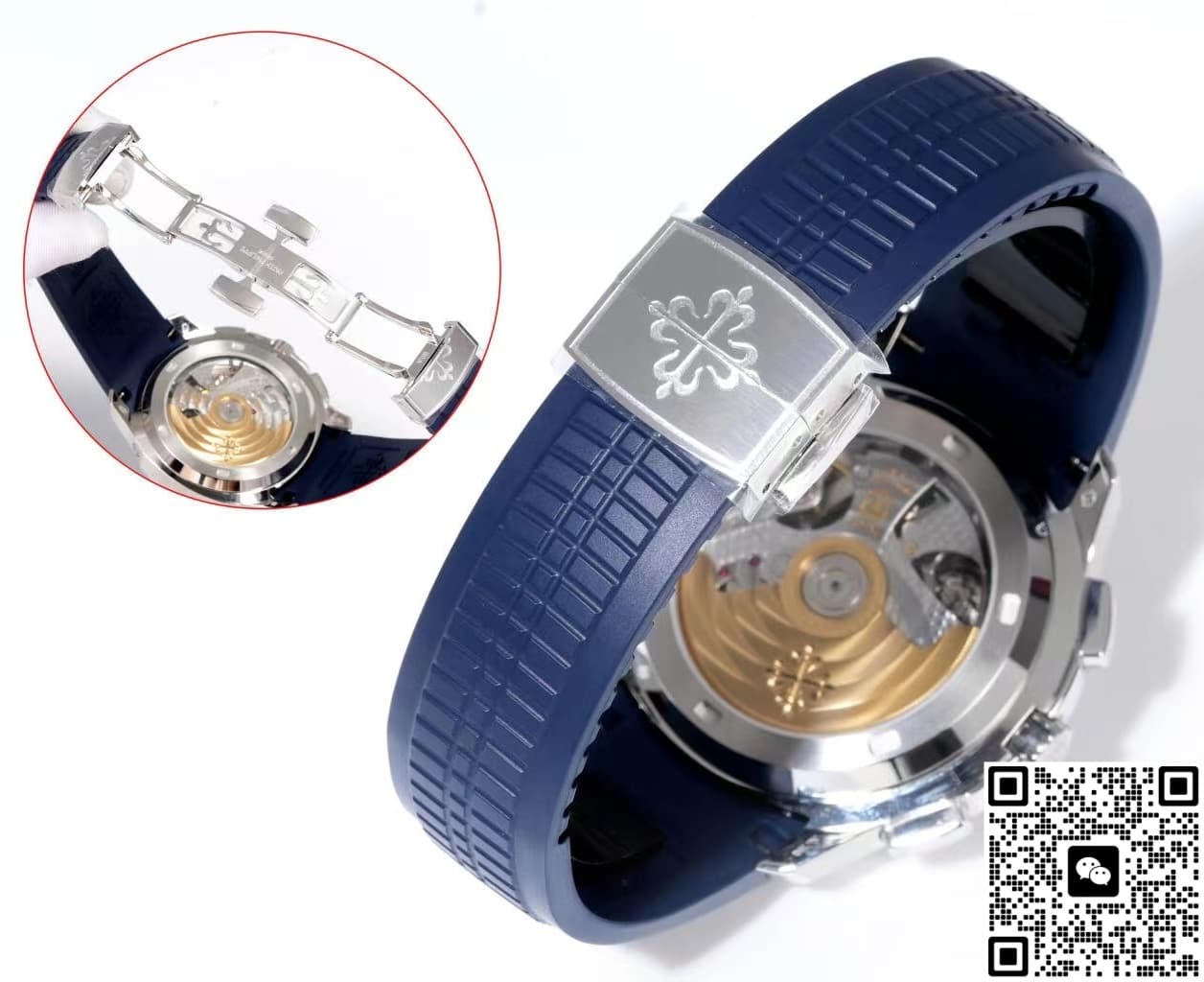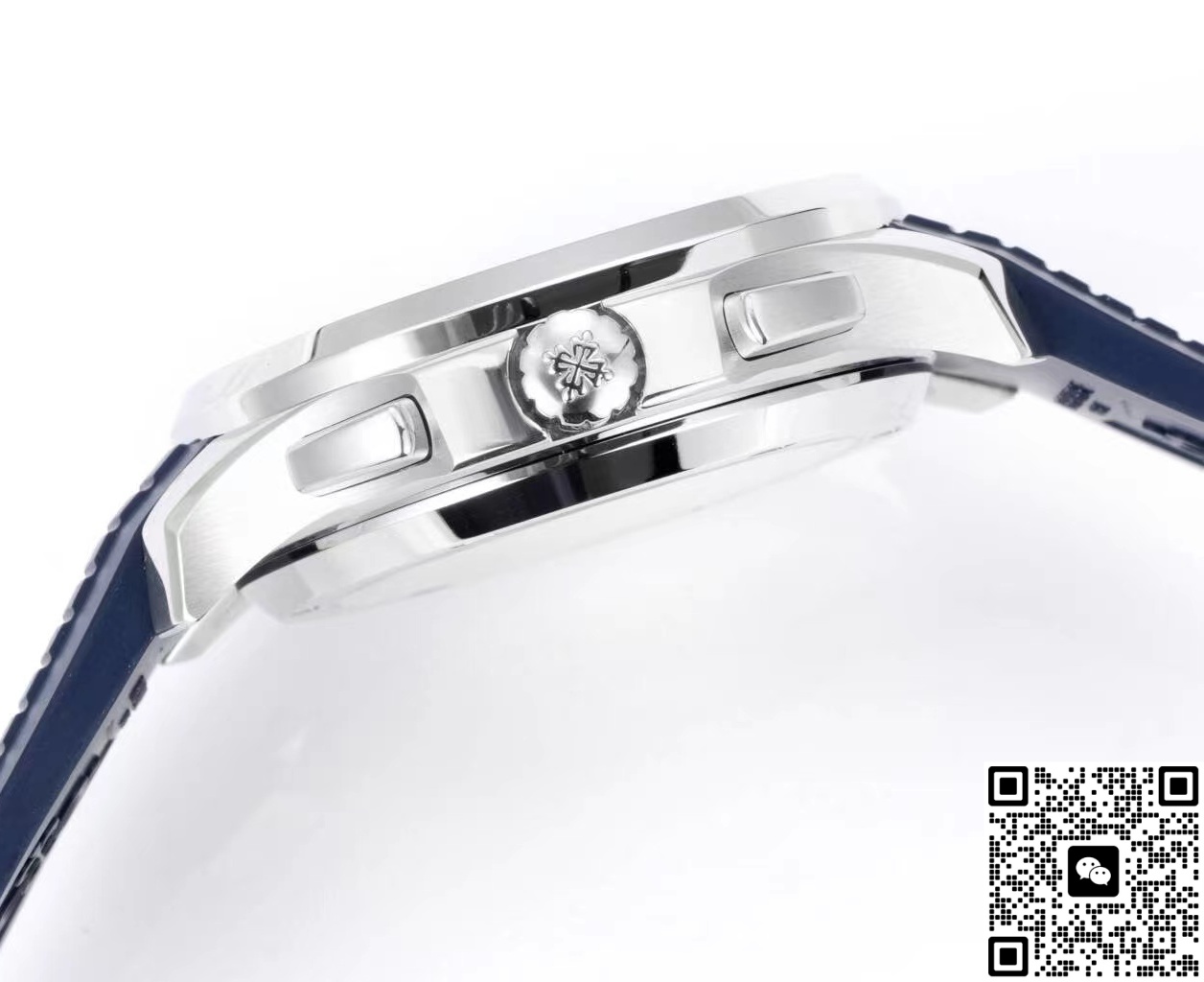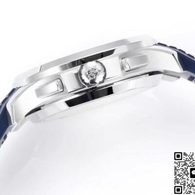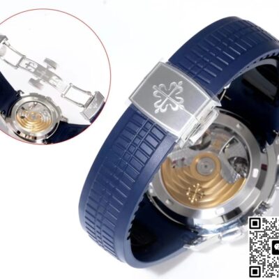 Today, we’re checking out this Patek Philippe AQUANAUT series 5968G-001 replica watch from P1 factory. When I saw the actual watch, I realized it really has a lot of quality and is very pleasing to the eye. The blue dial gives off an elegant and steady vibe. Indoors, the dial has a subtle, satin-like finish that looks super classy. But under strong sunlight, it switches to a shimmering, watery shine that’s really beautiful. The rubber strap feels light and fits the wrist perfectly. Whether you’re working out or wearing it to the office, it handles it all easily. Let’s take a closer look at it from a few different angles.