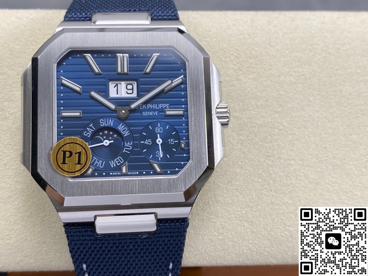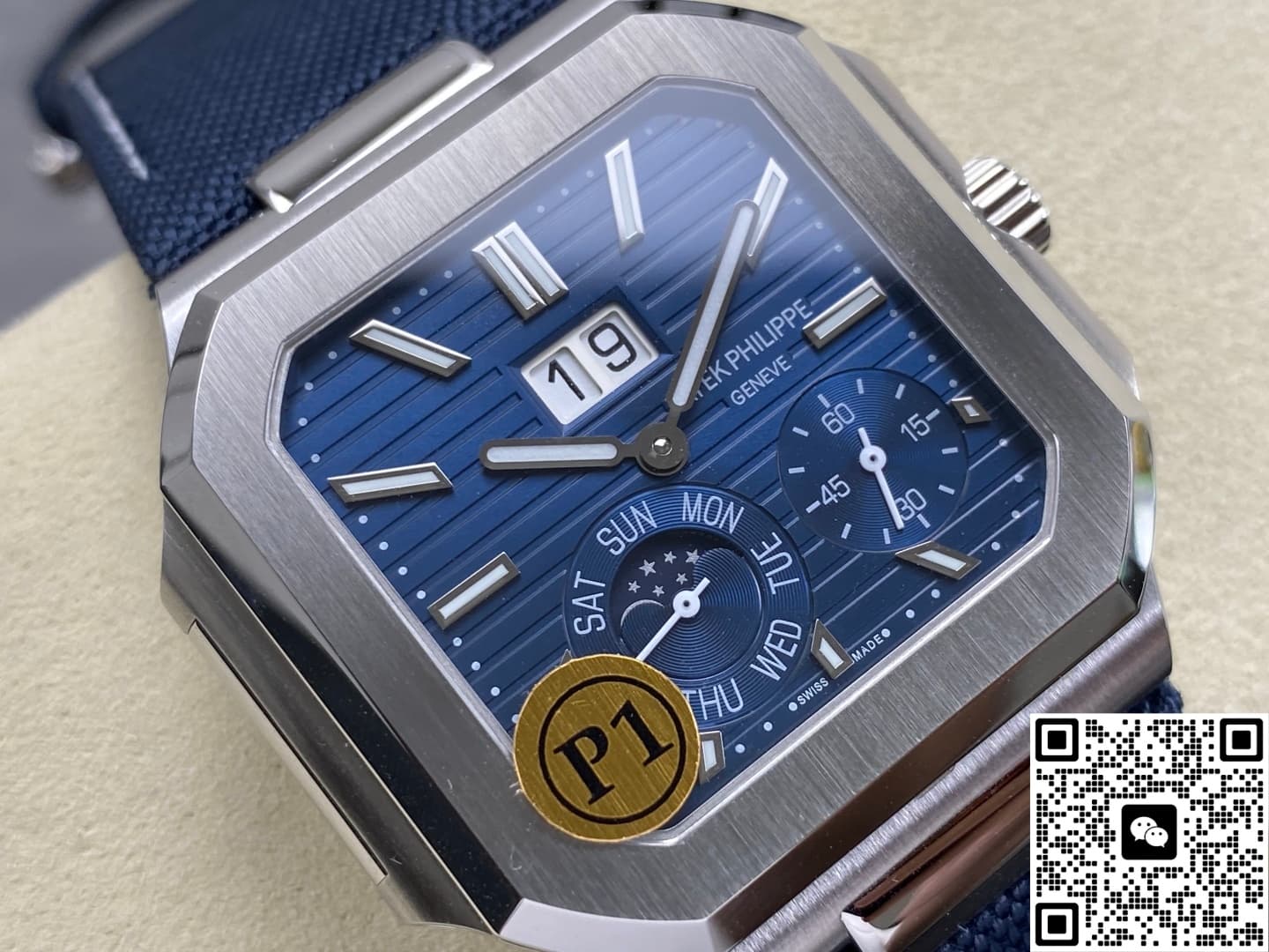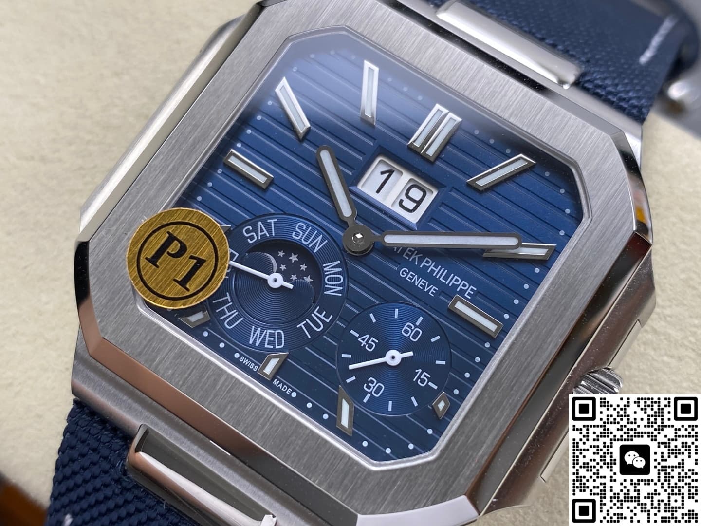 The original Patek Philippe 5822 uses horizontal relief pattern to cut the blue sunburst dial into layered waves. P1 Factory has recreated this texture into more understated fine stripes. Visually, it still looks deep but won’t glare too much under strong light. The double-window big date at 12 o’clock is a true instant-jump mechanism. Around midnight, within eighteen milliseconds, the date and day discs flip simultaneously—you can actually see them advancing with your own eyes. The moon phase at 7 o’clock shares a raised cover with the pointer-style weekday sub-dial. The golden moon and deep blue starry sky on the moon phase disc are cold-pressed inlayed. Even under magnification, there’s no glue overflow, and the edges are very neat. The small seconds sub-dial is placed at 5 o’clock, which not only avoids the moon phase but also gives the whole dial a balanced sense of breathing space.