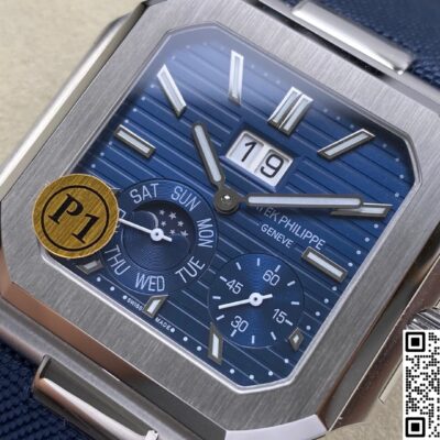 P1 Factory has made a replica of the square-cased CUBITUS 5822P-001 released by Patek Philippe in 2024. For the first time, regular watch lovers can experience an instant-jump big date complication at a fraction of the original price. The traditional round watch case has dominated the market for years. Suddenly, here comes this 45mm wide, horizontally stretched block with a platinum-like finish, yet its edges are softened by gentle curves. The P1 Factory Patek Philippe 5822 replica perfectly captures this unique vibe. From ten meters away, people can tell it’s not your usual sports watch.