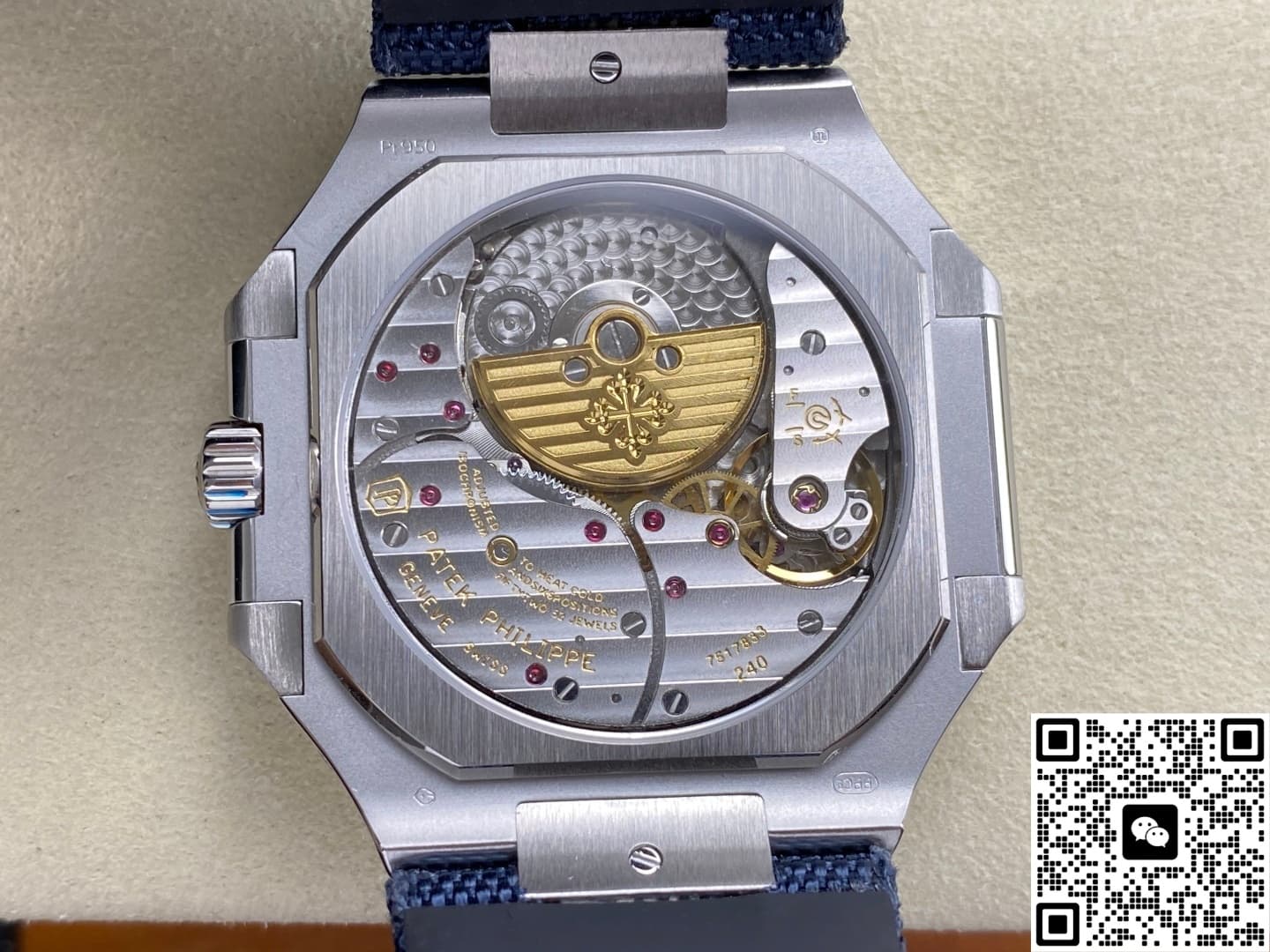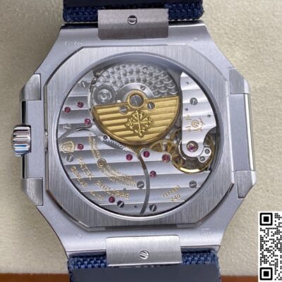 P1 Factory high-quality replica watch also polishes the places you can’t see. The inside of the lugs, the spring bar holes, and the hinge pins of the folding clasp are all rounded and polished to prevent pinching arm hair. The strap is made of composite fiber weaving, with subtle raised patterns on the surface, but the side against the wrist has heat-pressed dimples, improving both breathability and softness. The folding clasp is CNC-milled from a solid piece of 316L stainless steel, then plated with a platinum-like color, visually matching the case. The opening and closing action feels crisp and clicky. P1 Factory equips this watch with a 240-7PS super clone movement. They stripped down the base movement to just three layers: the main plate, the date module, and the automatic winding mechanism. The thickness is only 0.14mm more than the original. The automatic rotor is finished in a 22K gold tone, occupying only the upper third of the movement, leaving a large view of the Geneva stripes and perlage decoration. The winding efficiency is even higher than traditional steel rotors. When fully wound, it offers about 42 hours of power reserve. If you put it to your ear, the sound is fine and even, quiet enough not to disturb daily work or sleep.