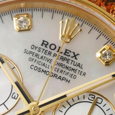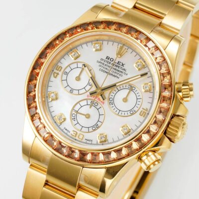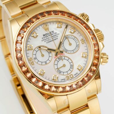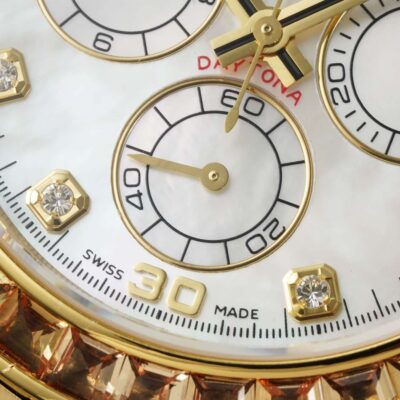 While the bracelet and bezel are all about luxury, the dial of this Daytona is mostly white, keeping things clean and simple. The Arabic numeral hour markers mixed with small square diamond indexes give it a nice designed feel. The gold numbers at 15, 30, and 45 are super clear, highlighting the main time points so it’s easier to track time. The little diamond hour markers add a touch of class and refinement. At 12 o’clock, there’s the small five-point crown logo—tiny but sharp, and you know it’s a Rolex right away.