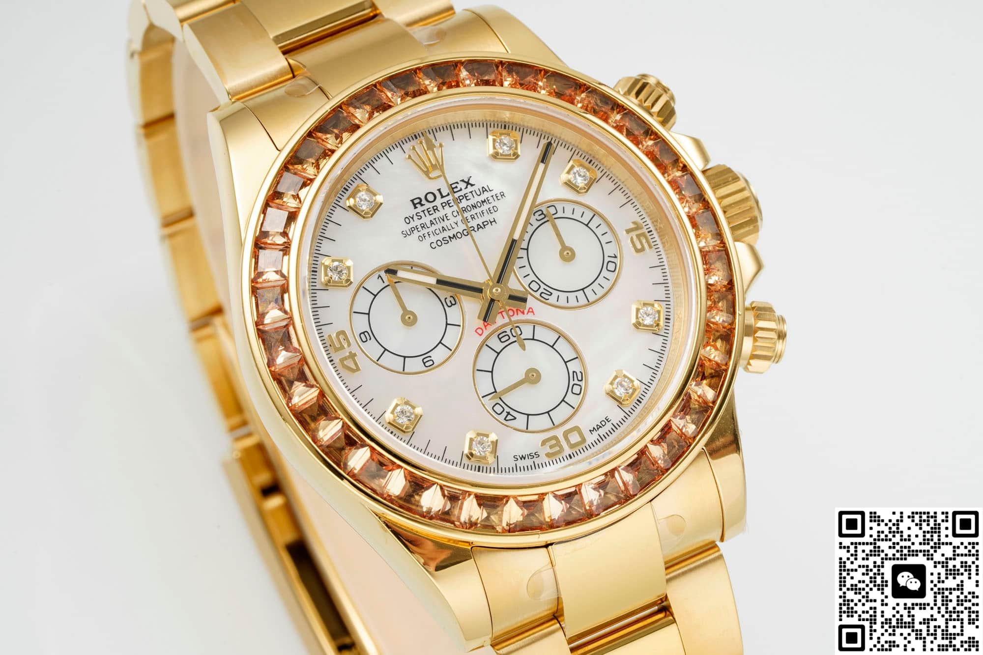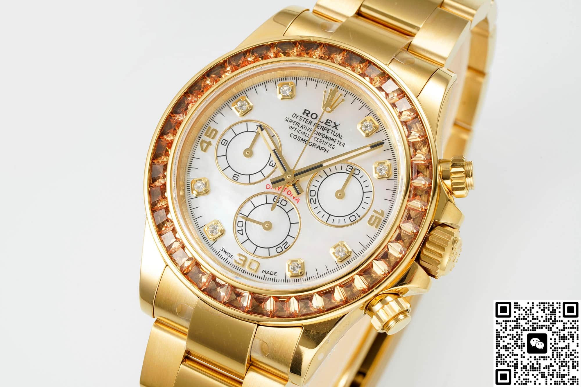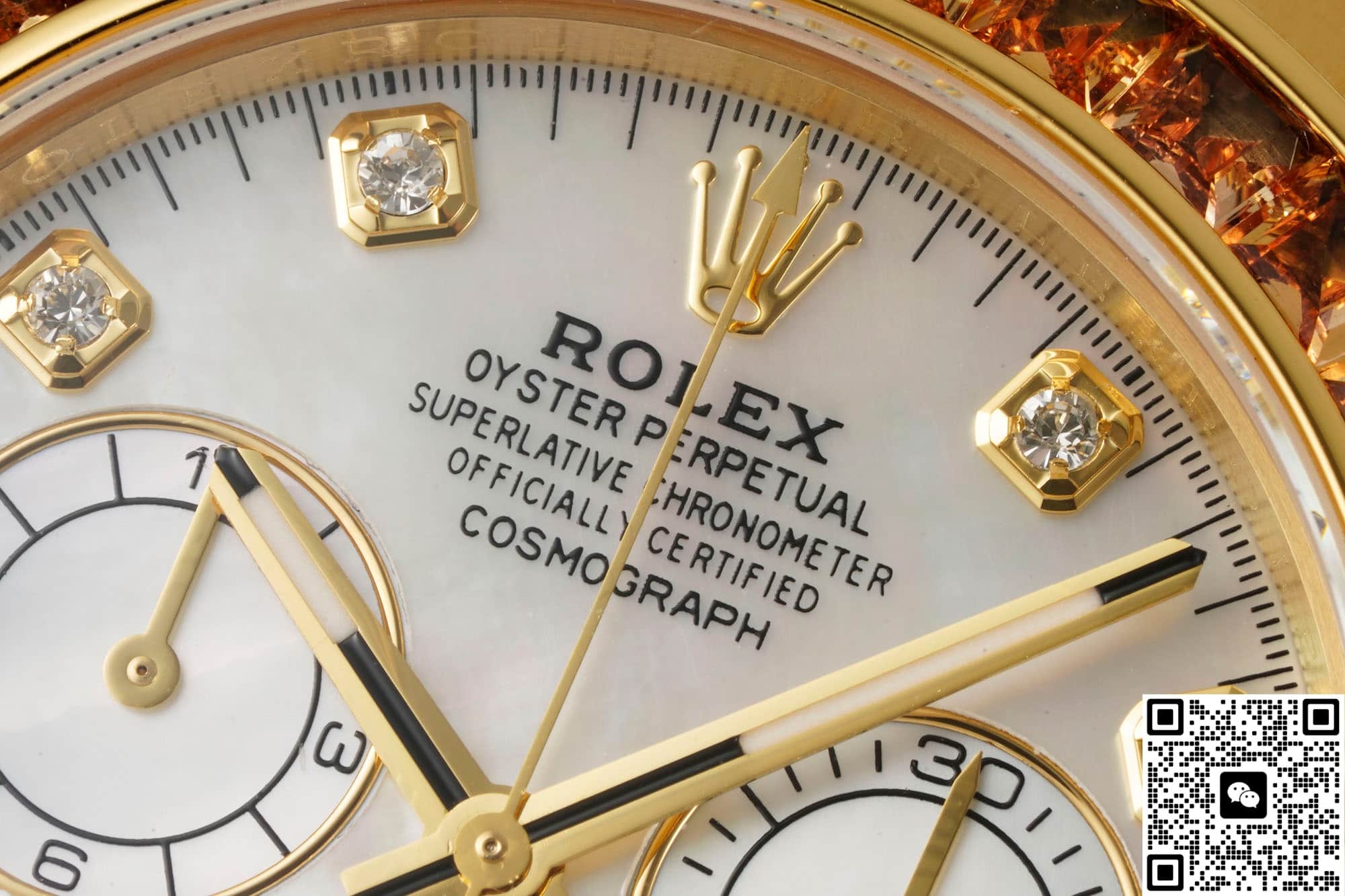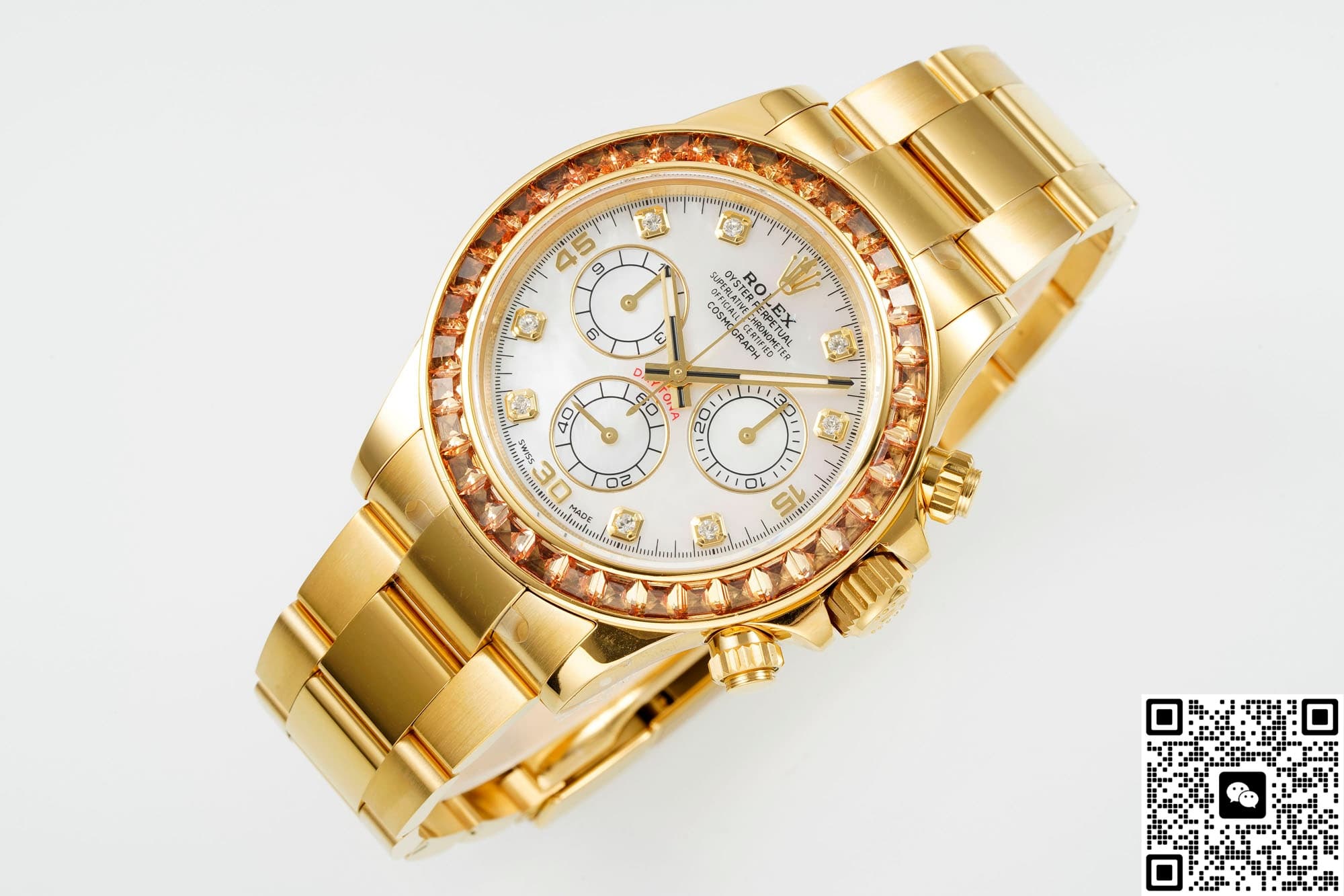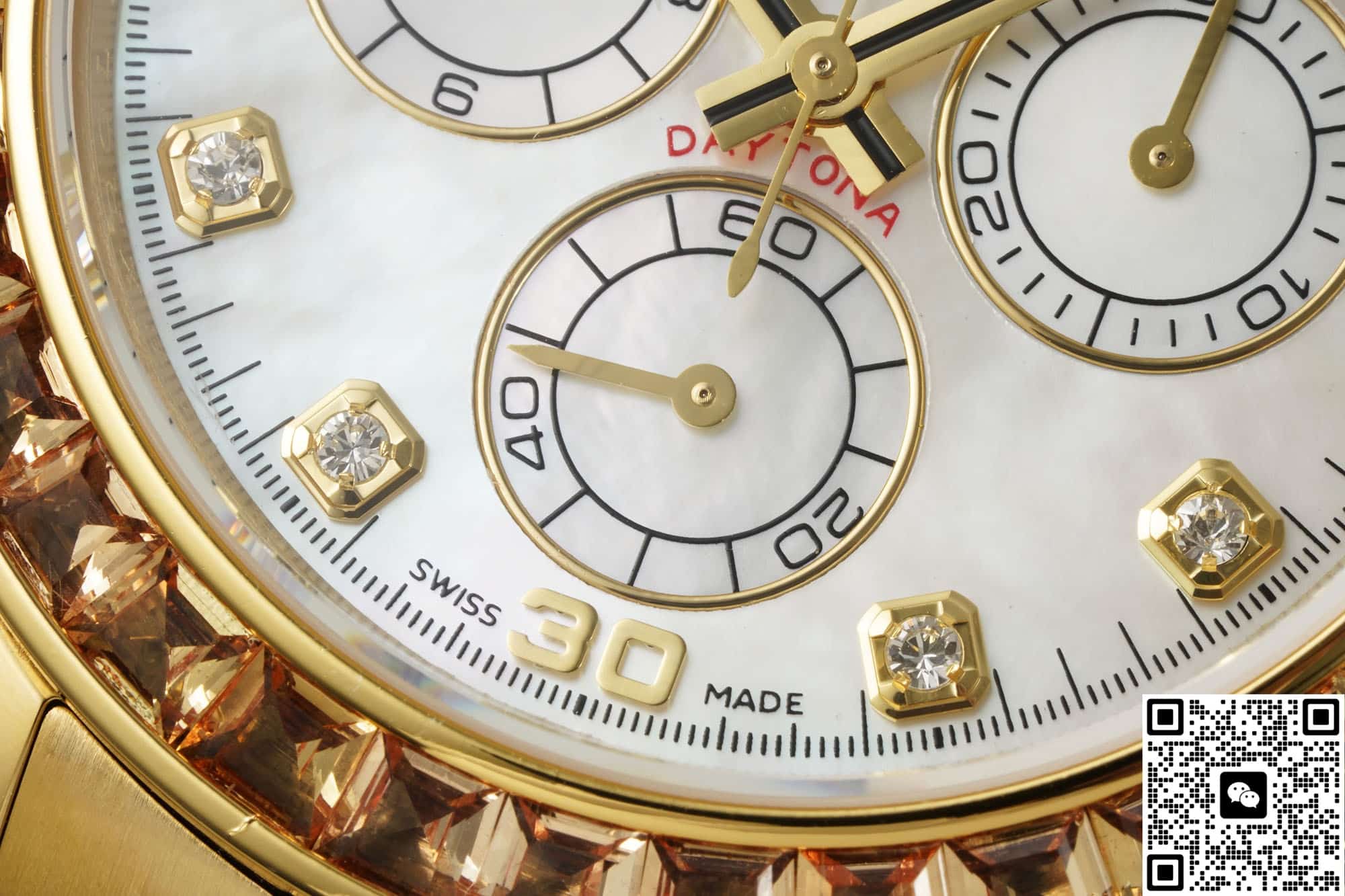 While the bracelet and bezel are all about luxury, the dial of this Daytona is mostly white, keeping things clean and simple. The Arabic numeral hour markers mixed with small square diamond indexes give it a nice designed feel. The gold numbers at 15, 30, and 45 are super clear, highlighting the main time points so it’s easier to track time. The little diamond hour markers add a touch of class and refinement. At 12 o’clock, there’s the small five-point crown logo—tiny but sharp, and you know it’s a Rolex right away.