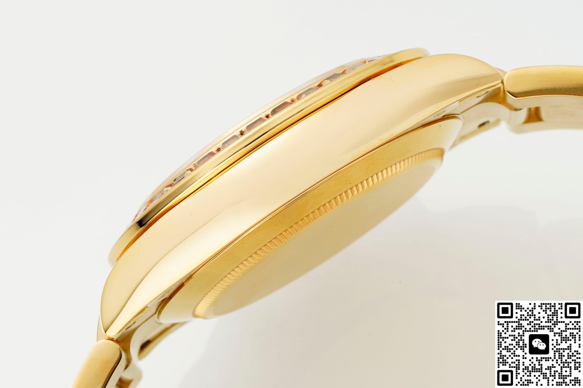 Next up is the PPM Factory custom modified Rolex Daytona Replica Watch, reference 116578SACO. Honestly, the first time I got it in my hands, I was completely amazed by its luxurious and detailed look. The gold bracelet and case look really bold and full of presence. The diamond-covered bezel shines with a brilliant sparkle in different lights—it’s so rich and eye-catching. I think wearing a watch like this, it’s pretty hard not to be noticed. It’s perfect for parties or formal events, really makes you stand out and boosts your whole vibe.