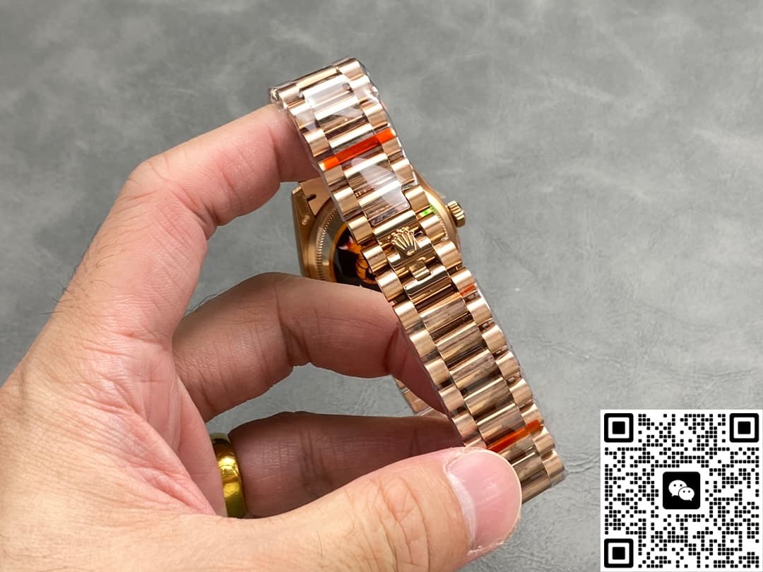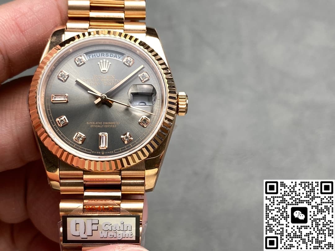What’s it like to wear rose gold on your wrist? The answer usually has little to do with price, and everything to do with the vibe. The QF Factory Rolex Day-Date m128235-0050 replica watch pretty much sets the bar in its price range when it comes to that vibe. It packs the glow of precious metal, the sparkle of diamonds, the magnified effect of the cyclops lens, and the smoothness of the President bracelet—all into a 36mm case. For fans of the Rolex Day-Date style, it means you can get the same look and feel without paying even 10% of the genuine price.