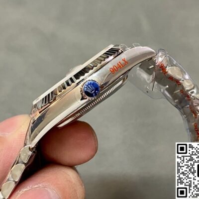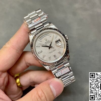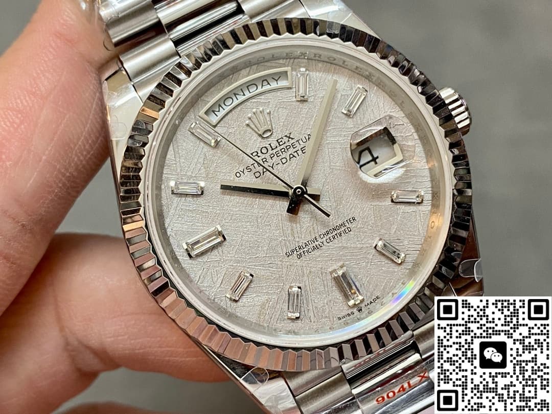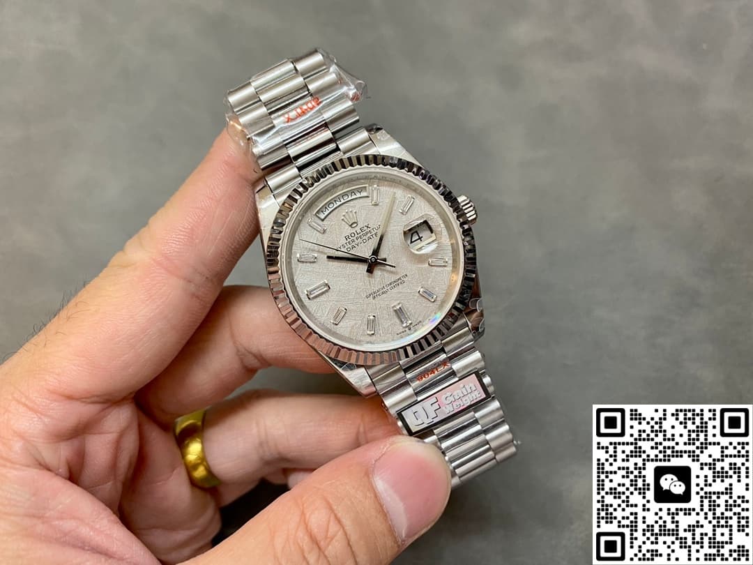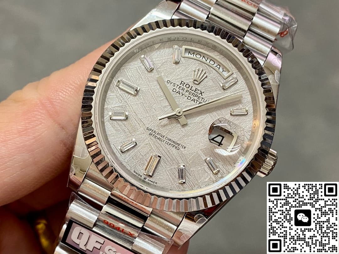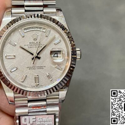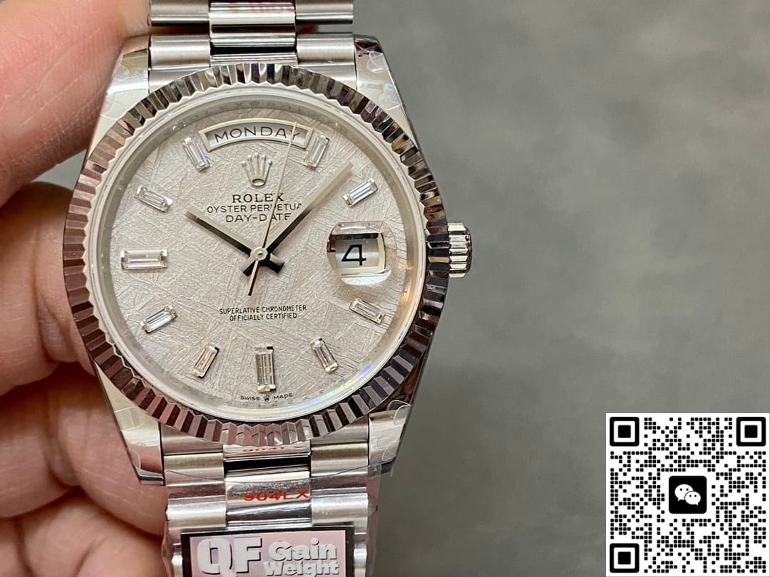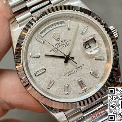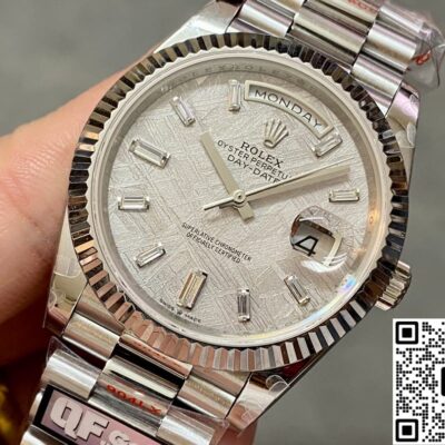 In the replica market, not many clone watches can pack both the luxury metal shine and meteorite texture into an entry-level price. The QF Factory Rolex Day-Date M228239-0055 replica watch is one of the most talked-about models. Just with its meteorite dial’s natural pattern and the cool luster from the 904L steel plated with white gold, it already wins over many enthusiasts. At first glance, the silver-gray Widmanstätten lines, paired with diamond hour markers, show a subtle metallic fluidity. Combined with the arched President bracelet, the whole watch gives off a vibe that’s steady but still bold. It can both anchor a suit cuff in business settings and flash some personality with a casual shirt. This ability to fit in anywhere is its most charming introduction.