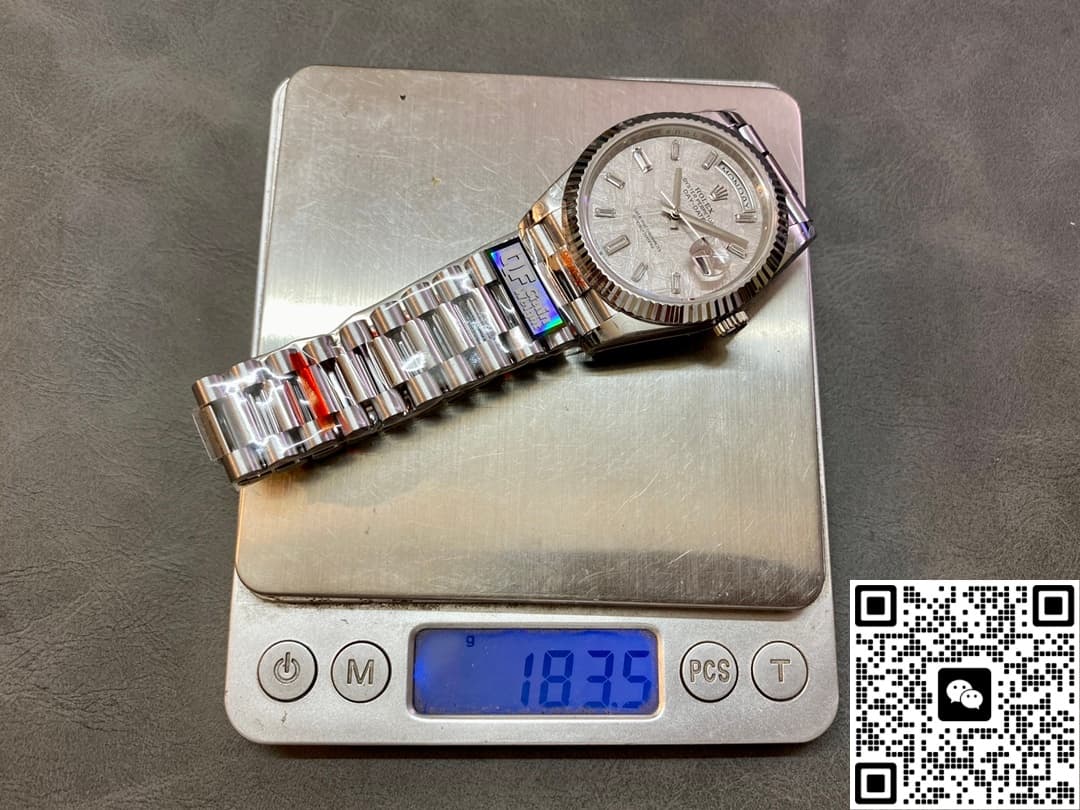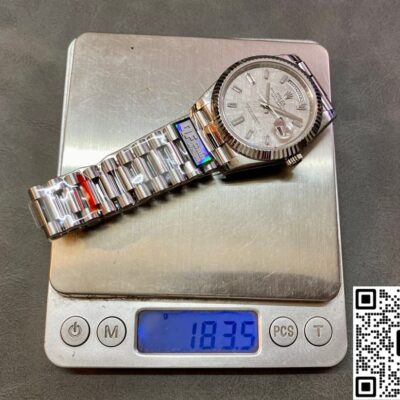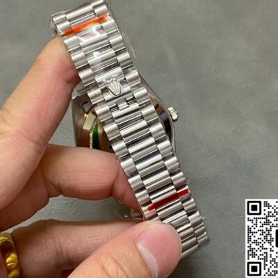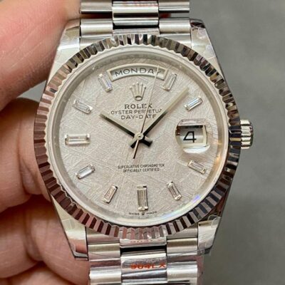 The genuine white gold meteorite dial version costs hundreds of thousands, and meteorite material is getting rarer, with very limited supply. In the secondary market, it’s often hard to find. But the QF Factory Rolex Day-Date replica watch lets you experience the visual impact and weight of meteorite and white gold at an affordable price. Even if you might upgrade to a genuine piece in the future, wearing this first helps you confirm whether you really like the style—so you avoid spending blindly. For those who want low-key but still recognizable wrist presence, this cool, confident look hits the spot. Without a huge cost, you can lock millions of years of history and a cool metallic glow on your wrist. It’s very tempting.