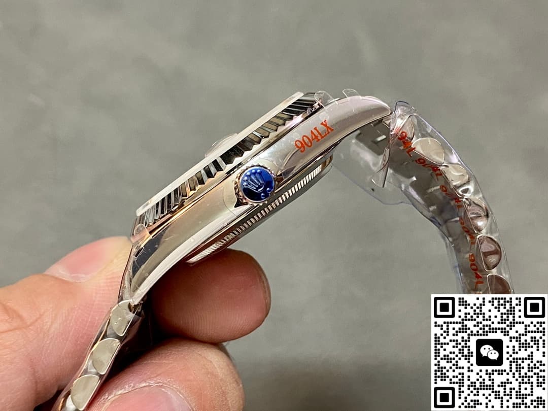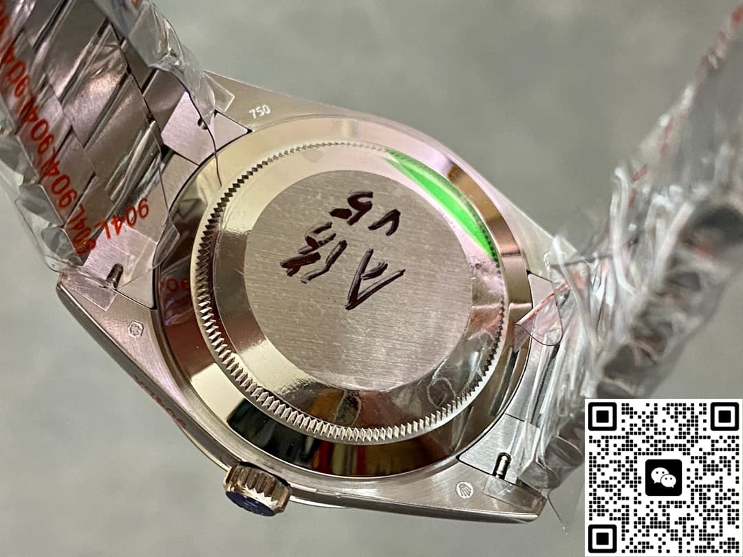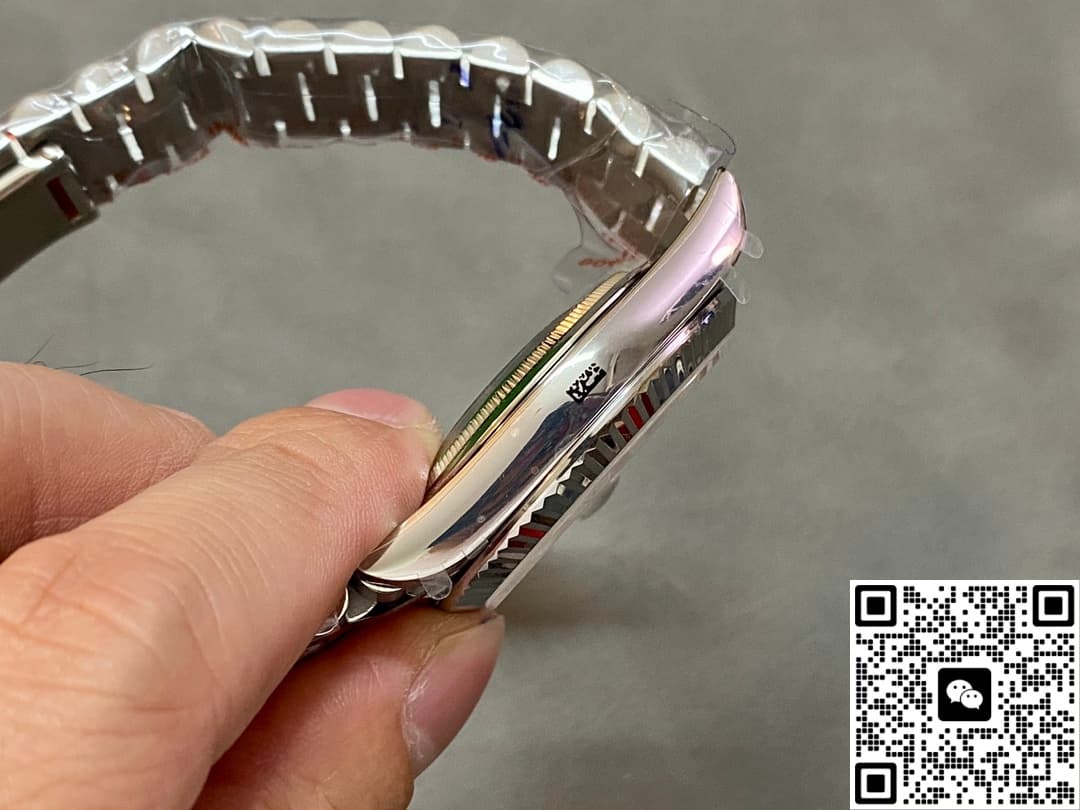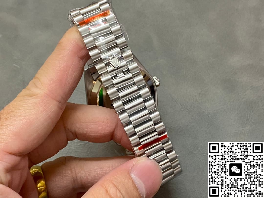 For the case and bracelet, QF Factory insists on using full 904L steel. This type of steel has higher nickel and molybdenum content and was originally used in corrosive industrial environments. In daily wear, it stays clean against sweat, seawater, or rain, without the rust spots common in traditional 316L steel. To achieve a visual temperature close to the genuine white gold version, QF Factory applies a 0.3‑micron white‑gold‑colored hard coating in a vacuum chamber using physical vapor deposition. From the side, it shows a cool silvery shine; from the front, it gives off a soft glow depending on the light. This creates a gradient from light to dark alongside the muted silver-gray of the meteorite dial, making the whole watch rich in layers. What’s even more impressive is that QF Factory added weight adjustment to this three-piece arched President bracelet. The total watch weight is around 183 grams, so the moment you put it on, you feel a solid, weighted presence on the wrist—completely avoiding the lightweight impression common in replicas. It gives the wearer a heft feedback similar to the precious metal version with every movement.